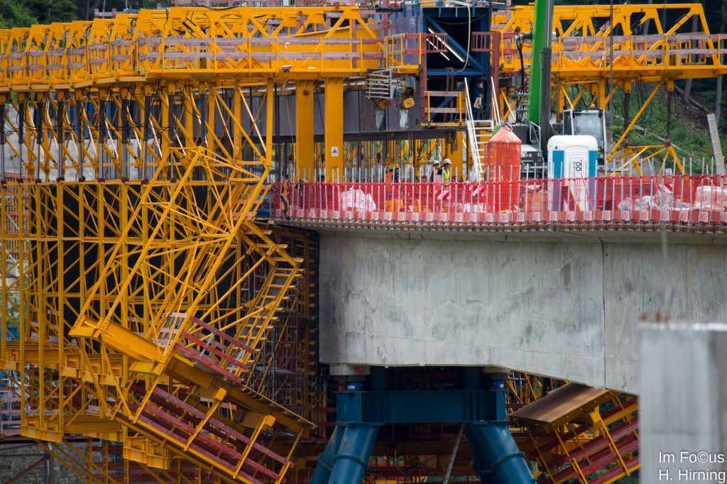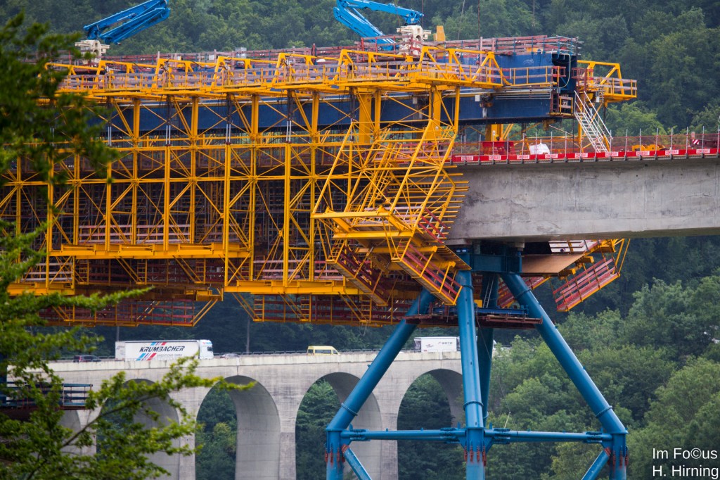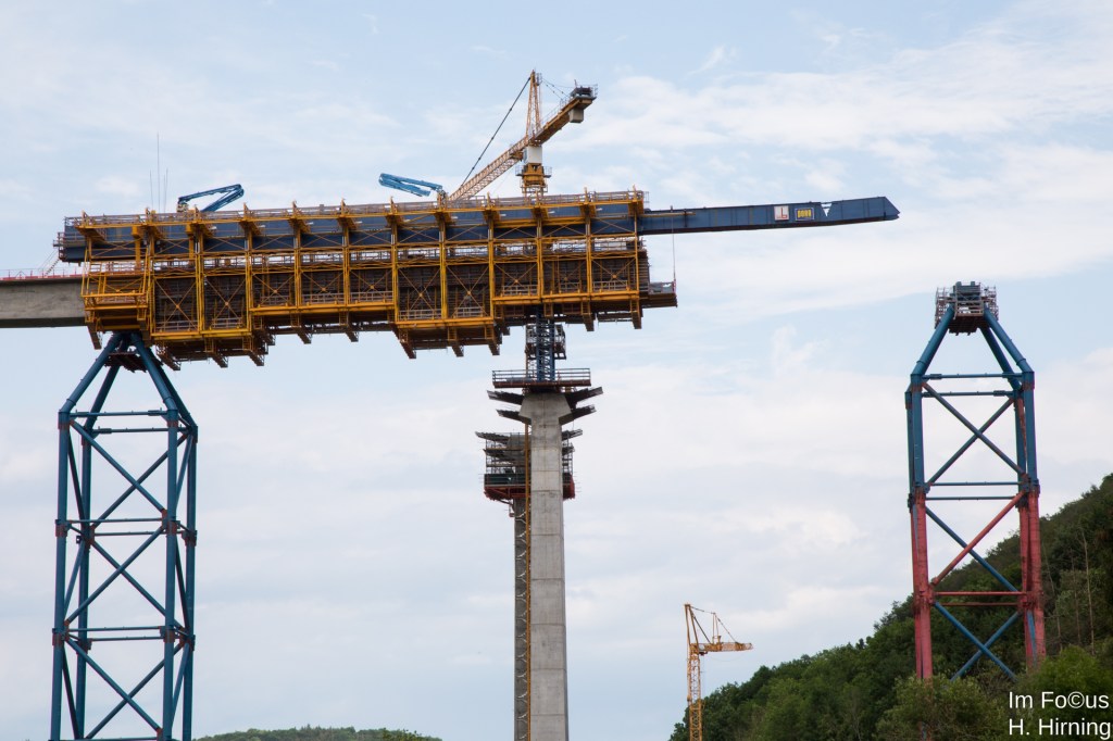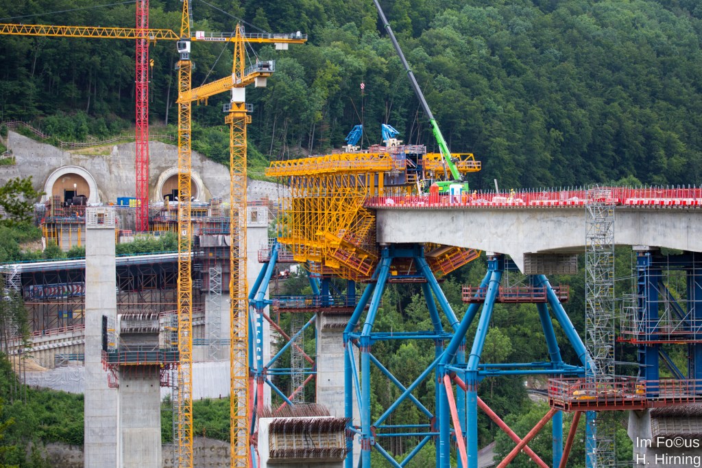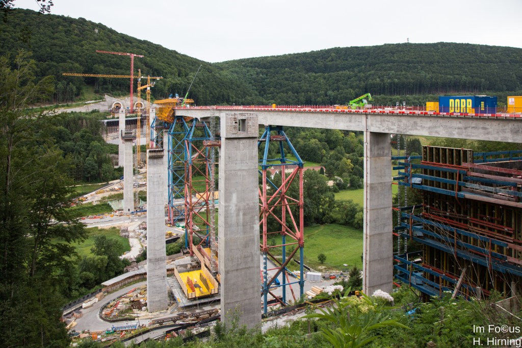 Zum Bau der Brücke werden benötigt: 55.000 t Beton, 7.700 t Stahl sowie 800 t Spannstahl und das alles für 53 Millionen €. Nach Fertigstelung sollen die Züge mit 250 km/h über die Brücke donnern.