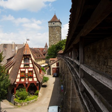 Doch Rothenburg besucht man ja nicht wegen der Kneipen, und in der Tat, die mittelalterliche Szenerie ist einzigartig. Deshalb gehört ein Rundgang auf der vollständig erhaltenen Stadtmauer auch zum Pflichtprogramm. Vom Wehrgang aus hat man immer wieder herrliche Blicke auf die Stadt.