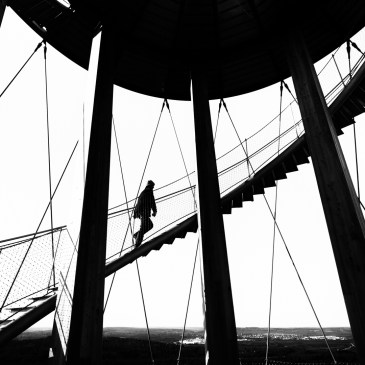 Der Schönbuchturm steht auf dem 580 m hohen Stellberg bei Herrenberg. Die Tragekonstruktion des absolut gelungene Bauwerks ist aus verleimtem Lärchenholz gefertigt. Daran aufgehängt sind die beiden Wendeltreppen aus Stahl, welche mit jeweils 174 Stufen die 35 m Höhe bis zur dritten Aussichtsplattform überwinden. Von dort oben genießt man eine fantastische Aussicht vom Schwarzwald bis zur Schwäbischen Alb. (Zum Vergrößern anklicken.)