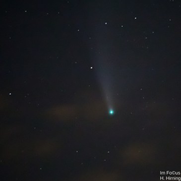 Näher geht es nun wirklich nicht. Mit 105 Mio. km ist der Komet Neowise der Erde gerade am nächsten. Bei meinem ersten Versuch, den Kometen abzulichten, war ich an der hartnäckigen Bewölkung gescheitert. Deshalb blieb ich gestern gleich zu Hause. Am späteren Abend stellte ich dann zu meiner Überraschung fest, dass sich die Wolken bereits weitgehend aufgelöst hatten. Kurz entschlossen baute ich mein Stativ auf dem Balkon auf. Inzwischen wusste ich genau, wo ich nach dem Kometen suchen musste. Ihn gegenwärtig zu orten, ist gar nicht so einfach, denn die beste Zeit, um Neowise zu beobachten, ist bereits vorbei. Mit bloßem Auge ist dieses diffuse Objekt mehr zu erahnen als zu erkennen. Doch nochmals 7000 Jahre warten wollte ich dann doch nicht.