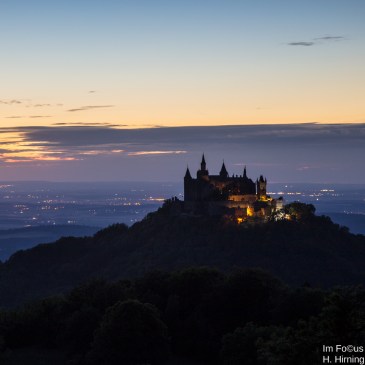 Schon länger hatte ich mir überlegt, welches markante Bauwerk in meiner Umgebung sich für eine Aufnahme mit dem Kometen Neowise eignen würde. Es musste nicht nur bekannt sein und exponiert liegen, sondern es musste auch aus großer Entfernung einsehbar sein, um es zusammen mit Neowise scharf ablichten zu können und der Beobachtungspunkt sollte auch einigermaßen gut erreichbar sein. Da kam für mich nur der Hohenzollern in Betracht. Seit Neowise abends beobachtbar ist, liegt die Burg vom Zeller Horn aus exakt auf Linie mit dem Kometen. Das hatte ich bei einer Vorexkursion mit Karte und Kompass genau ermittelt. Vom Parkplatz aus erreicht man den Aussichtspunkt am Albtrauf zu Fuß in einer halben Stunde und der Weg ist so gut, dass man ihn auch bei Nacht problemlos gehen kann. Noch vor Sonnenuntergang war ich vor Ort, so dass ich den optimalen Standort noch bei Tageslicht aufsuchen konnte. Doch am Ende kommt es auch beim Fotografieren oft anders als gedacht.