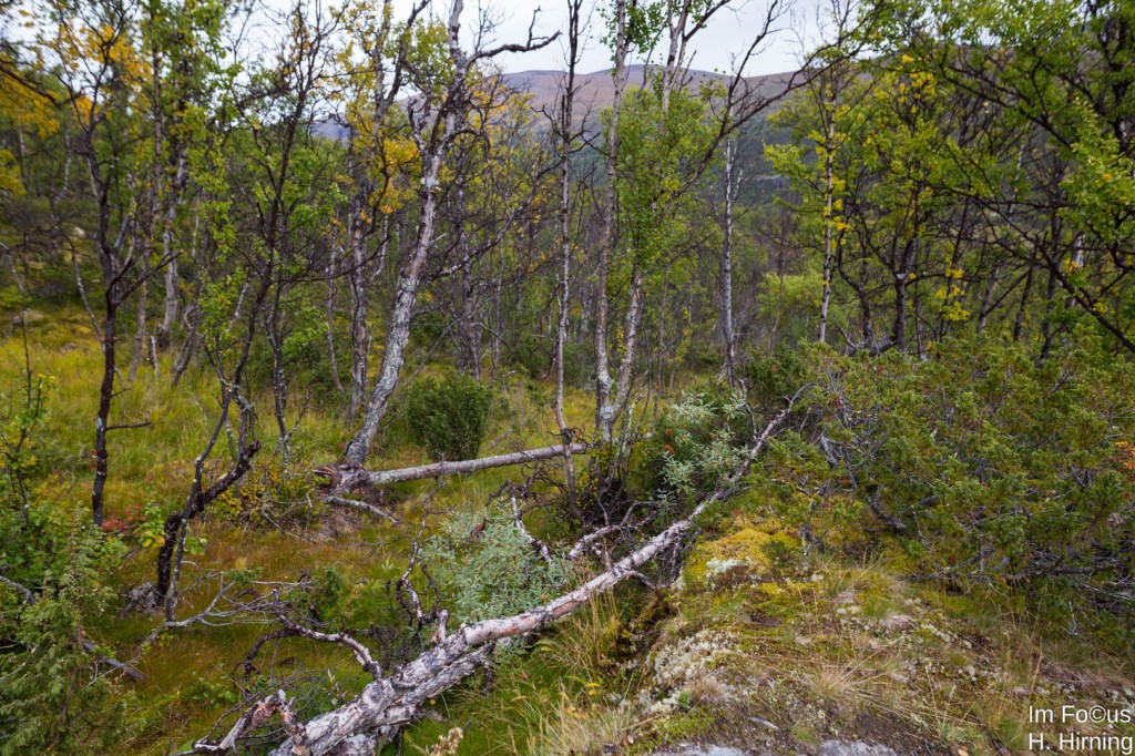 Möglicher Ausgangspunkt für eine Tour zu den zotteligen Relikten der Eiszeit ist die Kongsvold Fjellstue auf der Passhöhe der E6 im Dovrefjell. Dort beginnt der markierte Moschusochsen Trail hinauf ins Fjell, wo in den 1940 Jahren die Wiederansiedlung grönländischer Tiere gelang. Wir hatten auf einem Rastplatz in der Nähe übernachtet, damit ich gleich morgens in der Frühe losziehen konnte. Nach einer knappen Stunde Aufstieg durch lichten Birkenwald erreichte ich bei stark bewölktem Himmel und gelegentlichen Regenschauern die mit arktischer Tundra bedeckte Hochfläche in der diese urzeitlichen Gesellen leben sollen.