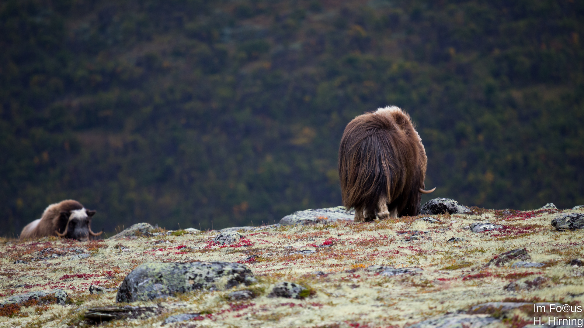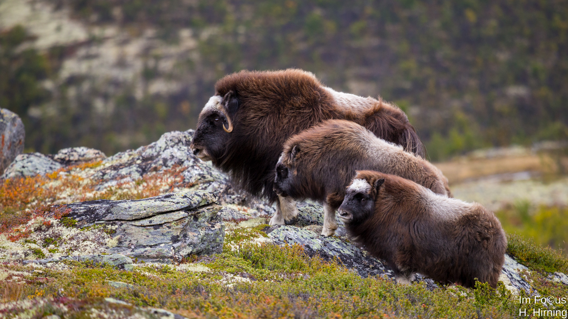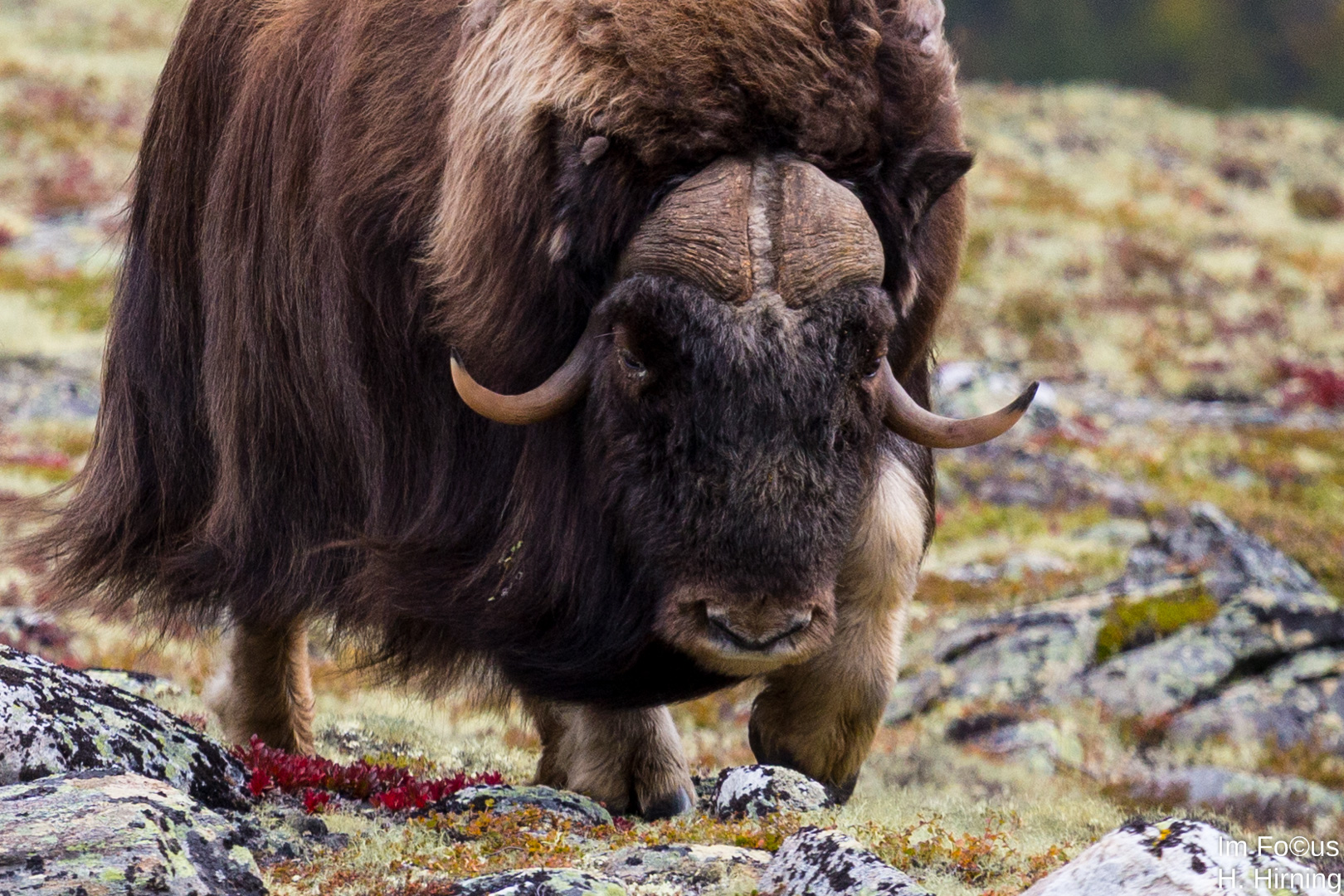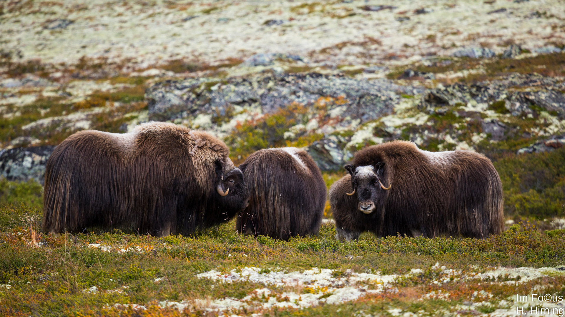 Um diese Aufnahmen zu machen, hielt ich mich mehrere Stunden in der Nähe der Tiere auf. Mit der Zeit konnte ich die Distanz von 200 auf 80 Meter verringern. Bei den Moschusochsen im Dovrefjell handelt es sich um die einzige freilebende Herde in Europa. Sie besteht aus ca. 300 Tieren. Vor einigen Jahren hat sich ein Bulle mit zwei Kühen nach Schweden abgesetzt und dort eine kleine Herde begründet.