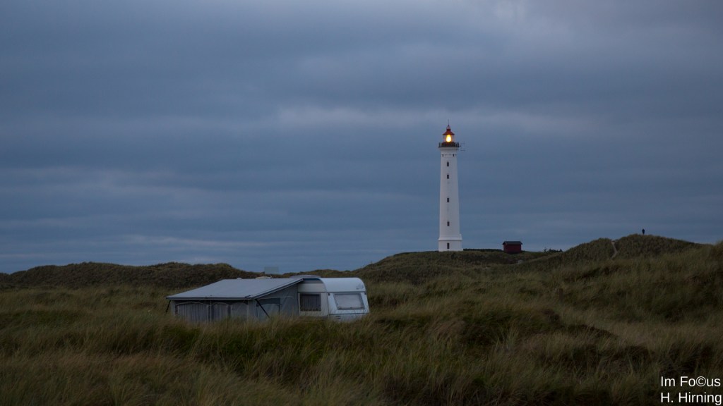 Auf der Nehrung Holmsland Klit liegt mittig das Fischerdorf Hvide Sande mit seinem markanten Leuchtturm.
