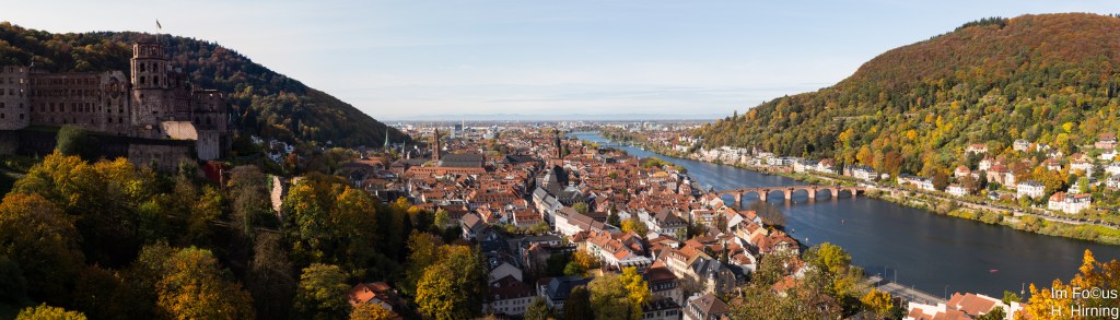 Die schönste Aussicht auf Heidelberg genießt man von der Scheffelterrasse. Von hier aus schweift der Blick vom Schloss über die Altstadt und den Neckar hinüber zum Odenwald. Der Neckar durchbricht hier in einer regelrechten Pforte die letzten Berge des Odenwalds und strömt hinaus in die Oberrheinische Tiefebene, seinem Ende entgegen. Am Horizont erkennt man die Berge des Pfälzer Waldes, welche die Rheinebene im Westen begrenzen.