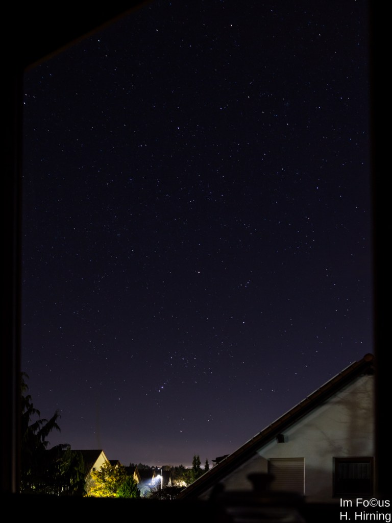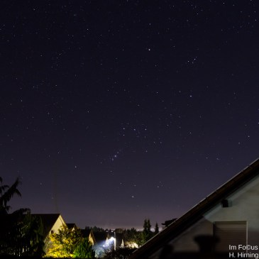 Nachdem der Vollmond untergegangen ist, grüßt Orion beim morgendlichen Blick durchs Fenster. Im Westen zeigt er sich dicht überm Horizont in voller Pracht. Der Winter ist da!
