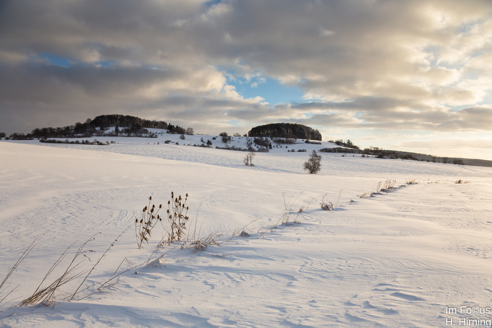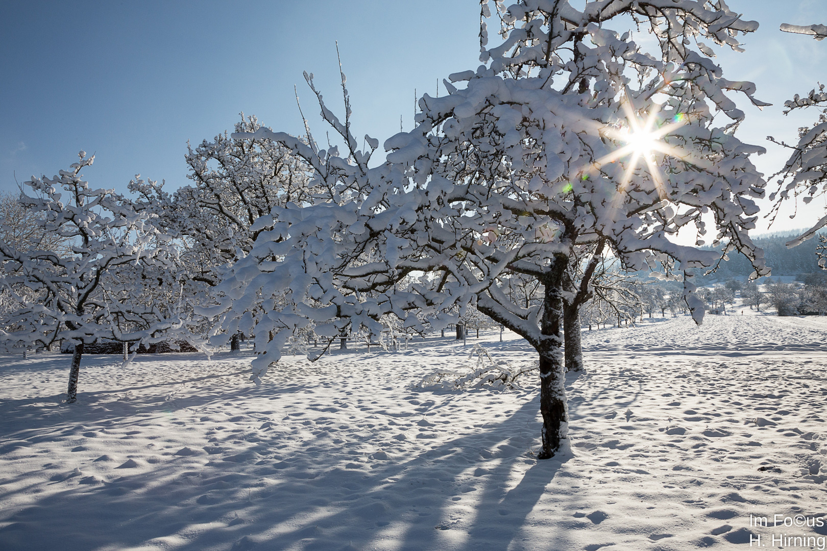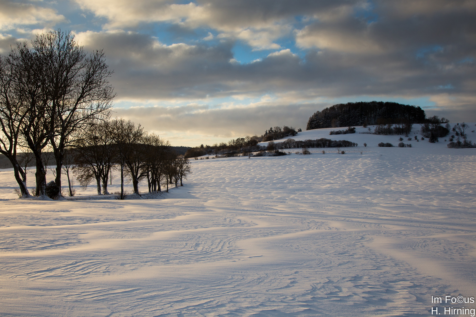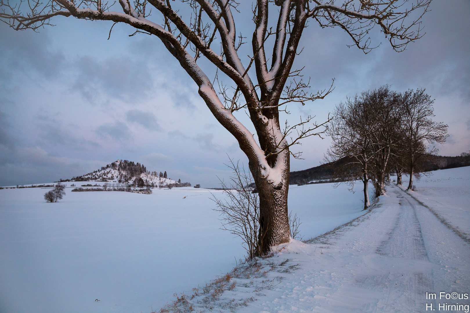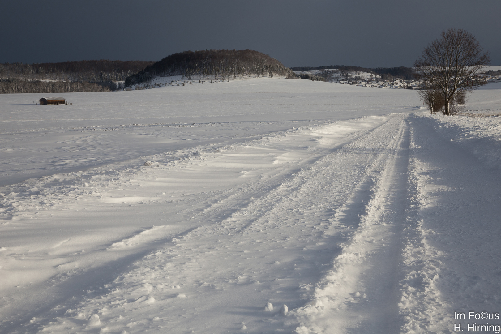 Bei der Anfahrt war es noch dunkel, als ich diese Nebenstraße passierte. Dies ist der Zustand bei der Rückfahrt zwei Stunden später. Man kann sich ausmalen wie die Bedingungen vor 50 Jahren gewesen sein müssen, als auf der Alb nicht nur 30, sondern hundert Zentimeter Schnee üblich waren.