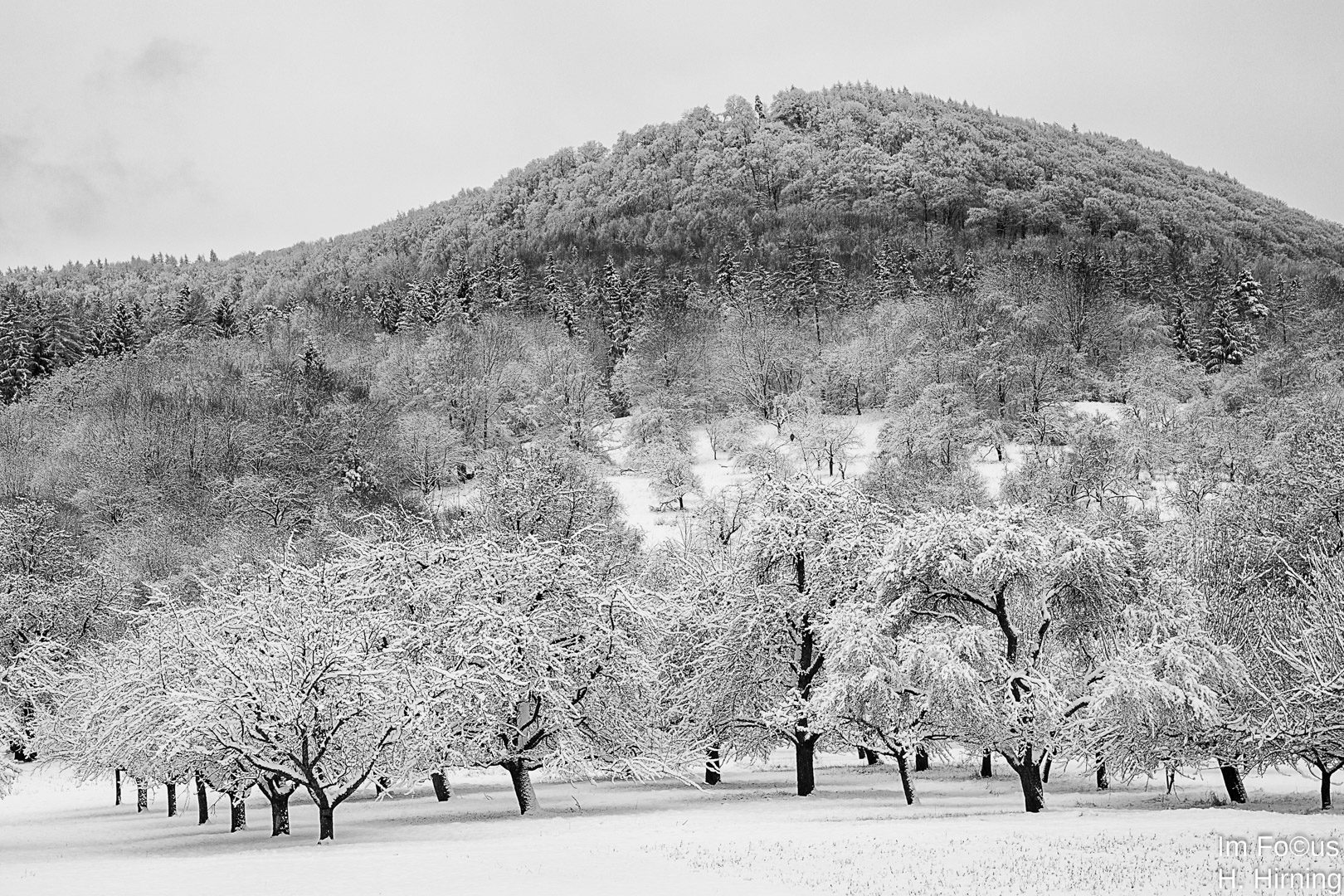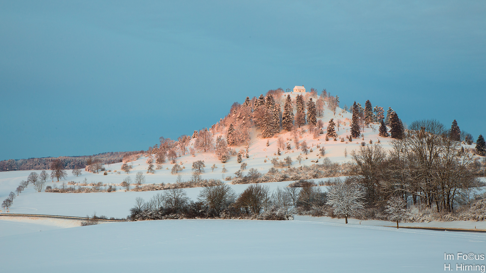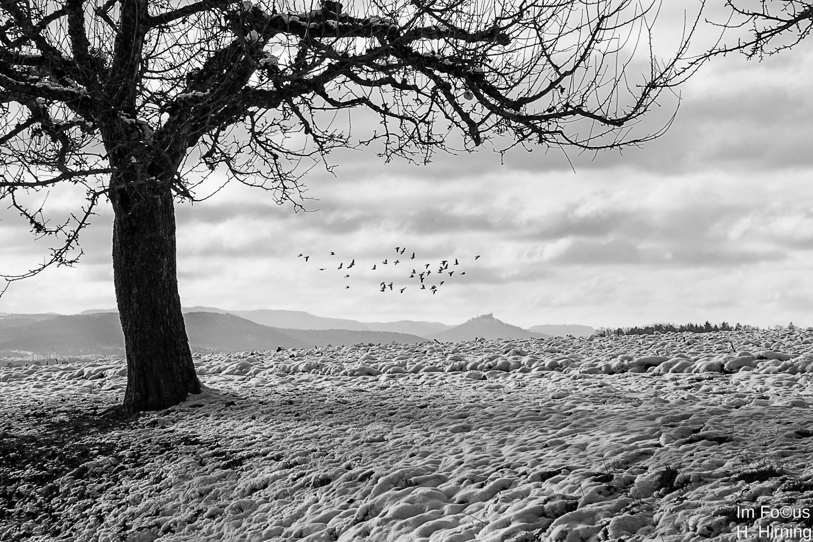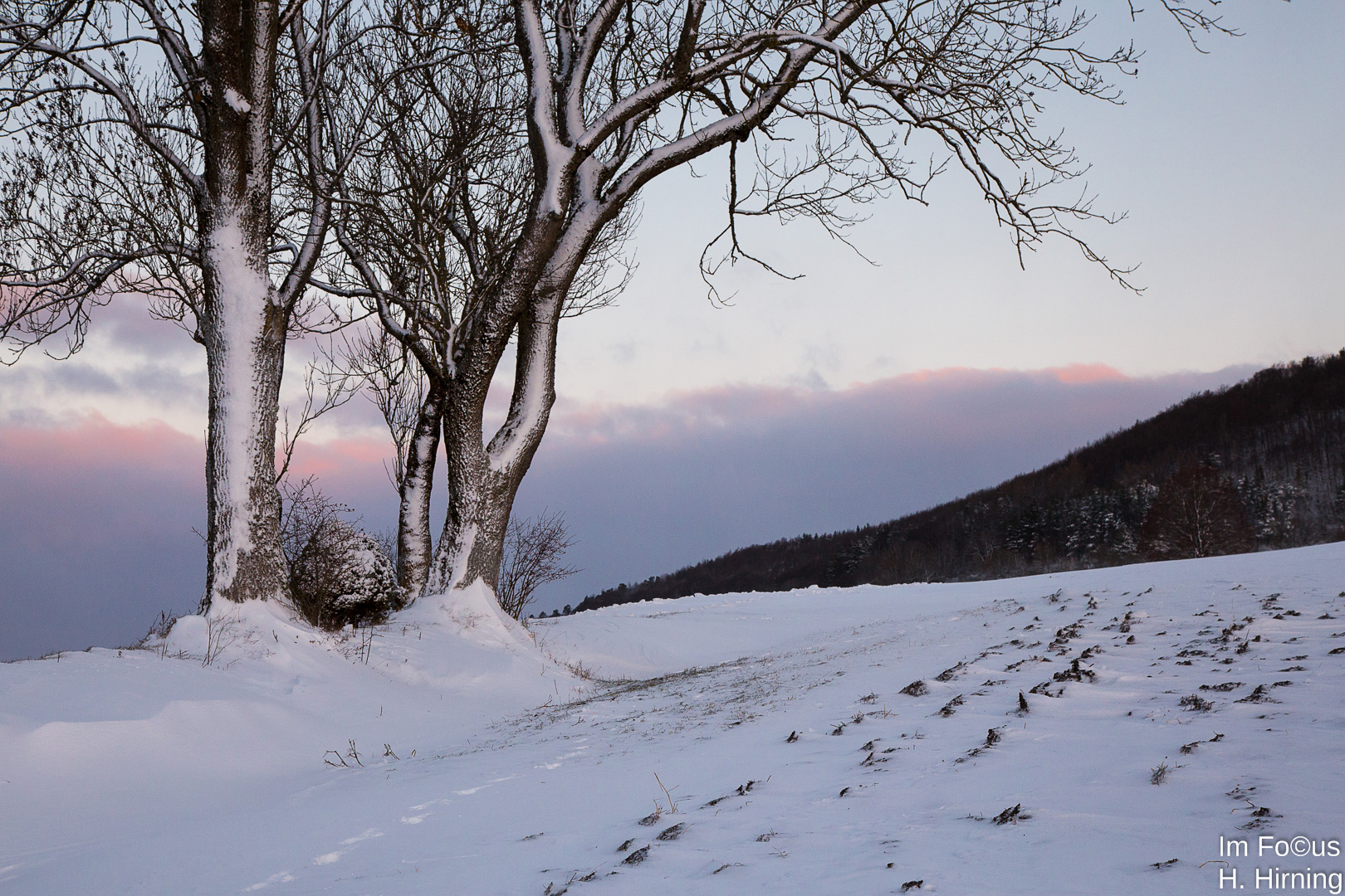 Bei der Anfahrt war es noch dunkel, als ich diese Nebenstraße passierte. Dies ist der Zustand bei der Rückfahrt zwei Stunden später. Man kann sich ausmalen wie die Bedingungen vor 50 Jahren gewesen sein müssen, als auf der Alb nicht nur 30, sondern hundert Zentimeter Schnee üblich waren.