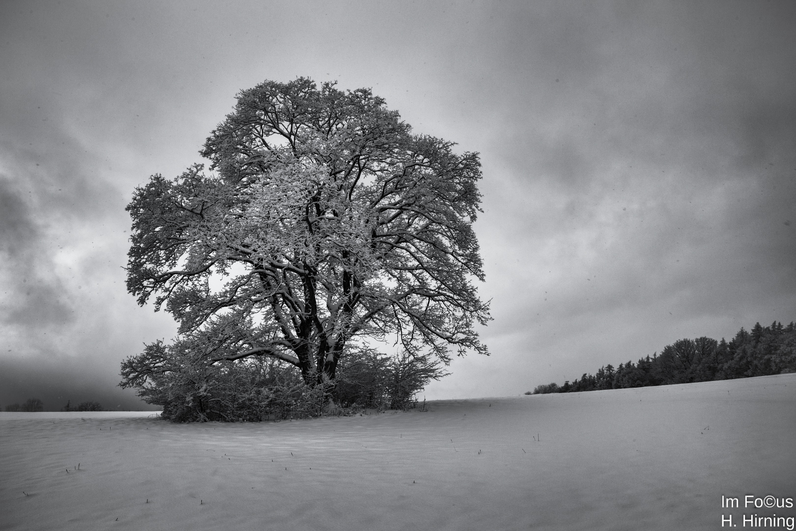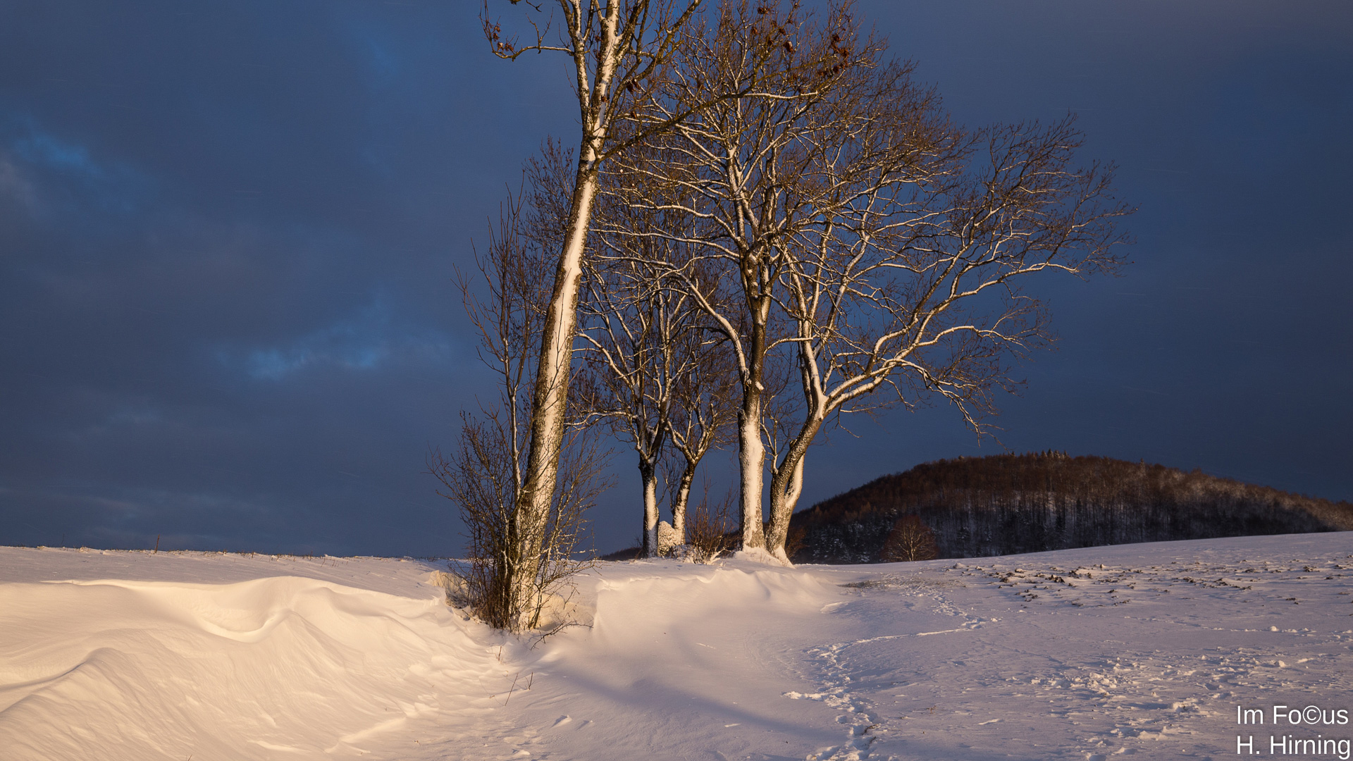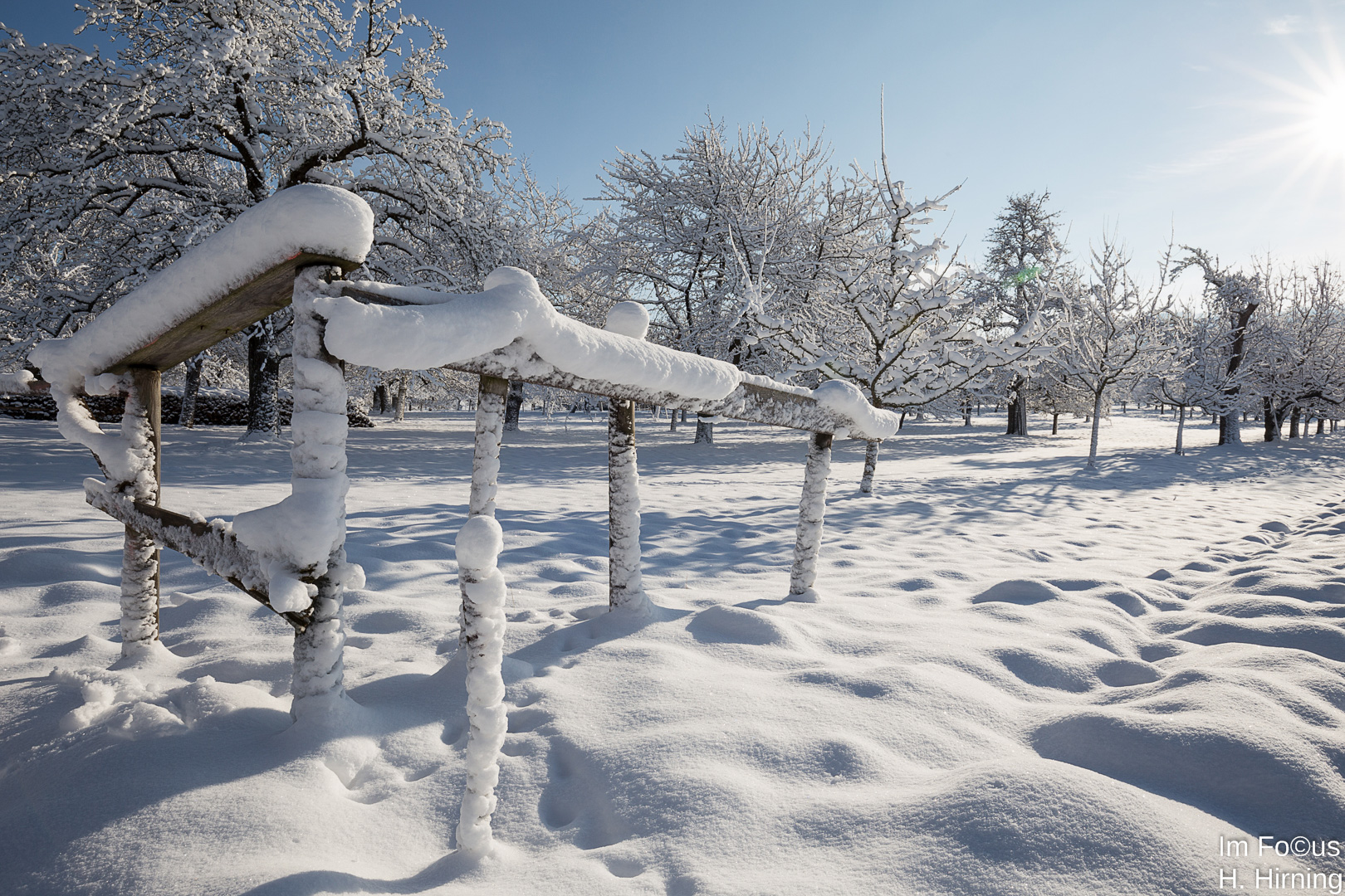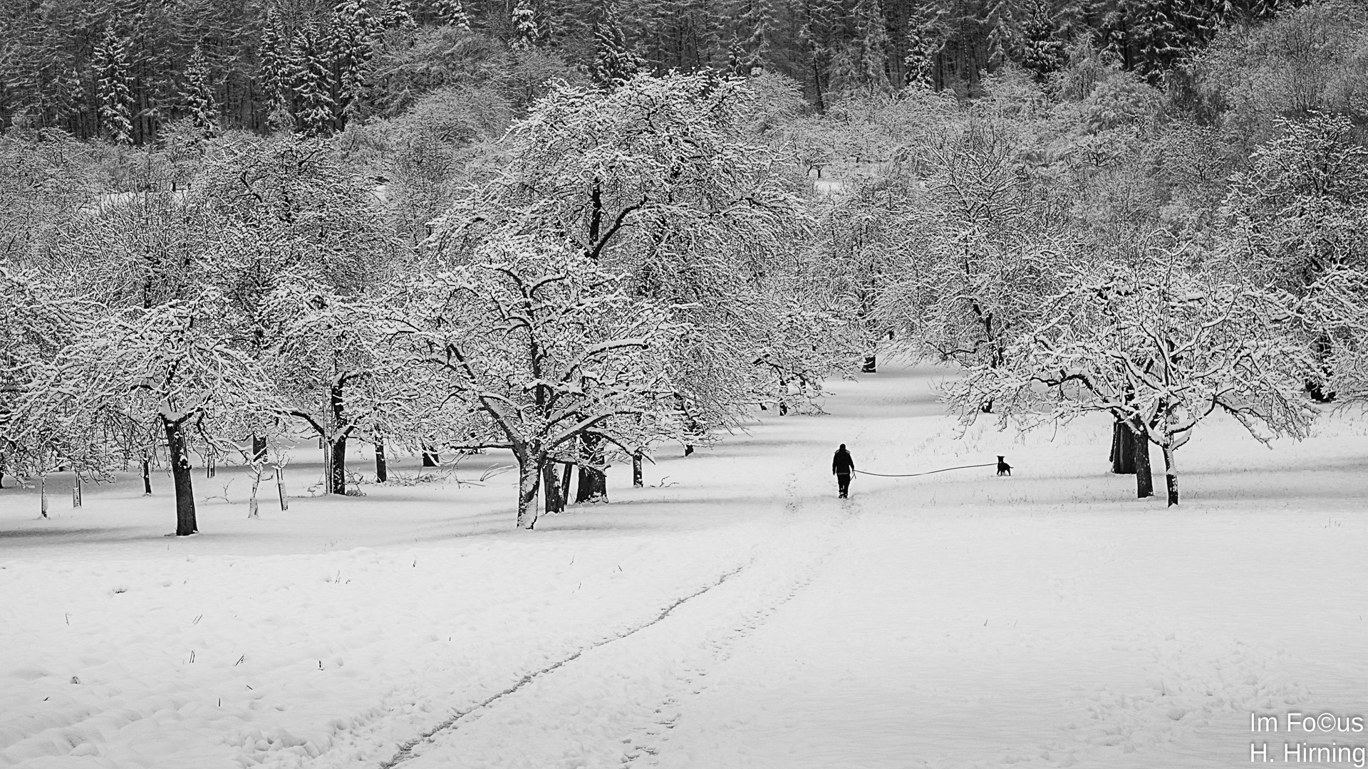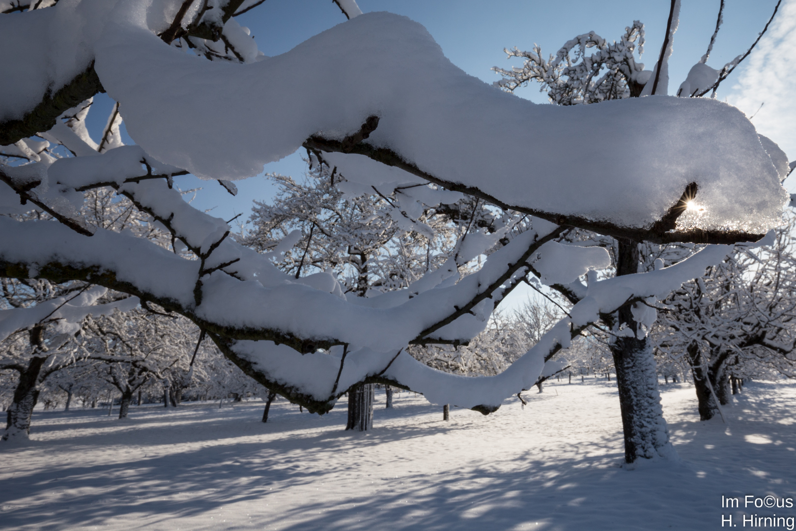 Bei der Anfahrt war es noch dunkel, als ich diese Nebenstraße passierte. Dies ist der Zustand bei der Rückfahrt zwei Stunden später. Man kann sich ausmalen wie die Bedingungen vor 50 Jahren gewesen sein müssen, als auf der Alb nicht nur 30, sondern hundert Zentimeter Schnee üblich waren.