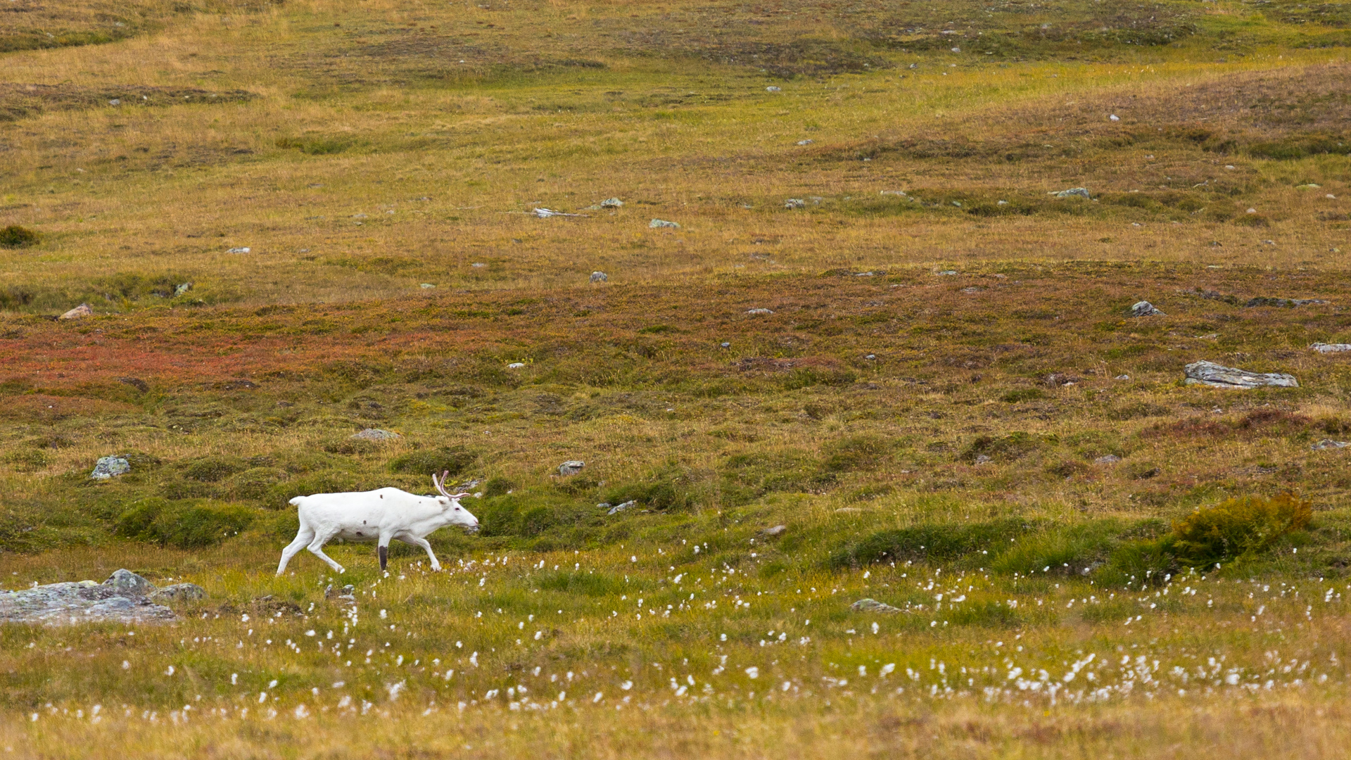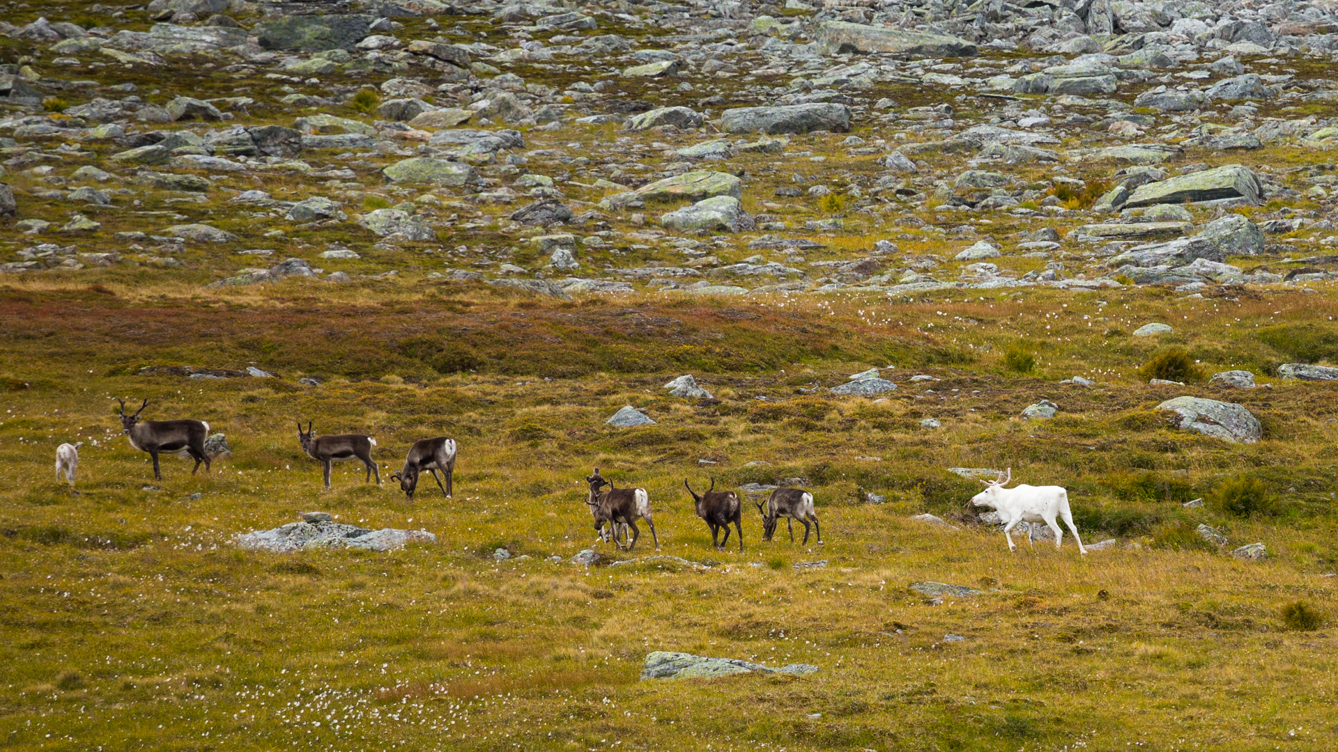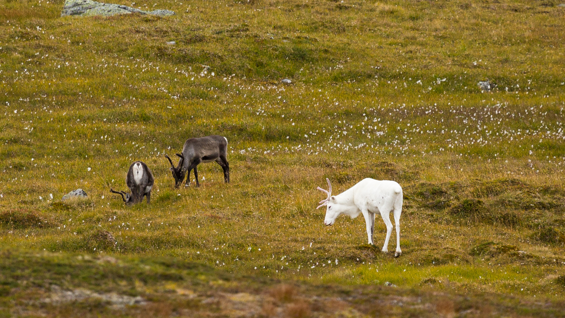 Die Passhöhe auf 876 m Höhe ist ein idealer Ausgangspunkt für größere und kleinere Touren durch wegloses Gelände. Als ich eine Herde Rentiere erblickte, zu der auch ein weißes Ren gehörte, war meine Tour klar. Ich folgte erst einmal für gut eine Stunde dieser Herde, in der Hoffnung, nahe genug heranzukommen, um ein ordentliches Bild machen zu können, denn weiße Rentiere sieht man ja nicht alle Tage. Doch die Rentiere leben hier oben den ganzen Sommer über völlig frei und als Fluchttiere achten sie peinlich auf den nötigen Abstand. So gelangen mir lediglich einige Belegfotos.