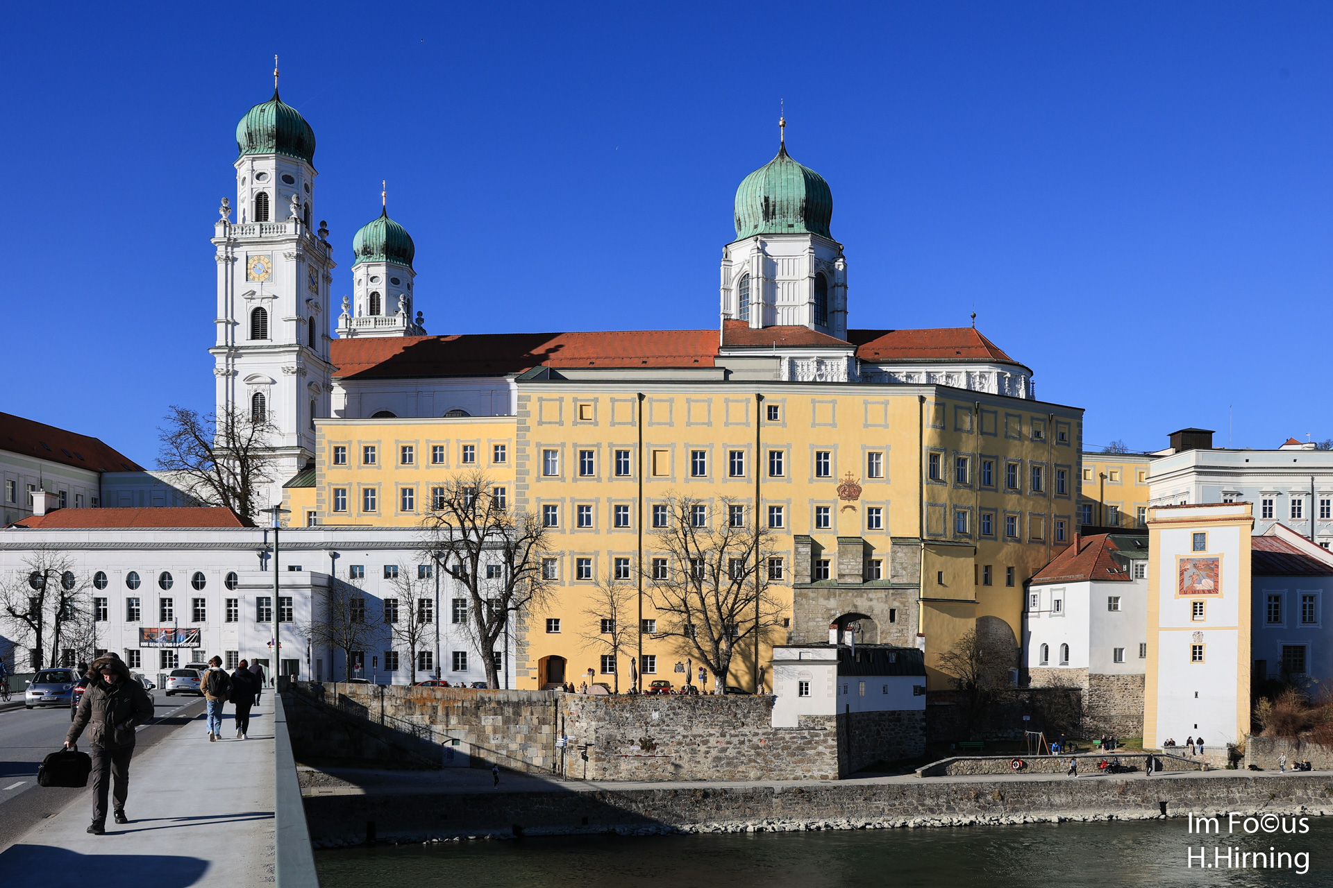 Die Altstadt Passaus wurde in strategisch herausragender Lage auf einer schmalen Halbinsel zwischen Inn und Donau errichtet. Kommt man von Süden über die Marienbrücke, die den Inn überspannt, in die Stadt, hat man diesen prächtigen Blick auf die alte Residenz und den Dom St. Stephan.