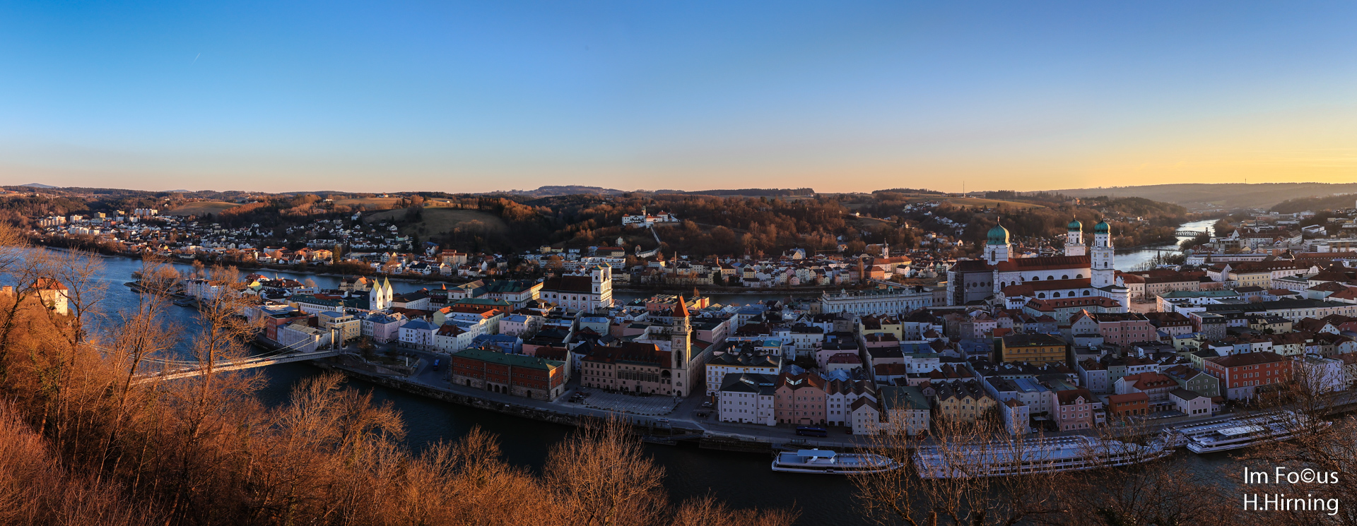 Im Panorama ist die Lage Passaus auf der schmalen Landzunge zwischen Inn und der Donau im Vordergrund besonders gut zu erkennen. (Vergrößern durch anklicken lohnt sich bei Panoramen immer!)