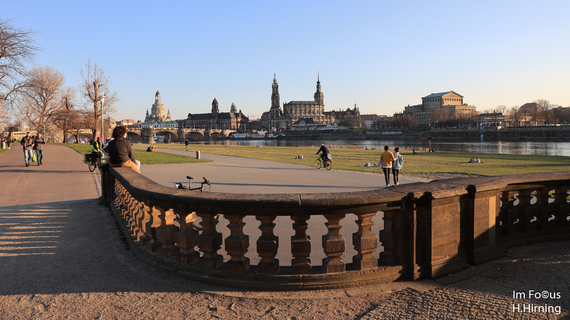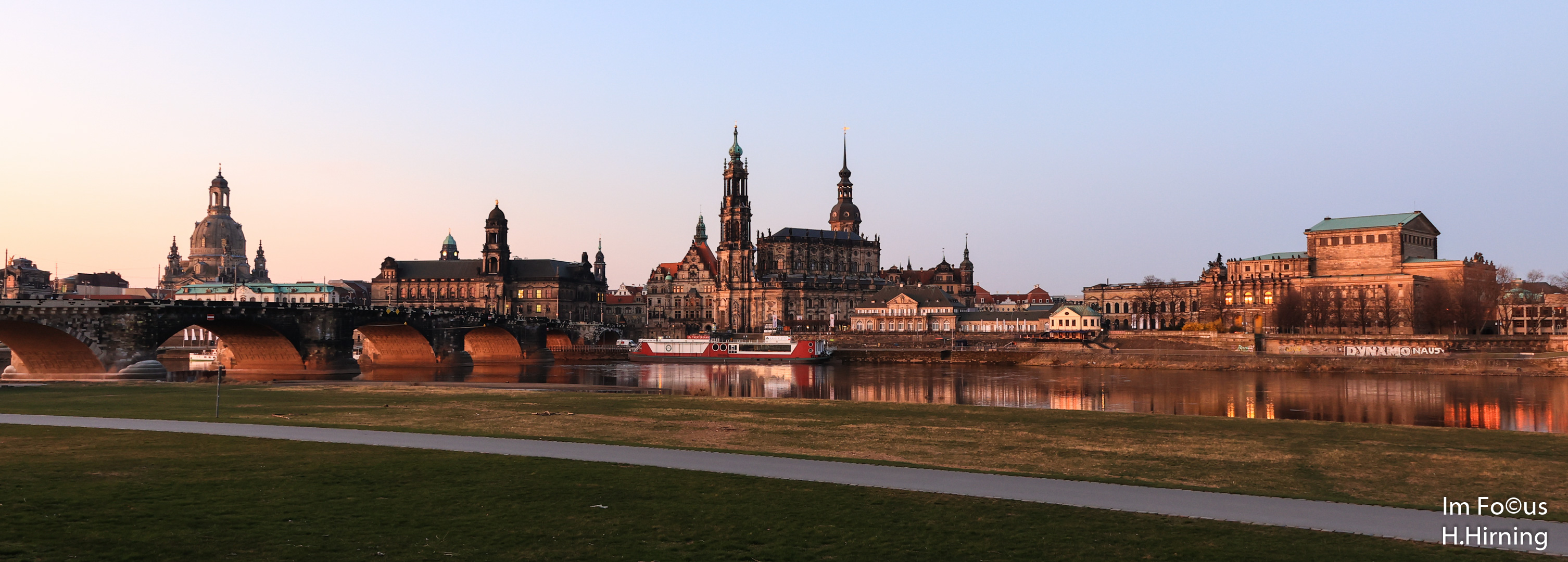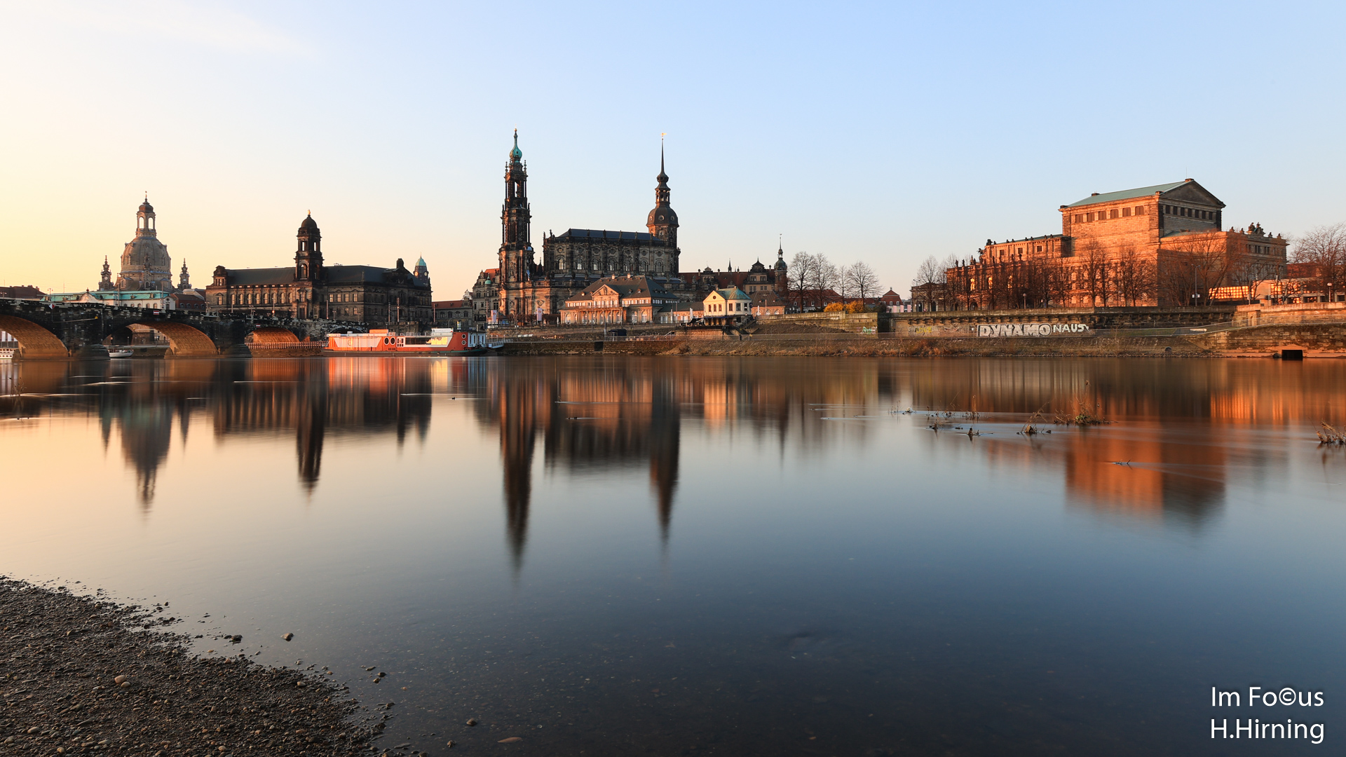 Auch der letzte Tag in Dresden brachte Sonne pur. Bei Sonnenaufgang genoss ich nochmals den Canaletto Blick auf die Altstadt und die morgendliche Ruhe am Elbufer (Ein Klick aufs Panoramabild lohnt sich!). Es fasziniert mich immer wieder aufs Neue, welch unglaubliche Ruhe von einem träg dahinziehenden Fluss ausgeht.