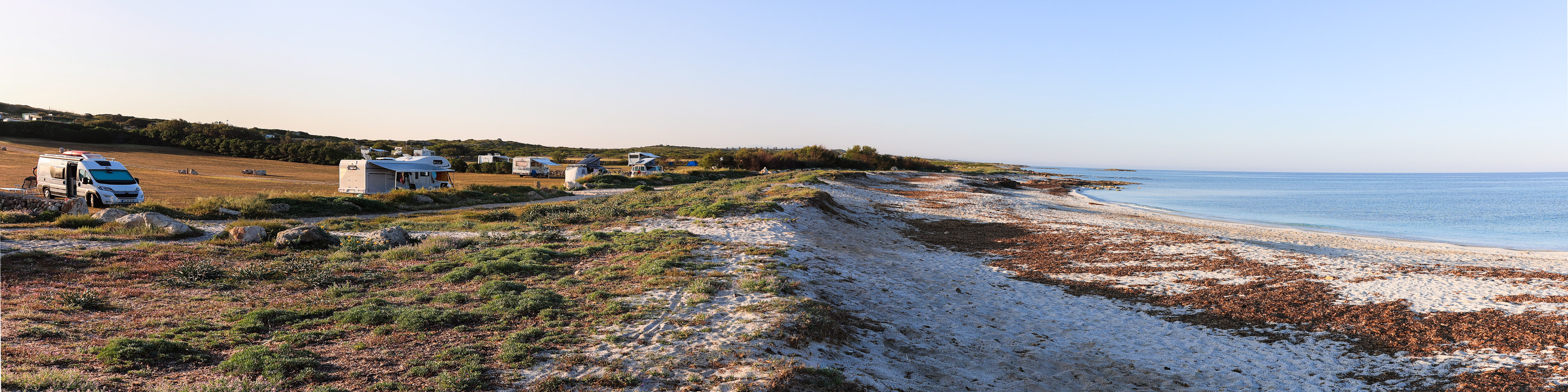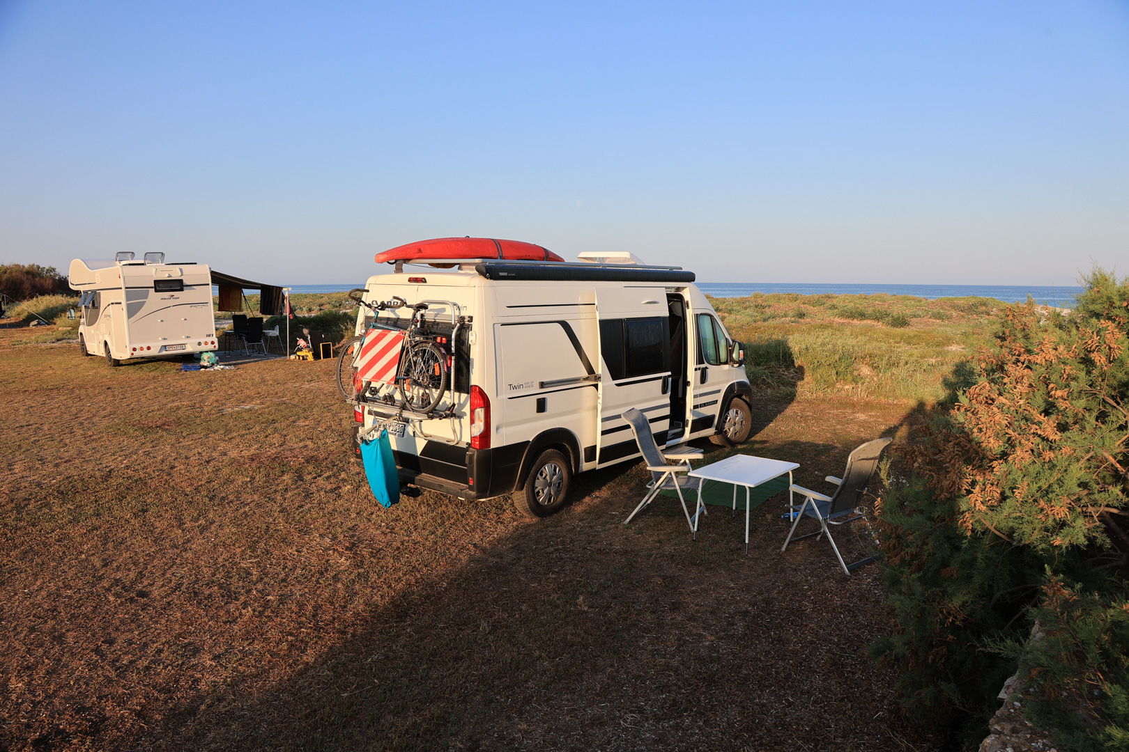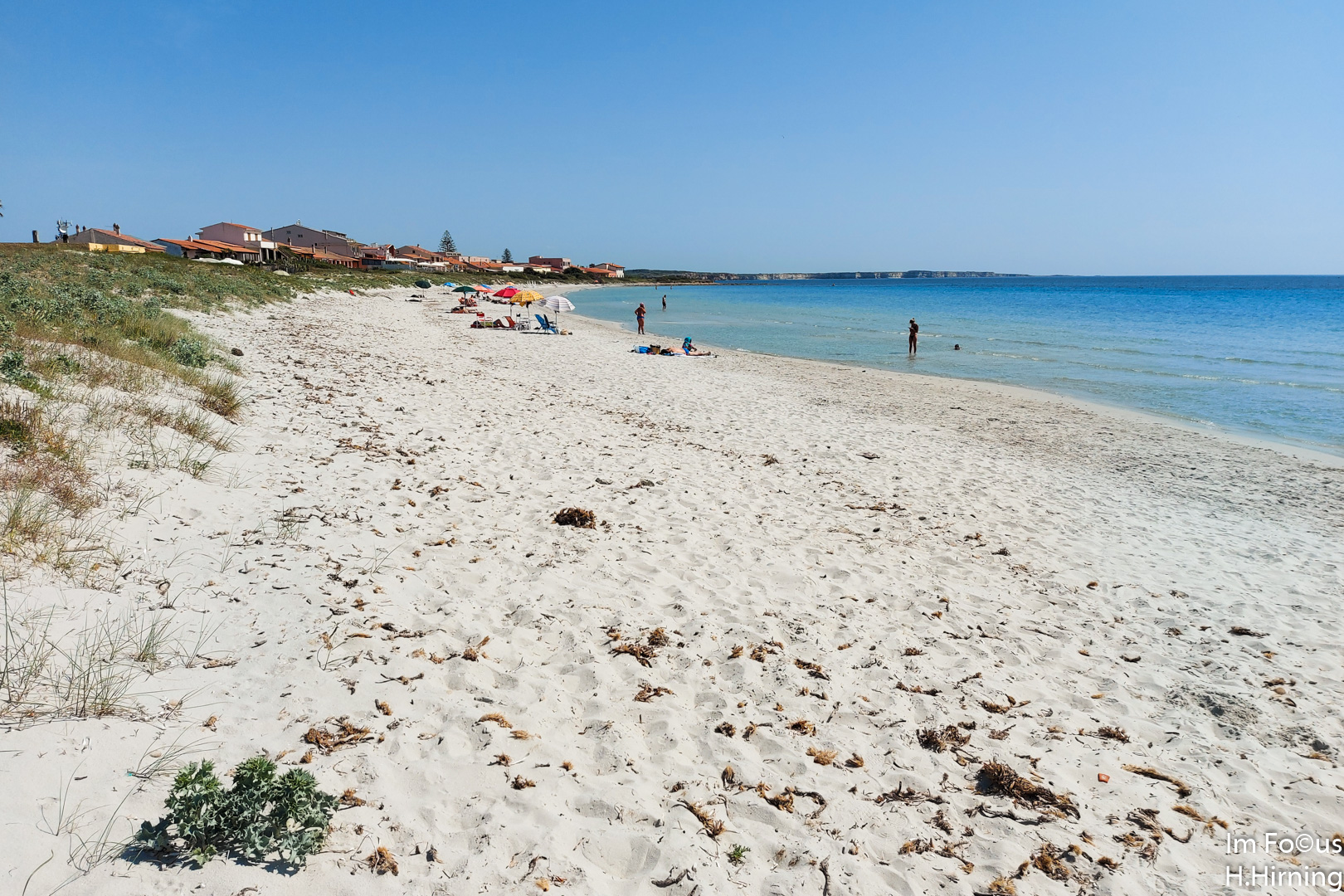 Die zunehmende Hitze machte uns zu schaffen. Auf der Weiterfahrt entlang des Stagno Sale Porcus entdeckten wir die ersten Flamingos weit entfernt das Wasser filtern. Bei Mari Ermi suchten wir nach einem uns wärmstens empfohlenen einfachsten Stellplatz in herrlicher Lage direkt am Meer. Der von uns gewählte Feldweg führte zwar auch ans Meer, aber nicht zum Stellplatz. Freies Campen ist auf Sardinien aber in der Regel nicht gestattet, doch Italiener, die ihr Wohnmobil bereits abgestellt hatten, beruhigten uns: „In der Vorsaison sei das kein Problem.“ Doch es dauerte nicht lange, wir begannen gerade, es uns bequem zu machen, da kreuzte auch schon die Polizei auf. Drei Mann hoch, der größte sogar mit Gewehr, machten sie uns deutlich, dass hier nicht gecampt werden darf. Doch es brauchte keiner Worte, zumal ich volles Verständnis dafür habe, dass man den „Freiheitsdrang“ der Wohnmobillisten wo nötig reguliert. Wir fuhren weiter und fanden auf den zweiten Anlauf die Zufahrt zum gesuchten Stellplatz. Auf einer zum Meer hin abfallenden Wiese, nur von einer kleinen Düne vom Reiskornstrand getrennt, stellten wir unseren Camper ab. Ein traumhafter Platz, nur ohne Schatten.