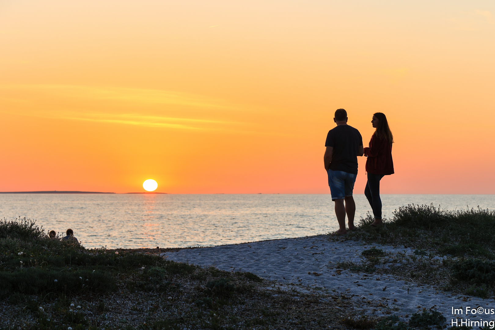 Am Abend genossen wir, wie alle, den Sonnenuntergang. Ich fotografierte ein Pärchen, das in idealer Position zur Sonne stand, um ein ausdruckstarkes Bild abzugeben. Als ich nachfragte, ob das mit dem Bild in Ordnung ginge, wurde ich gebeten ihnen das Bild zukommen zu lassen und wurde auf ein Glas Wein eingeladen.