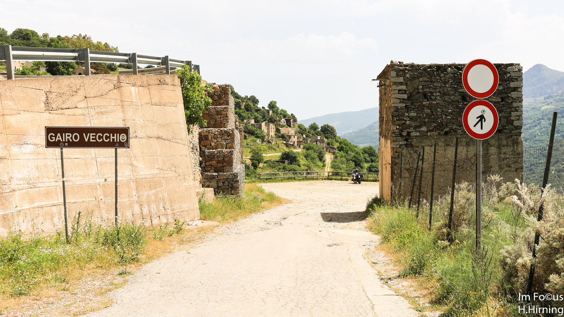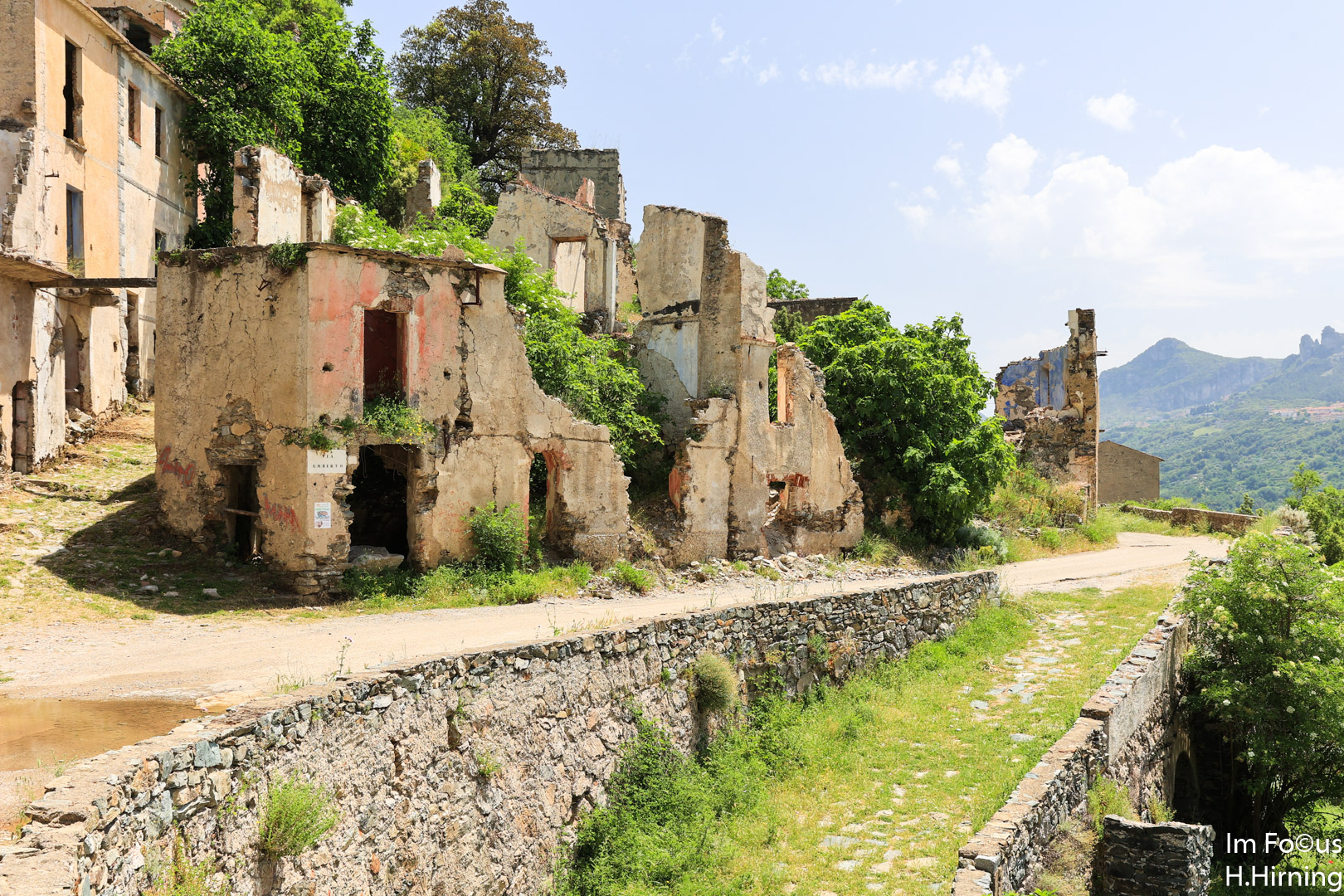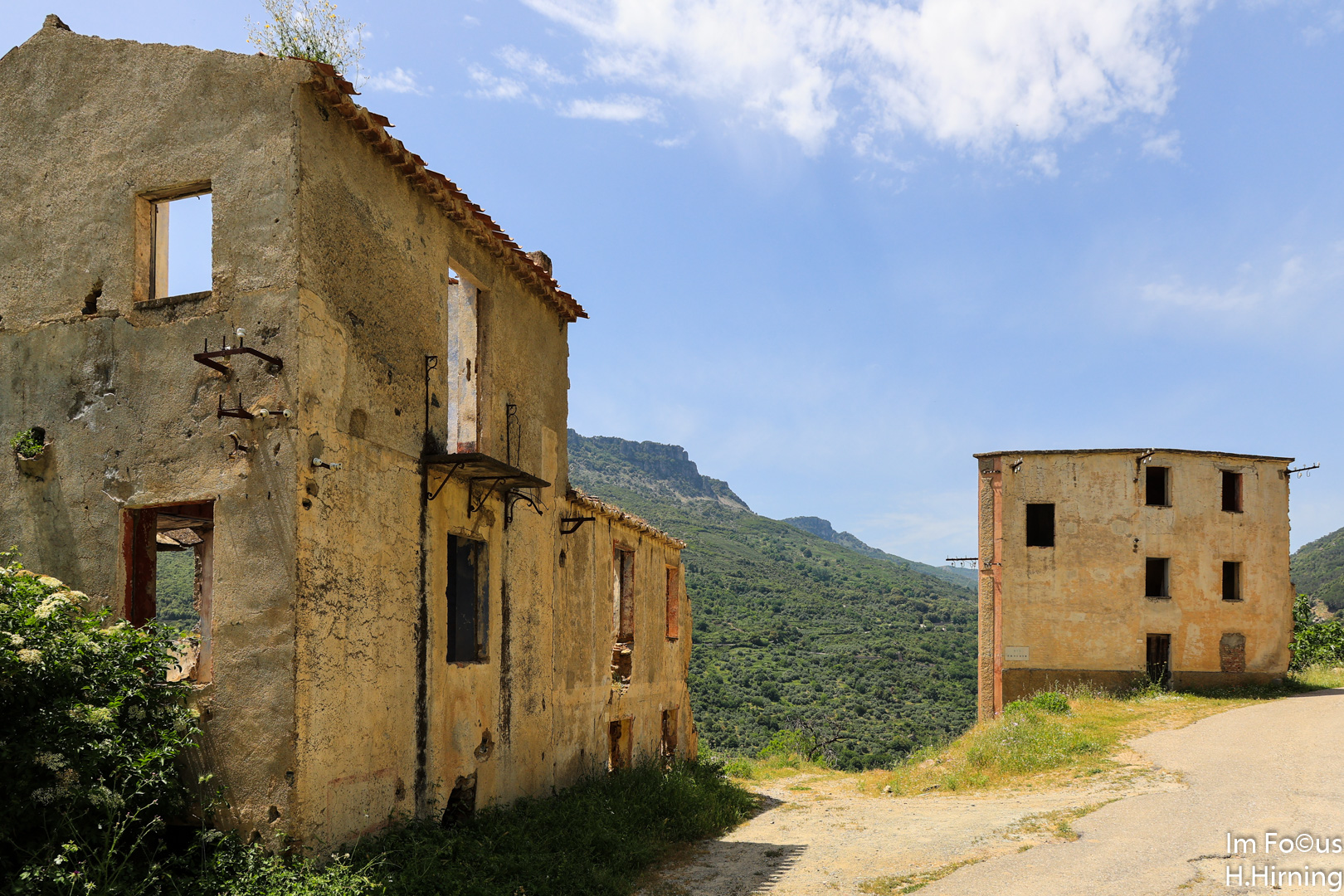 Zu der zum Fotografieren schlechten Mittagszeit erreichten wir Gairo Vecchio, heute eine Geisterstadt. Mitte Oktober 1951 kam es auf Sardinien über mehrere Tage zu sintflutartigen Regenfällen, die vielerorts Schlammlawinen auslösten. Am schlimmsten traf es Gairo, das weitgehend zerstört wurde. Die Bewohner beschlossen, etwas oberhalb ihres alten Dorfes ein neues aufzubauen. Die Ruinen blieben als Gairo Vecchio zurück.