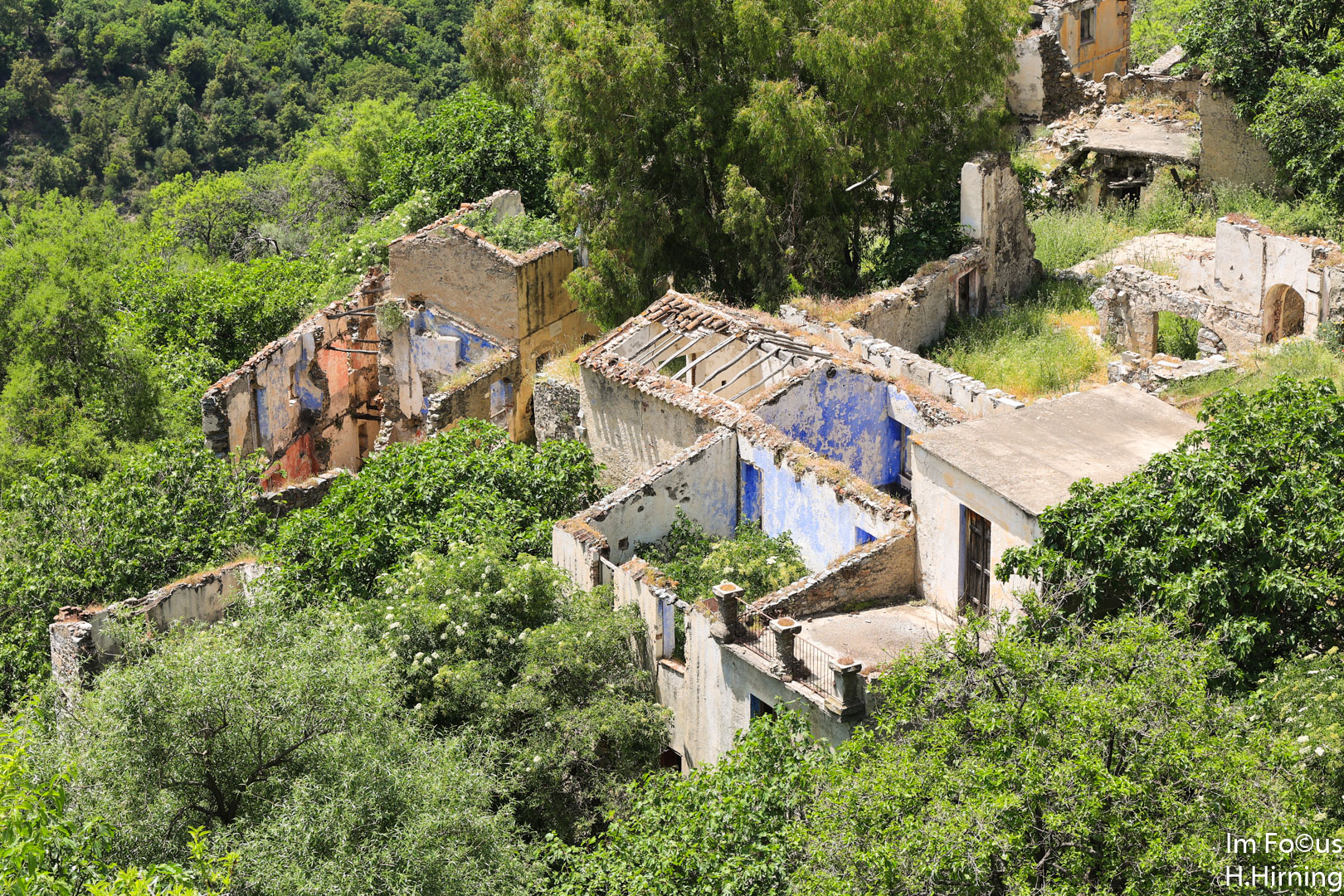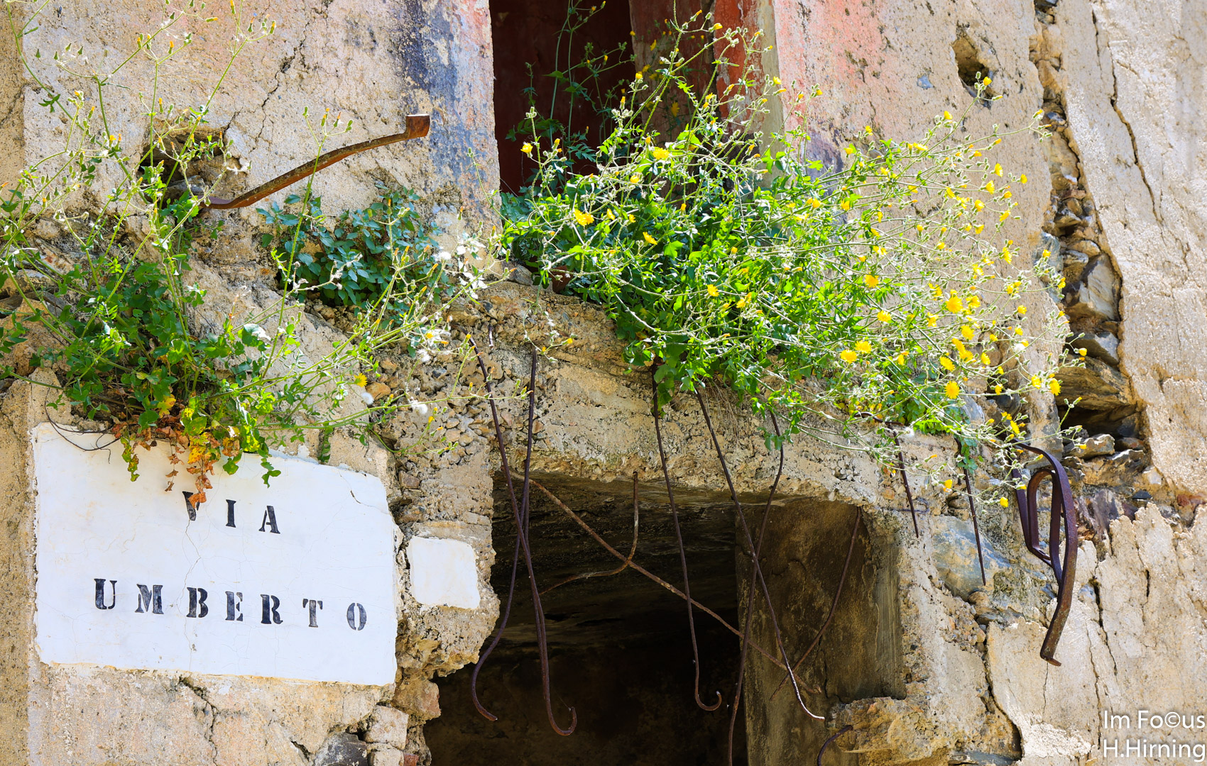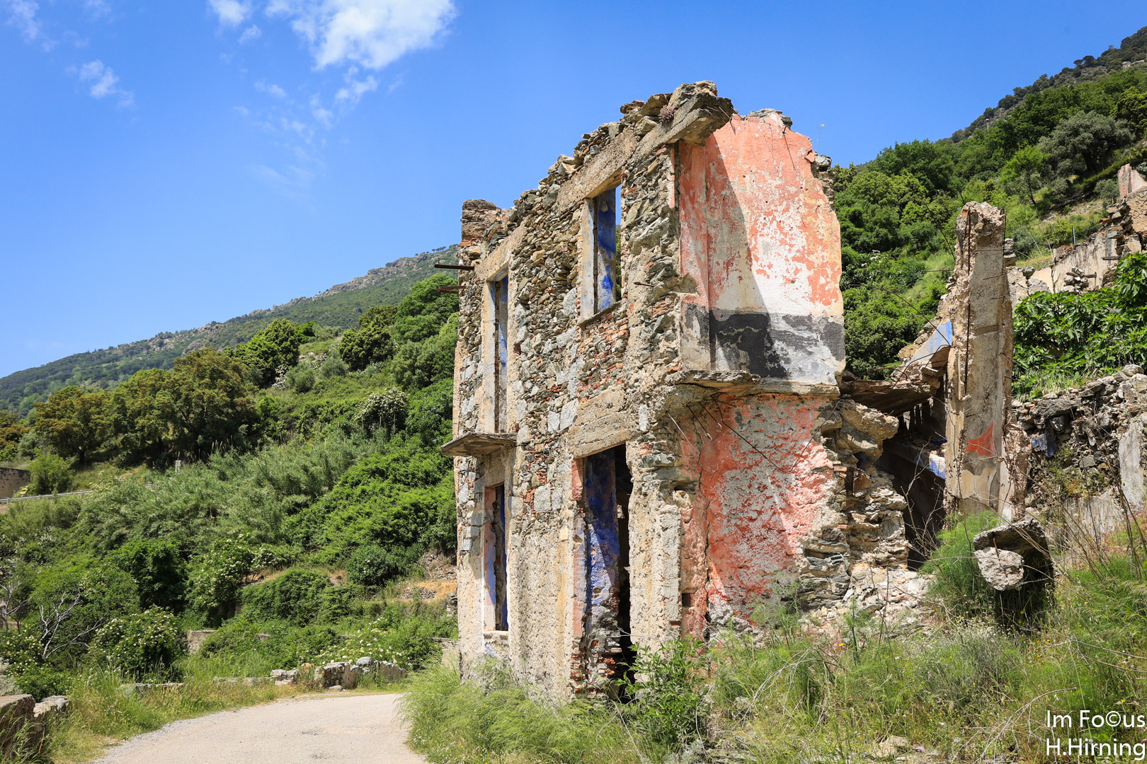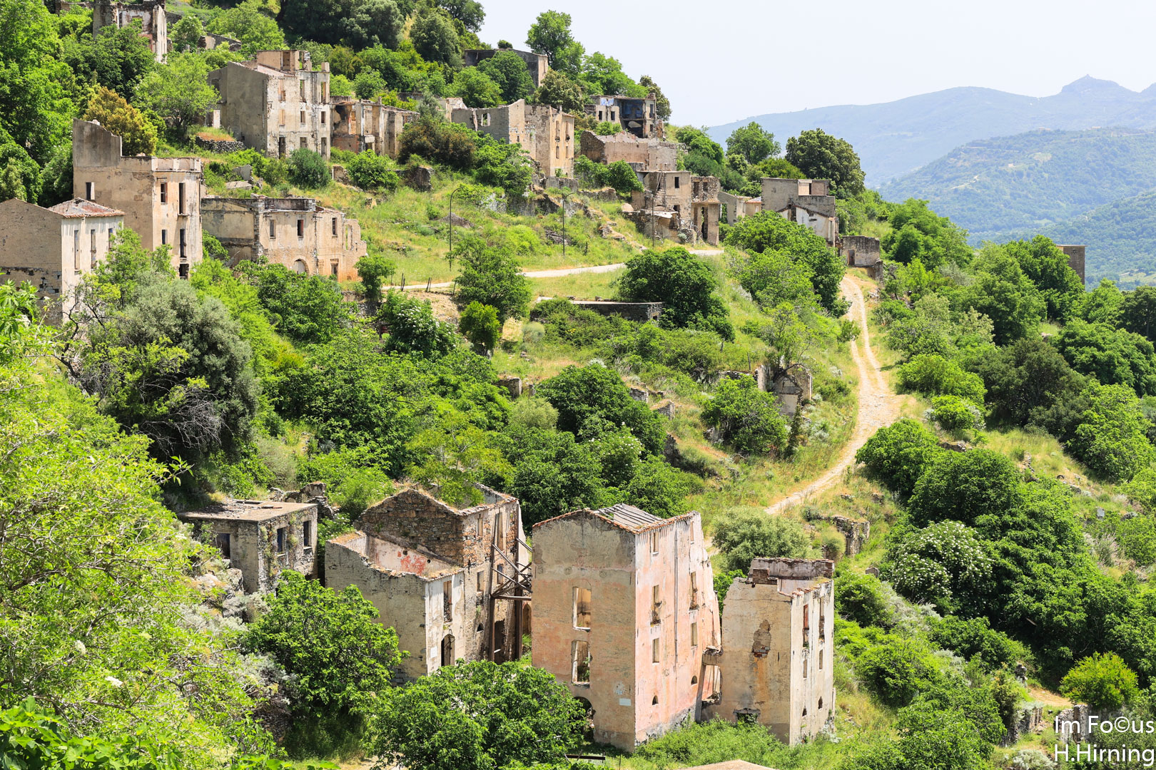 Zu der zum Fotografieren schlechten Mittagszeit erreichten wir Gairo Vecchio, heute eine Geisterstadt. Mitte Oktober 1951 kam es auf Sardinien über mehrere Tage zu sintflutartigen Regenfällen, die vielerorts Schlammlawinen auslösten. Am schlimmsten traf es Gairo, das weitgehend zerstört wurde. Die Bewohner beschlossen, etwas oberhalb ihres alten Dorfes ein neues aufzubauen. Die Ruinen blieben als Gairo Vecchio zurück.