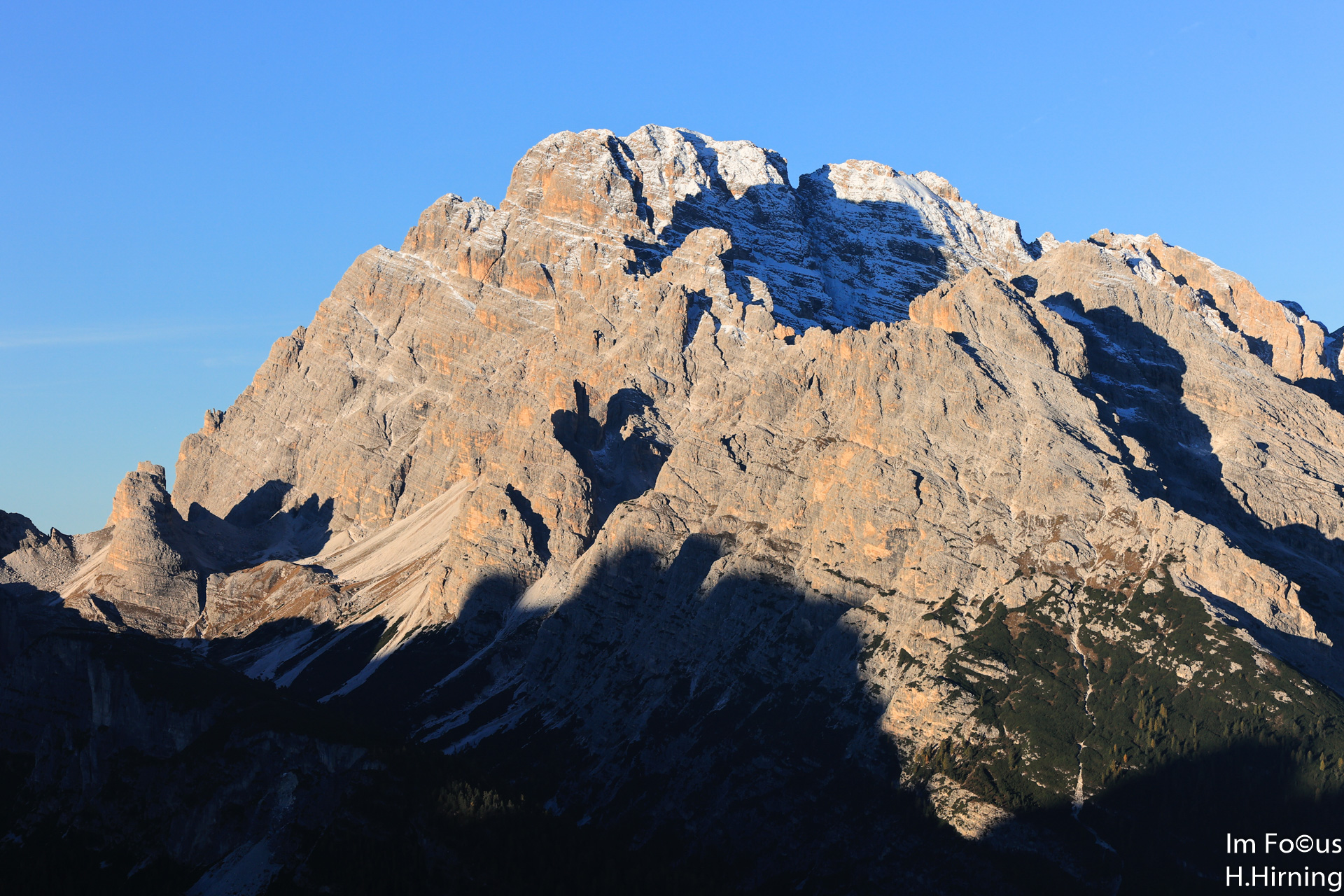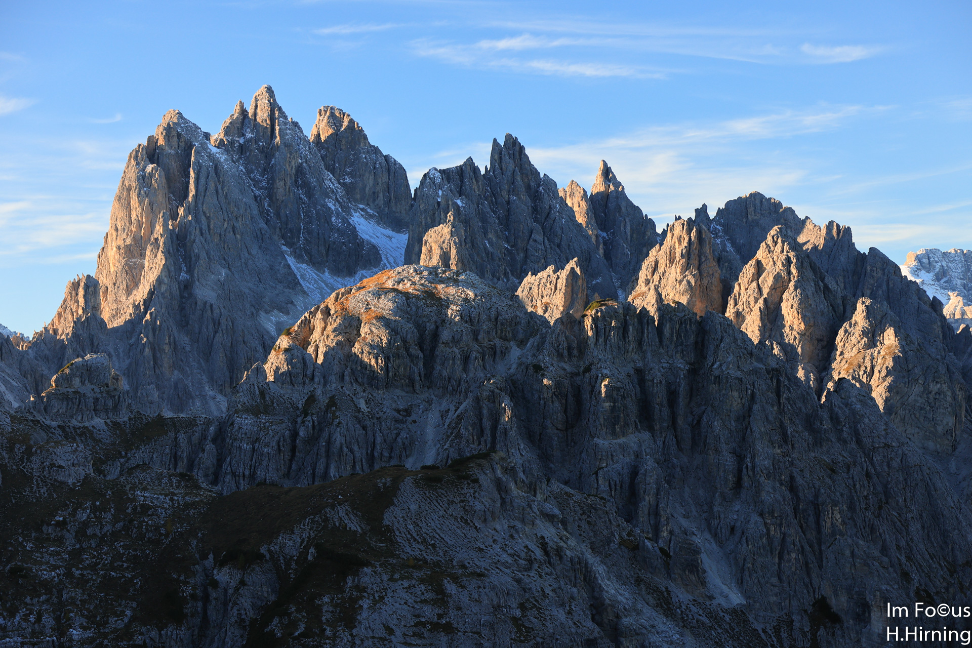 Nach dem nächtlichen Ausflug zu den Drei Zinnen bestaunten wir am anderen Morgen die Bergwelt direkt vor unserem Camper. Gegen den Uhrzeigersinn wuchsen diese herrlichen Berge direkt vor unserer Nase in den Morgenhimmel und wir saßen mittendrin: