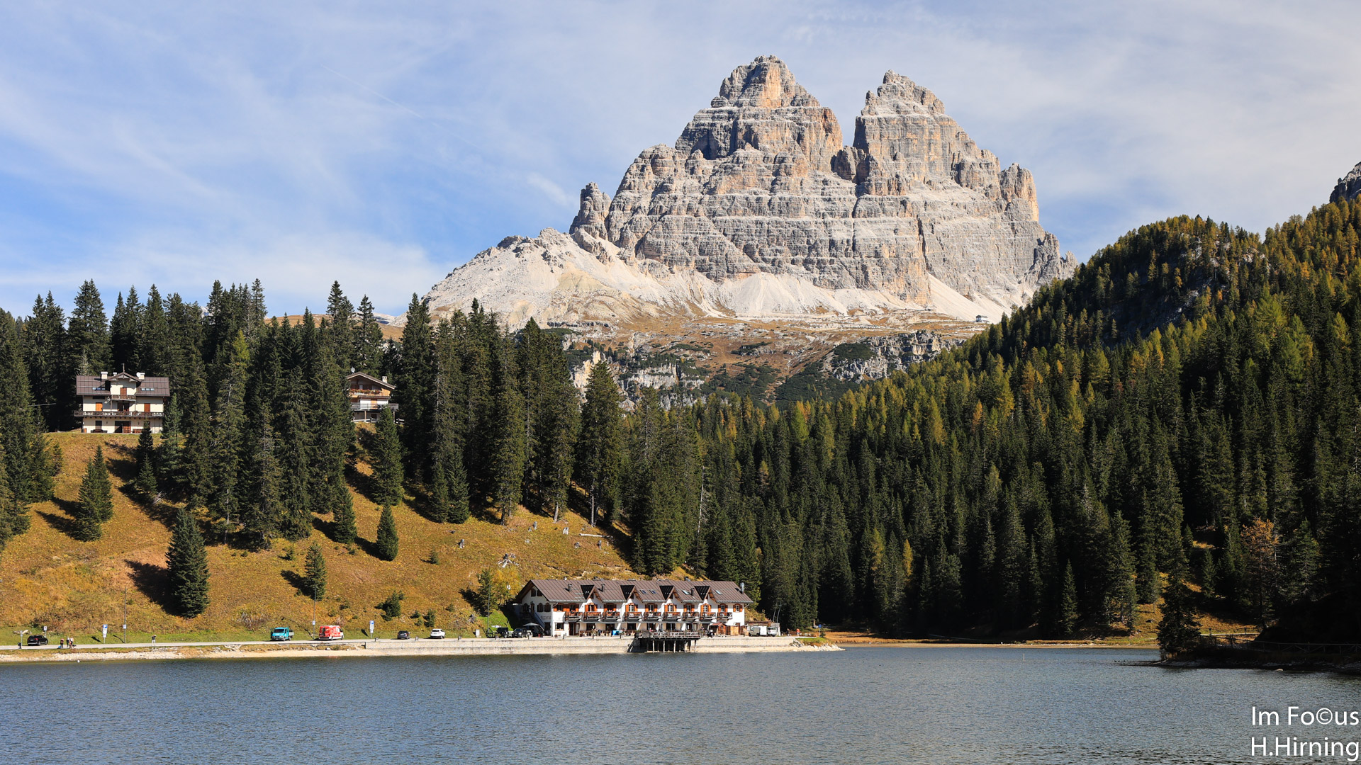 Nachdem wir diese Aussicht in uns aufgesaugt hatten, fuhren wir hinab zum Misurinasee. Hinter dem See thronte das mächtige Massiv der Drei Zinnen. Direkt unterhalb der Geröllfelder, kann man rechts die Auronzohütte erkennen.