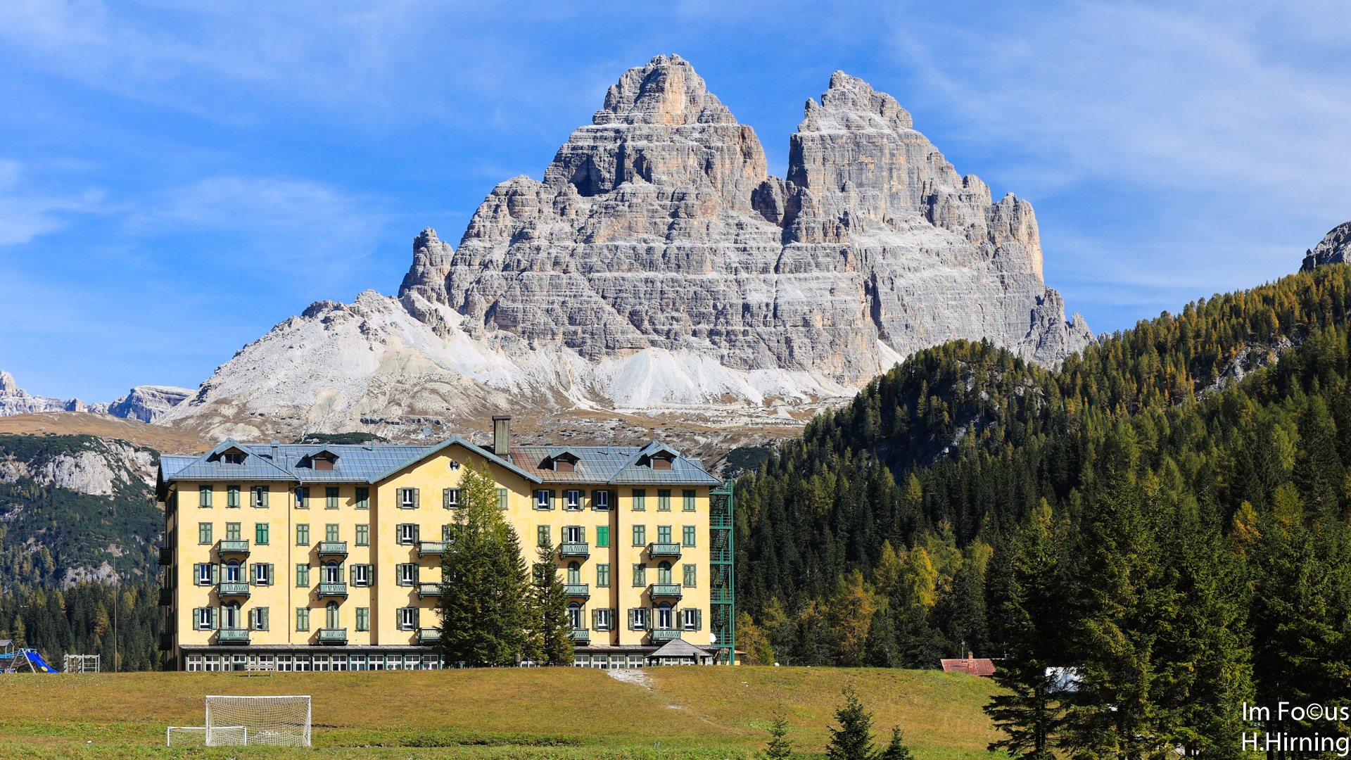 Das Grand Hotel Misurina vor der Kulisse der Drei Zinnen zeigt die klassische Architektur alter Luxushotels.