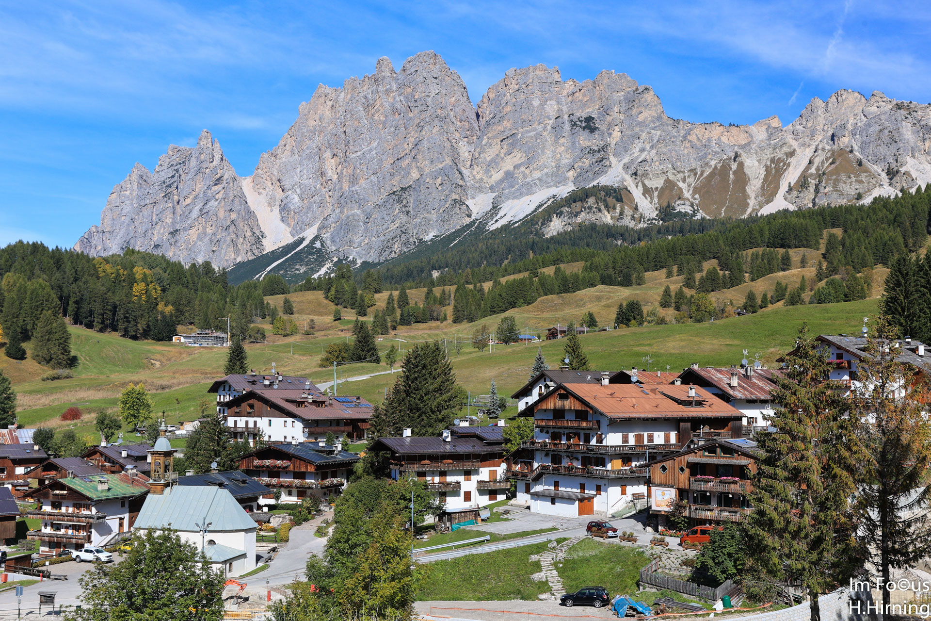 Auf unserer Weiterfahrt in Richtung Süden passierten wir den Wintersportort Cortina. Die ersten Häuser liegen direkt am Fuße des Cristallo Massivs.