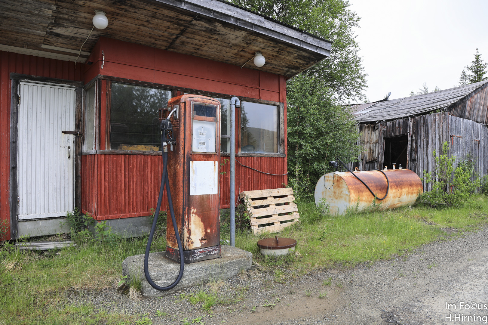 Auf dem Rückweg zur E6 passierten wir diese alte Tankstelle. Deutlicher hätte der Hinweis darauf, dass sich in dieser Ecke Fuchs und Hase gute Nacht sagen, nicht ausfallen können.
