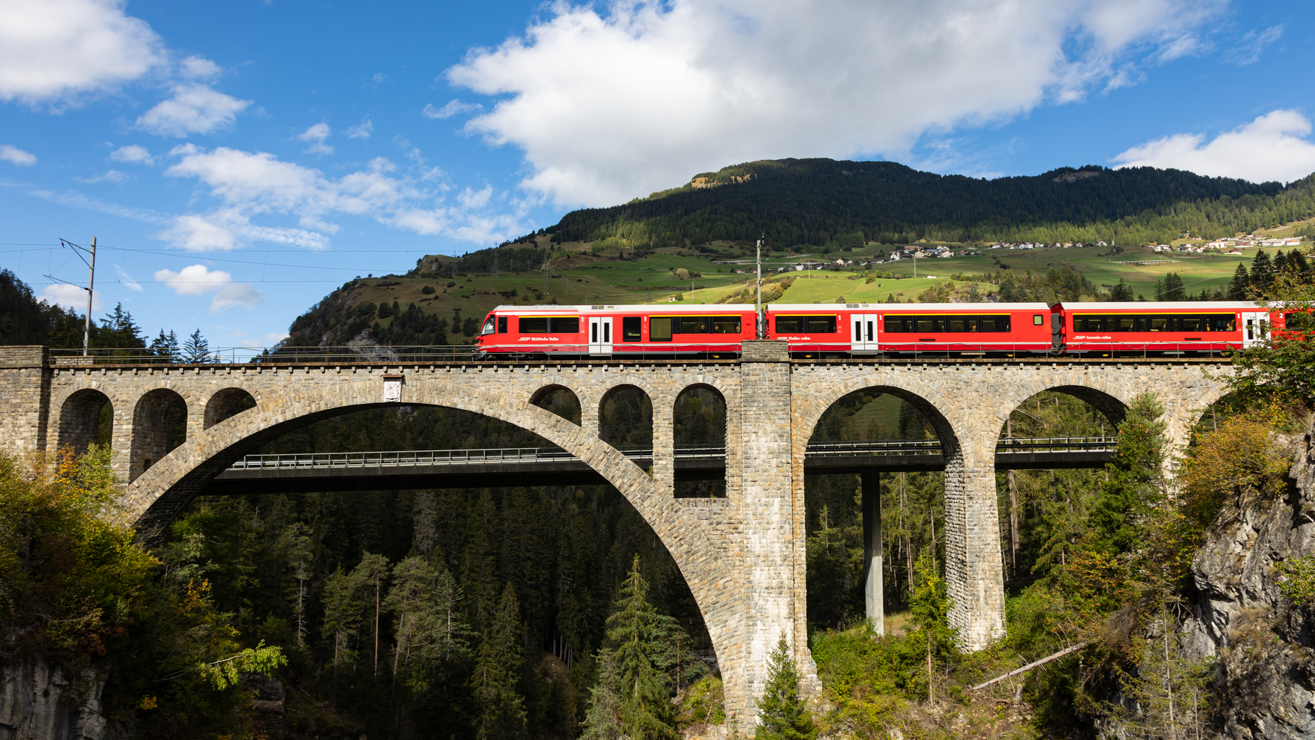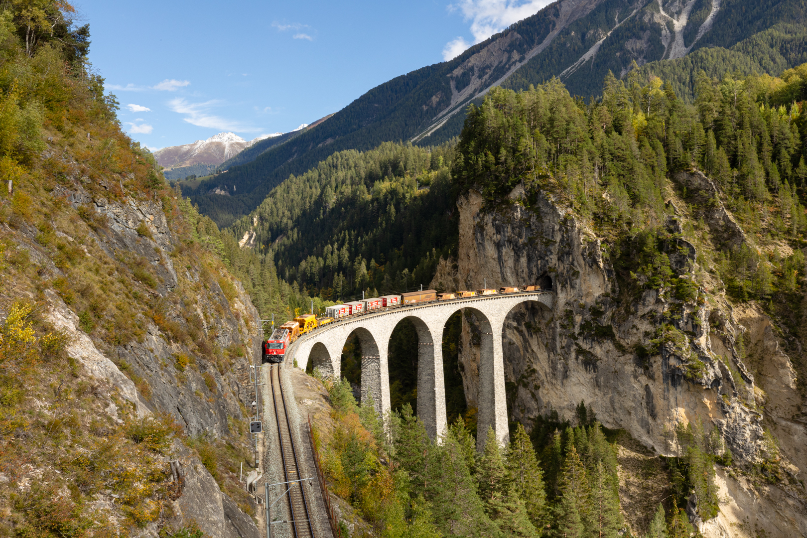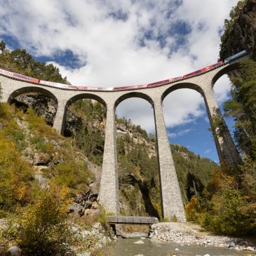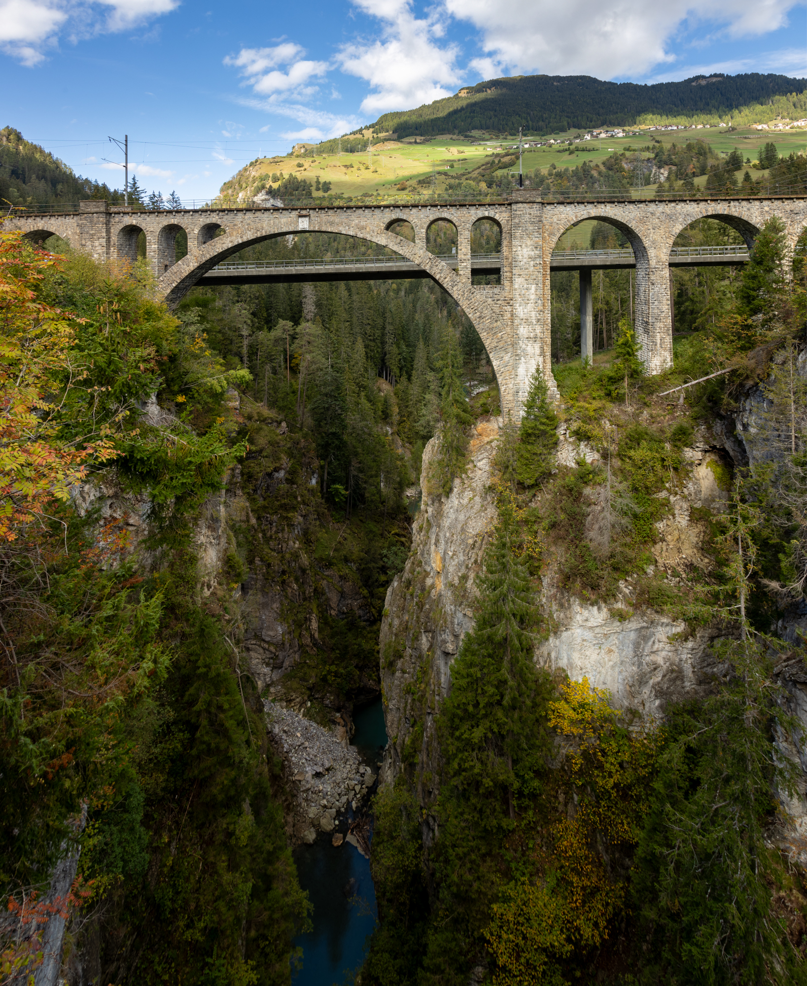 Abschließend noch ein Hinweis für jene, die selbst fotografieren wollen. Die roten Personenzüge der Rhätischen Bahn verkehren im Stundentakt. Ca. 5 Minuten vor der vollen Stunde fährt der Zug aus Tiefencastel über die Brücke und verschwindet im Tunnel in Richtung Filisur. Wenige Minuten später kommt der Gegenzug aus Filisur. Dazwischen kann man noch Güterzüge beobachten.