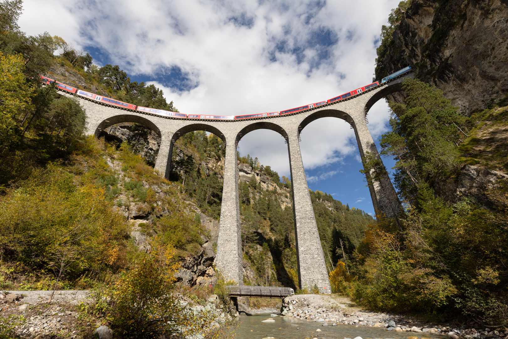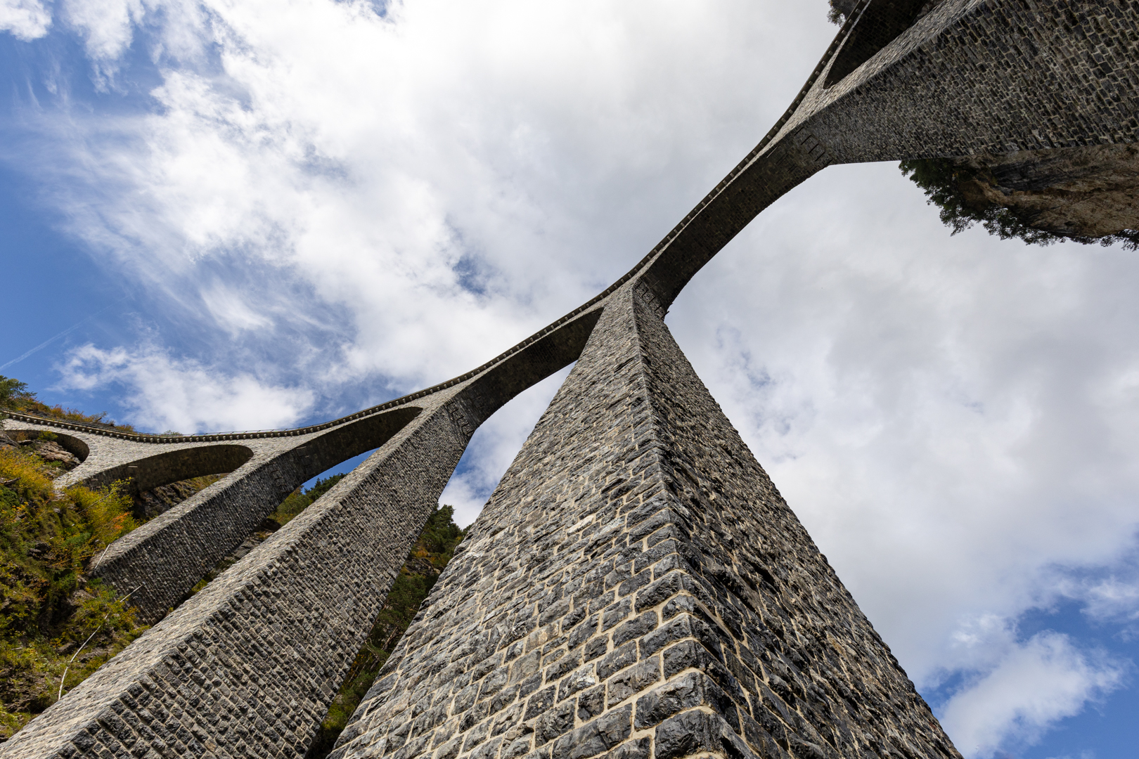 Das Landwasserviadukt gilt als Wahrzeichen der Rhätischen Bahn. Es befindet sich unweit des Bahnhofs Filisur in Graubünden und ist Teil der Albulalinie. Die Brückenfundamente sind unproblematisch zu erreichen. Von Tiefencastel in Richtung Albulapass quert die Straße vor Filisur in einer Rechtskurve das Landwasser. Unmittelbar davor liegt links der Straße ein Parkplatz, der während der Hauptreisezeit oft überfüllt sein dürfte. Von hier aus gelangt man in wenigen Minuten auf einem Schotterweg zur Basis der Brücke.