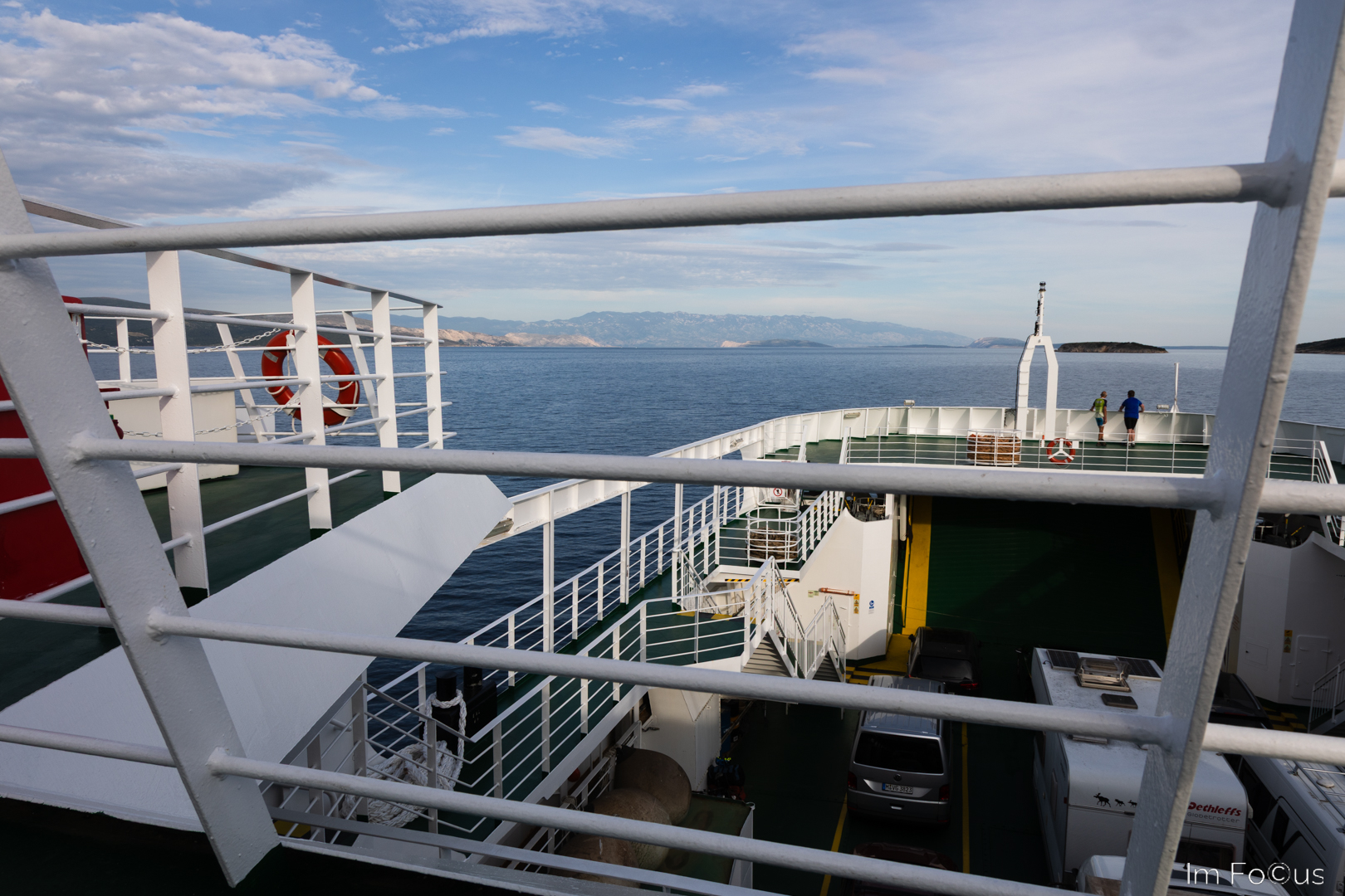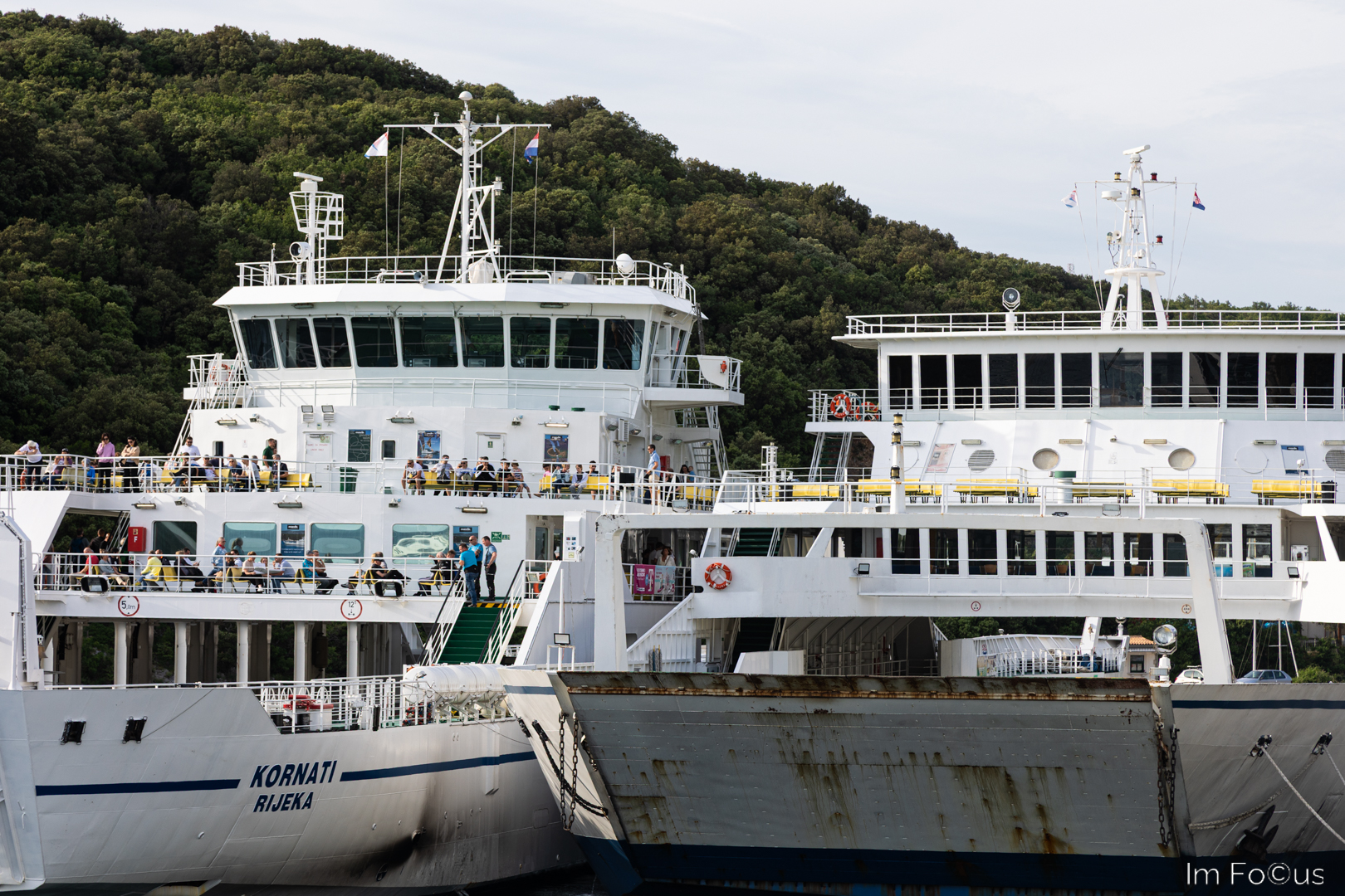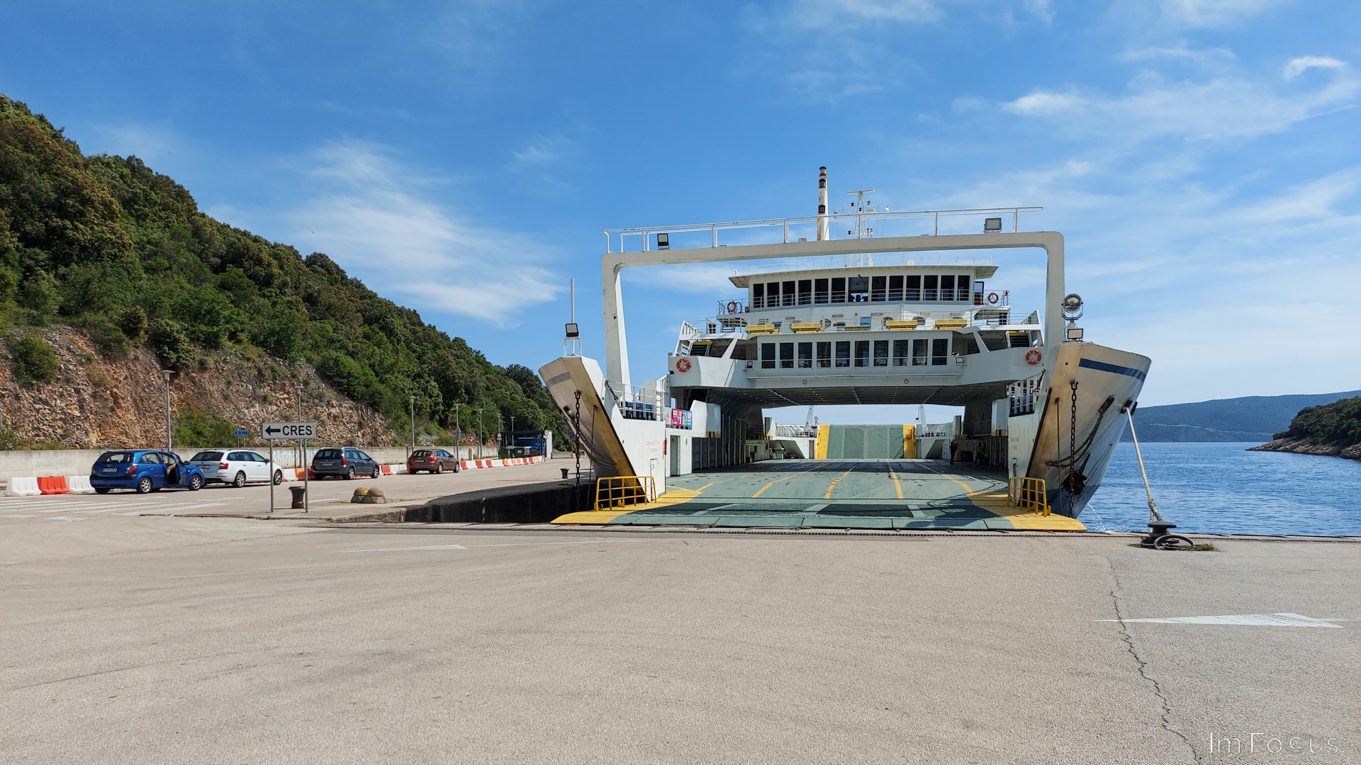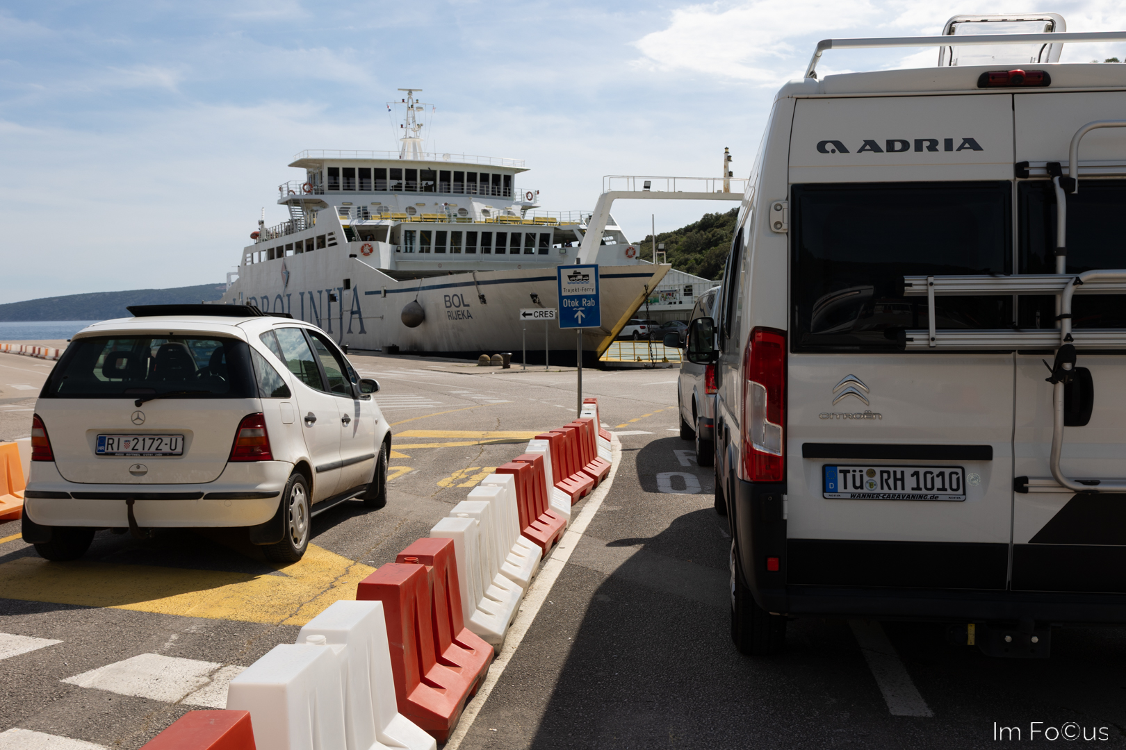 Am Nachmittag steuerten wir den Fährhafen Valbiska an. Am Knotenpunkt für den Fährverkehr zu den Nachbarinseln ging es recht geschäftig zu. Um das Verkehrsaufkommen zur gegenüberliegenden Insel Cres zu bewältigen, liefen drei Autofähren im Pendelverkehr. Nicht vorzustellen, wie es in der Hauptreisezeit hier zugeht.