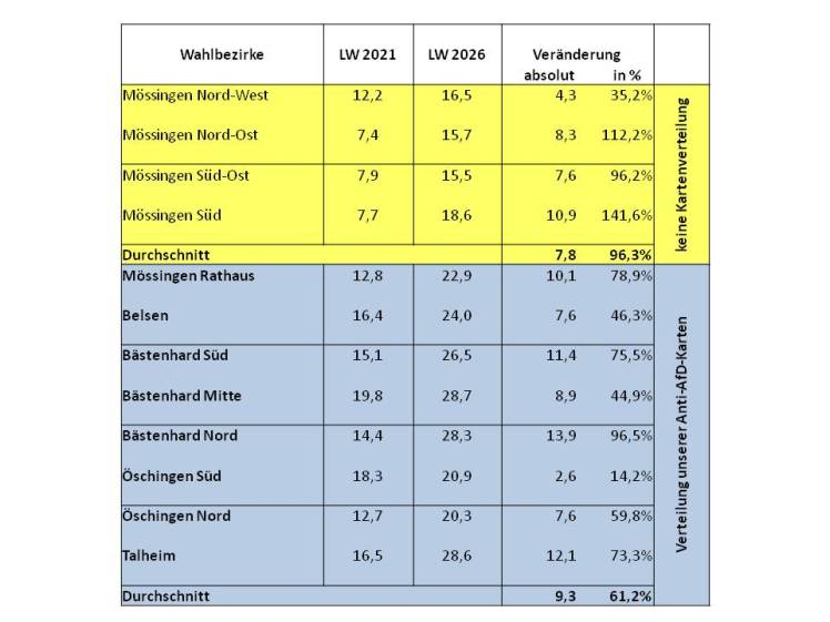 In der Kleinstadt Mössingen haben wir einen Teil der Wahlbezirke mit unseren Karten versorgt und andere nicht bedient. Dies ermöglicht es uns heute, eine Abschätzung der Wirksamkeit unserer Aktion vorzunehmen. Die nachfolgende Tabelle zeigt die Stimmenentwicklung in Wahlbezirken, in denen wir nicht aktiv wurden (gelb), im Vergleich zu solchen, wo wir aktiv waren (blau). Dazu sind jeweils die absoluten und die prozentualen Veränderungen gegenübergestellt. Daraus wurden die Durchschnitte der gelben und blauen Bezirke berechnet.