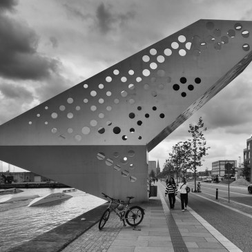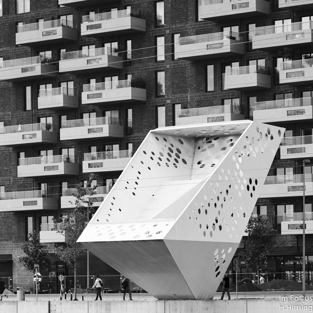 Der Salling-Tower von Dorte Mandrup Architekten erinnert je nach Betrachtungswinkel an einen Vogel oder einen Schweizer Käse. Wie auch immer, der 15 m hohe Aussichtsturm, direkt an der Wasserkante des einstigen Hafenbeckens errichtet, markiert den Eingang zum neuen Erlebnis-Areal „Bassin 7“ in Aarhus Ø. Das skulpturale Gebilde ist zweifellos ein Blickfang. Durch seine Lage und Orientierung vermittelt es aber auch zwischen der massiven Bebauung auf der einen und dem angrenzenden Meer auf der anderen Seite.