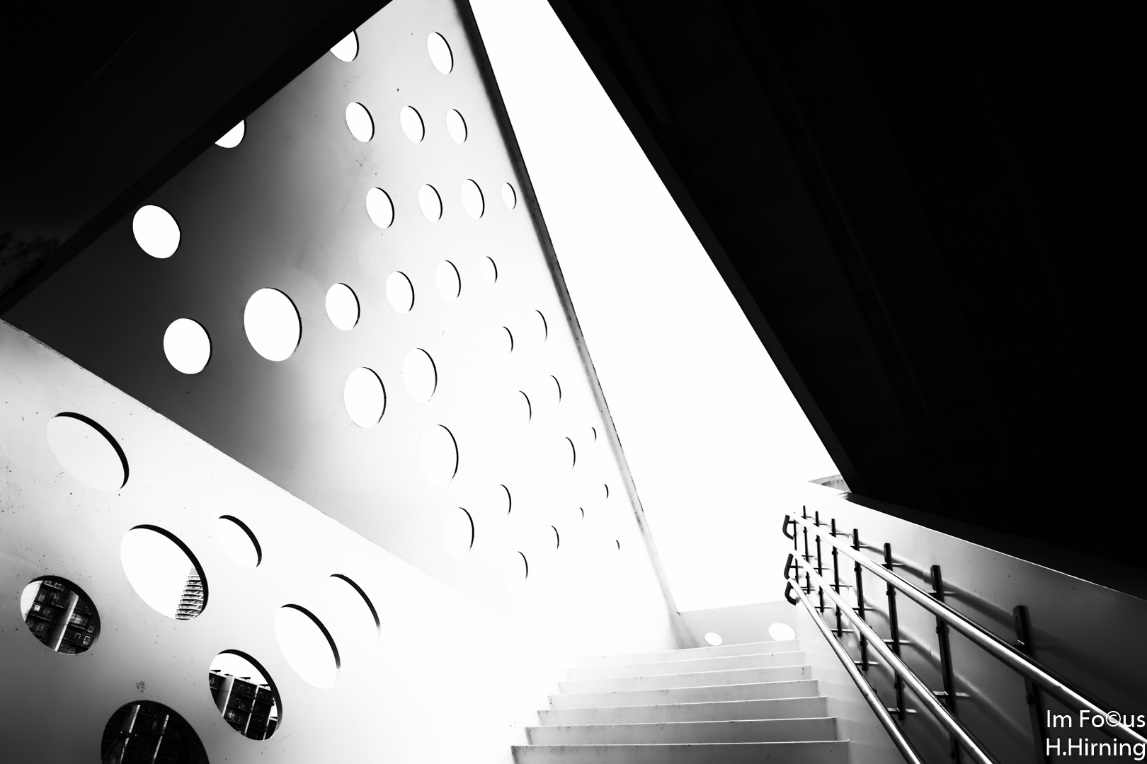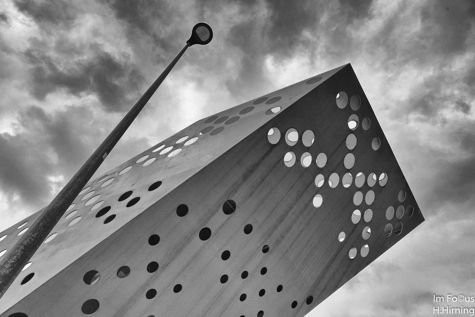 Der Aussichtsturm vermittelt trotz der Konstruktion aus massiven Stahlplatten durchaus eine gewisse Leichtigkeit. Dazu trägt insbesondere das Lochmuster bei, das Ausblicke nach allen Seiten ermöglicht und zugleich das Gewicht der Konstruktion verringert. Der Treppenaufgang erschließt zwei Aussichtsplattformen auf 4,5 und 7,5 Meter Höhe. Diese erlauben einen schönen Blick auf die Aktivitäten in und um das Bassin 7.
