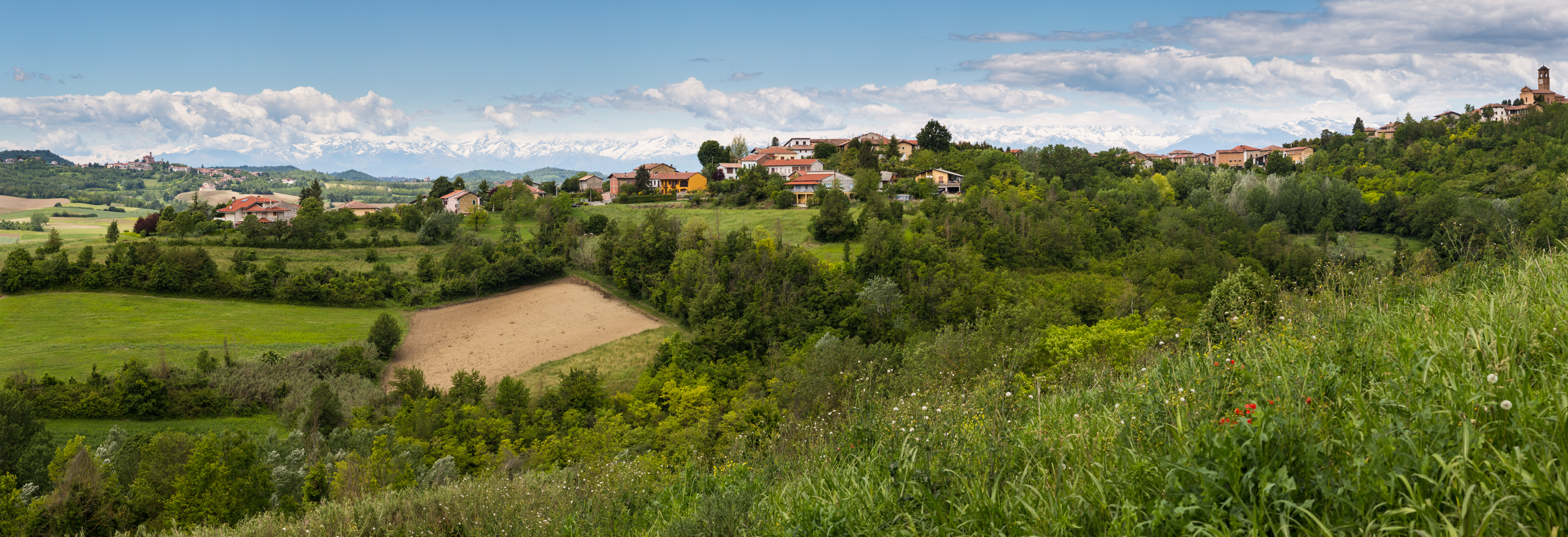 Blick über das Tal der Stura auf die Turiner Alpen. Wie immer bei Panoramen lohnt sich die Vergrößerung.