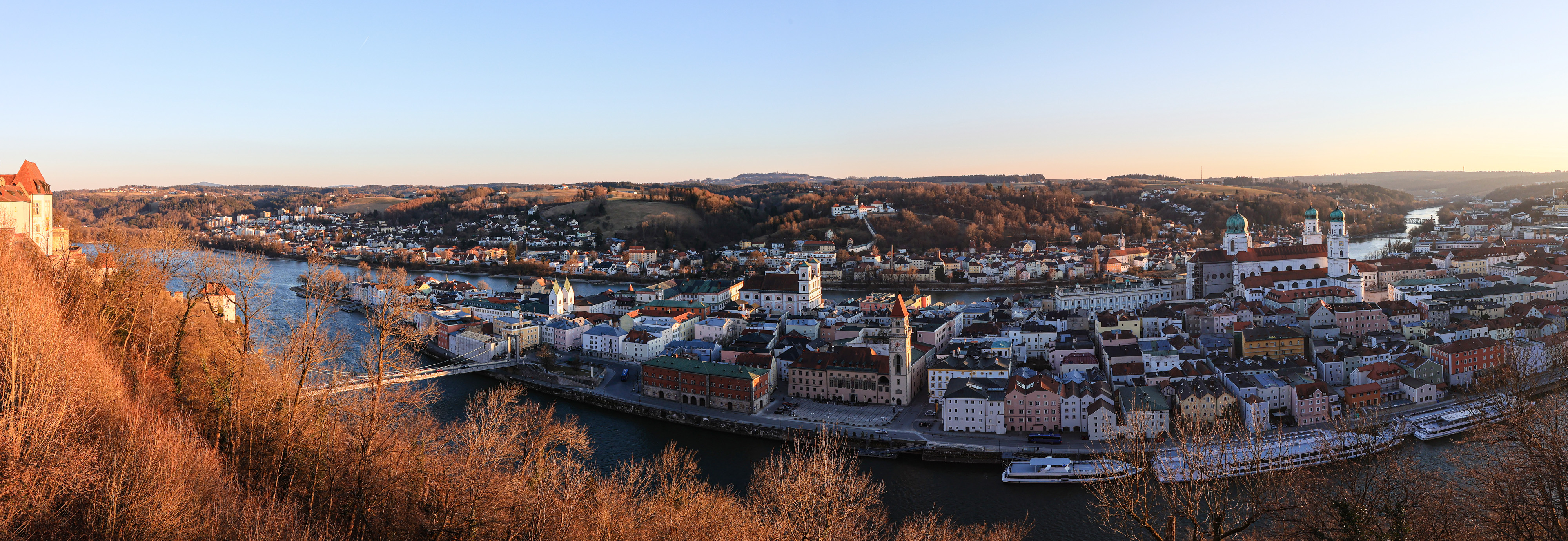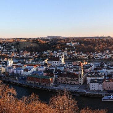 Abendlicher Blick vom Oberhaus über die Altstadt auf der Insel zwischen Donau und Inn. Zum reinzoomen geeignet.