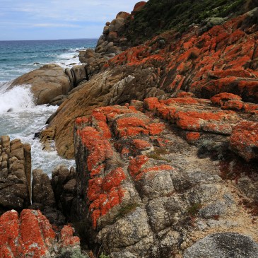 Eigentlich hat man zu diesem Zeitpunkt mit der Wanderung zufrieden abgeschlossen und erwartet keine weiteren Highlights mehr, doch dann stolpert man am Ende der Hazzard Bay über so eine kleine Bucht und reibt sich die Augen, weil man diesen fast nicht traut. Der rosafarbene Granit, eine Besonderheit der ganzen Region, bildet zusammen mit dem Orange der Algen und den Blau- und Türkistönen des Wassers ein überwältigendes Farbenspiel.