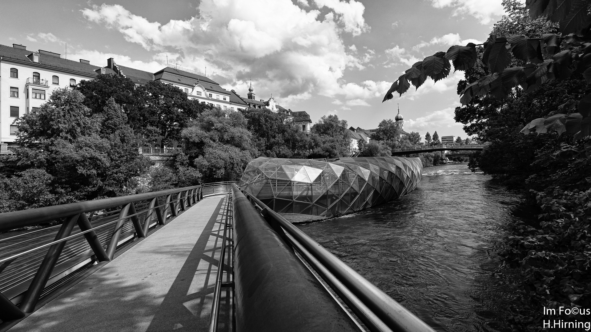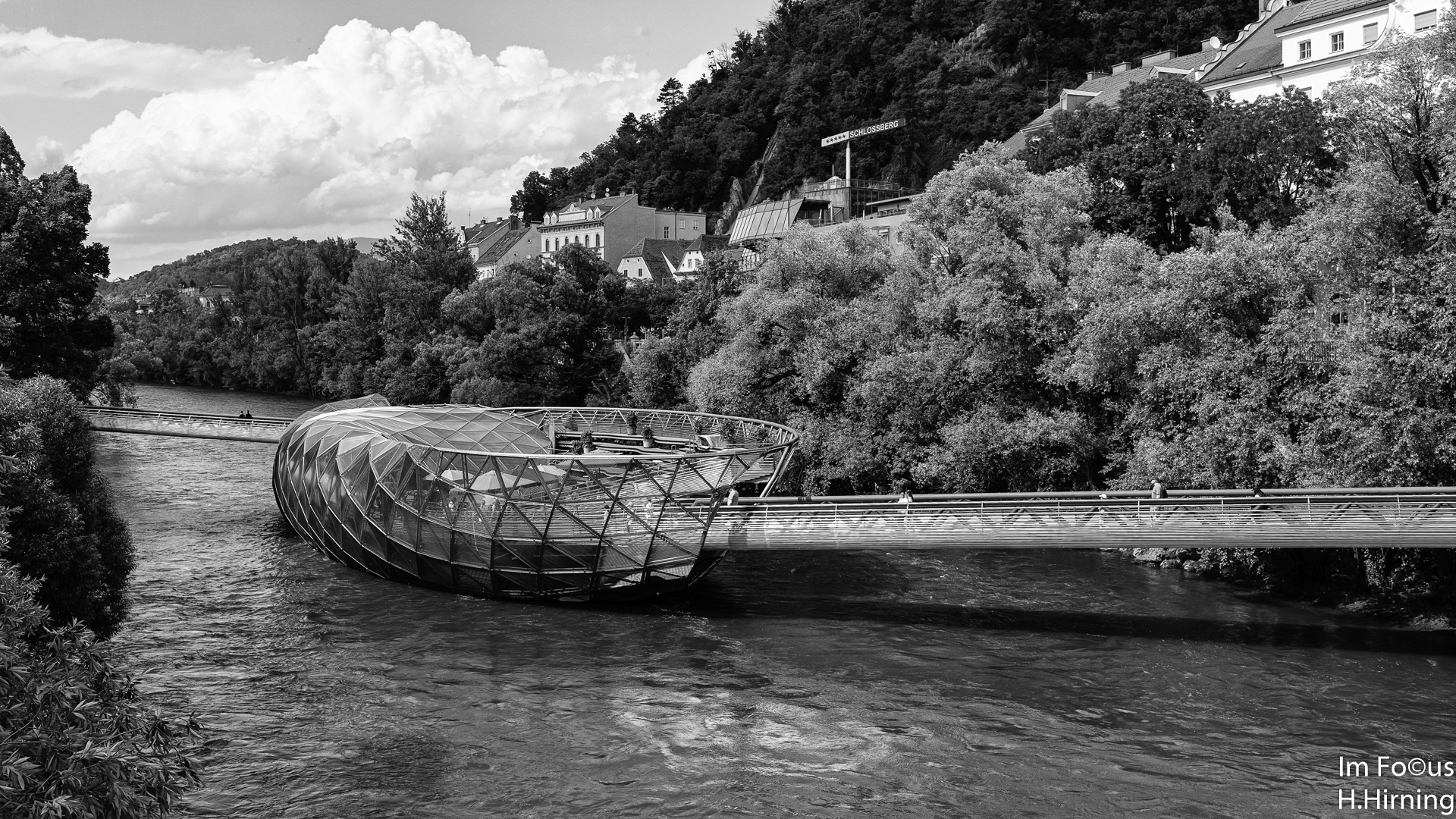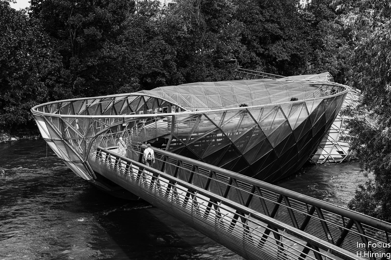 Das zweite Projekt, die Mur-Insel von Vito Acconci, liegt nur wenige hundert Meter weiter. Die einer Muschel nachempfundene Stahlkonstruktion dient nicht nur zur Querung des Flusses, sie beherbergt auch ein Cafe und ist ein häufig genutzter Veranstaltungsort.