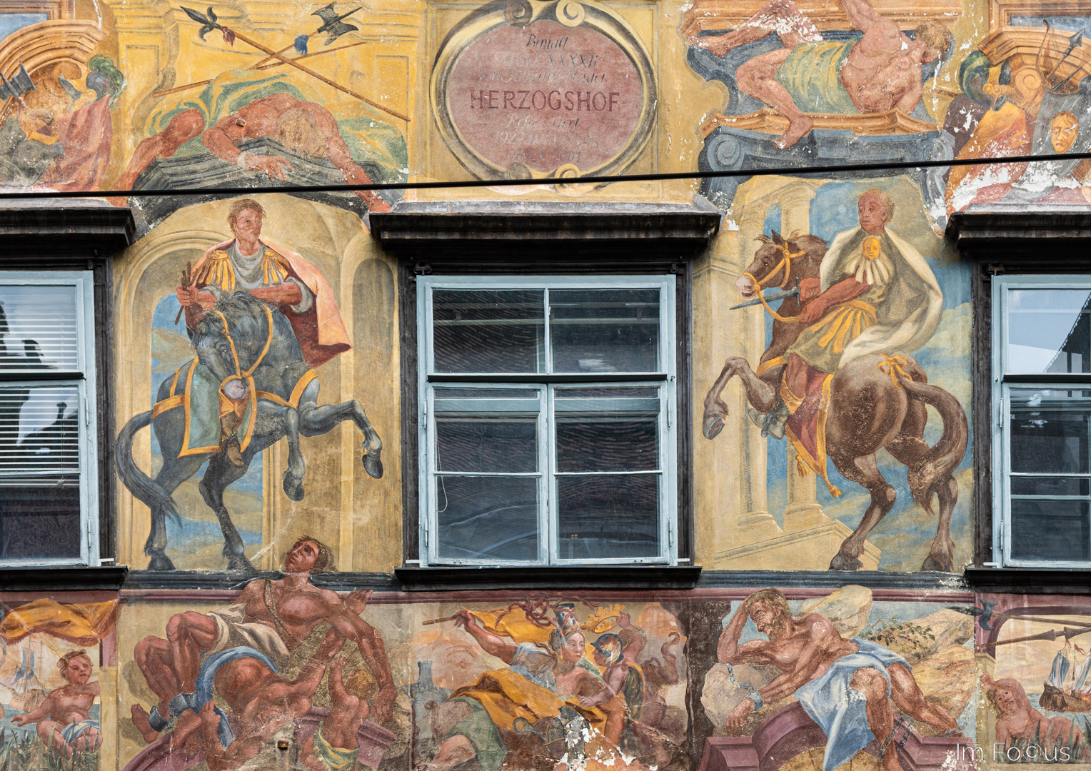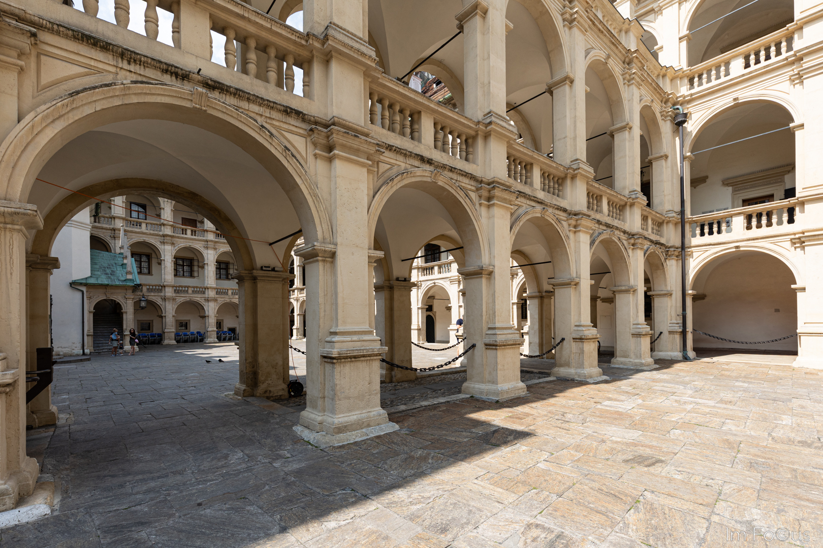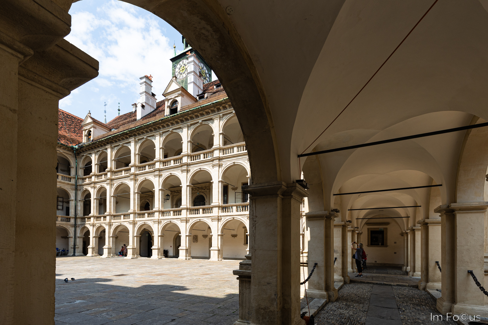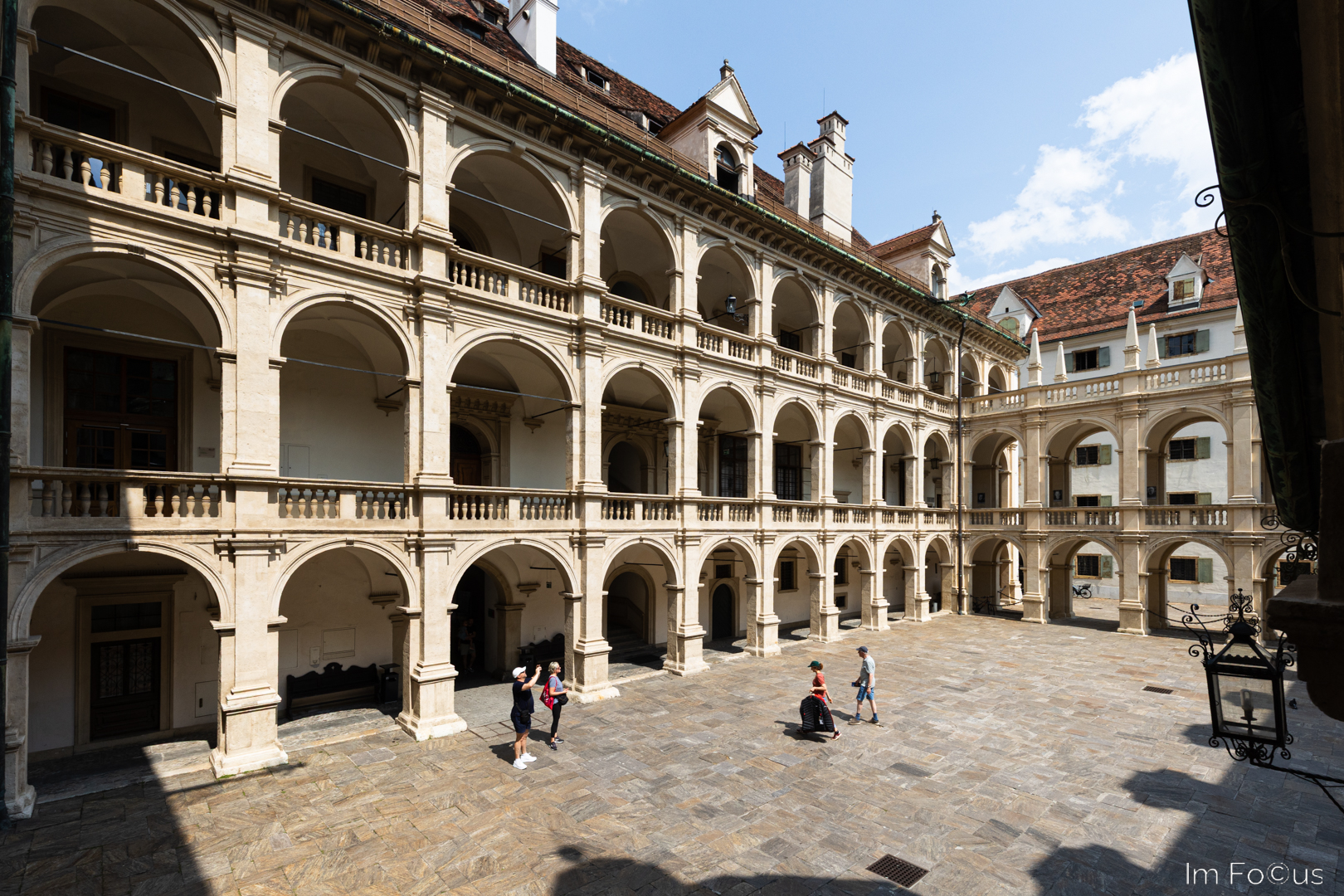 Folgt man der Herrengasse, liegen die Sehenswürdigkeiten eng beisammen. Der geschichtsträchtige Herzogshof aus dem 14. Jh. zieht mit seiner vollständig bemalten Fassade (oben) die Blicke auf sich. Das Landhaus mit seinen Arkadenhöfen (unten) zählt zu den Hauptsehenswürdigkeiten der Stadt. Noch heute hält der steiermärkische Landtag in diesem prächtigen Renaissancebau aus dem 16. Jh. seine Sitzungen ab.