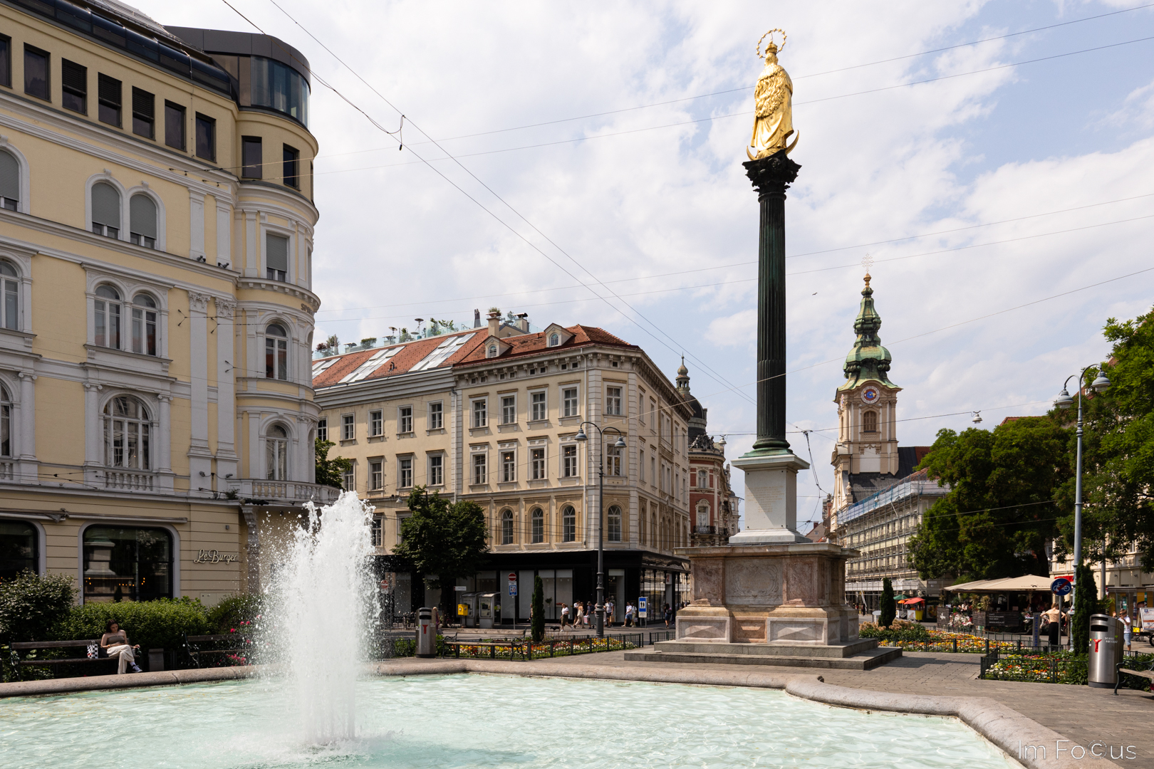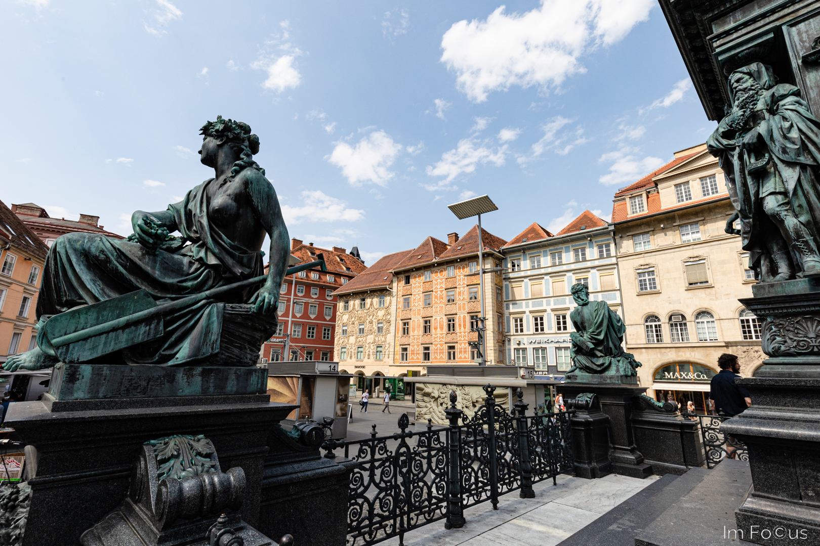 Der Hauptplatz mit dem Erzherzog-Johann-Brunnen ist der zentrale Treffpunkt. Der Platz liegt an der Grazer Einkaufsmeile und ist von prächtigen Bürgerhäusern umstellt, die mit ihren ausgefallenen Fassaden wetteifern.