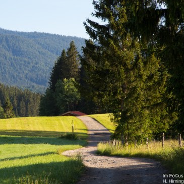 Als ich aufbrach, hing in den feuchten Niederungen noch der Dunst des nächtlichen Gewitterschauers. Während im Westen das Wettersteingebirge im ersten Licht der Morgensonne erstrahlte,
