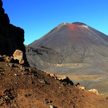 Als der Fuß des Mt. Ngauruhoe, des höchsten und gewaltigsten Vulkans des Tongariromassivs, erreicht war, nahm die Steigung deutlich zu. Nach 2 Stunden Gehzeit hatte ich den Mangadepopo Sattel erreicht und 550 m Höhenunterschied bewältigt. Diese nüchternen Zahlen können jedoch nicht den überwältigenden Eindruck beschreiben, von dem der Bergwanderer hier erfasst wird. Sobald er über die Kante kommt, tritt er nicht nur aus dem Schatten des Berges ins Licht der Morgensonne, sondern er sieht auch zum ersten Mal den Mt. Ngauruhoe in seiner ganzen Pracht.