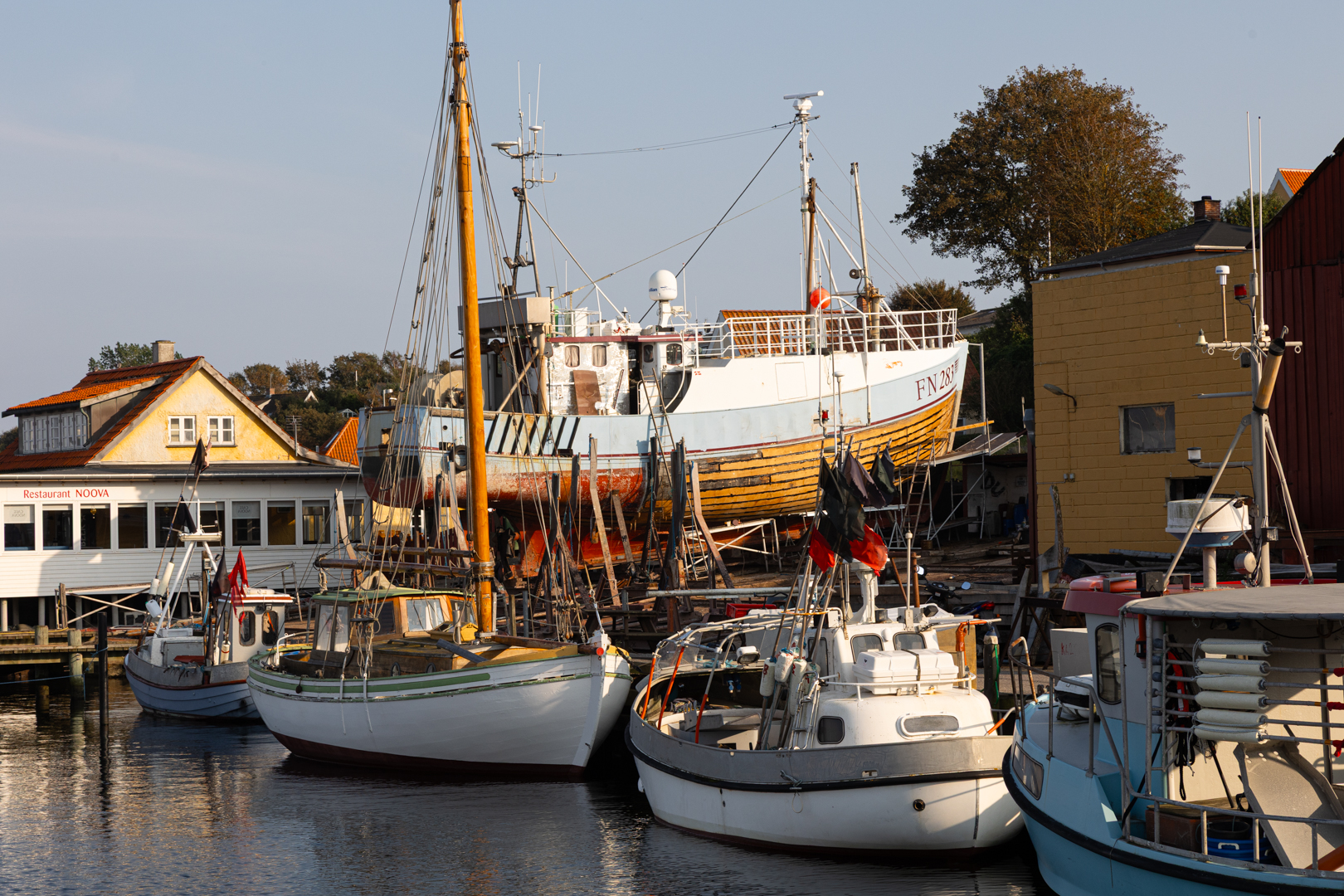 Nach dem Fotostopp an der Storebeltbrücke suchten wir nach einer Möglichkeit, dem neblig-trüben Wetter zu entkommen. Von Sjaellandsodde, einer langen, schmalen Landzunge, die ins Kattegat hinausragt, erhofften wir uns, dass der Wind die Nebeldecke aufreißen würde. Als wir am späteren Nachmittag in Havnebyen ankamen schien dann tatsächlich die Sonne. Der dortige Fischereihafen verfügt über eine größere Fangflotte, eine Werft, ein Fischrestaurant und einen Fischverkauf. Beides war leider geschlossen.