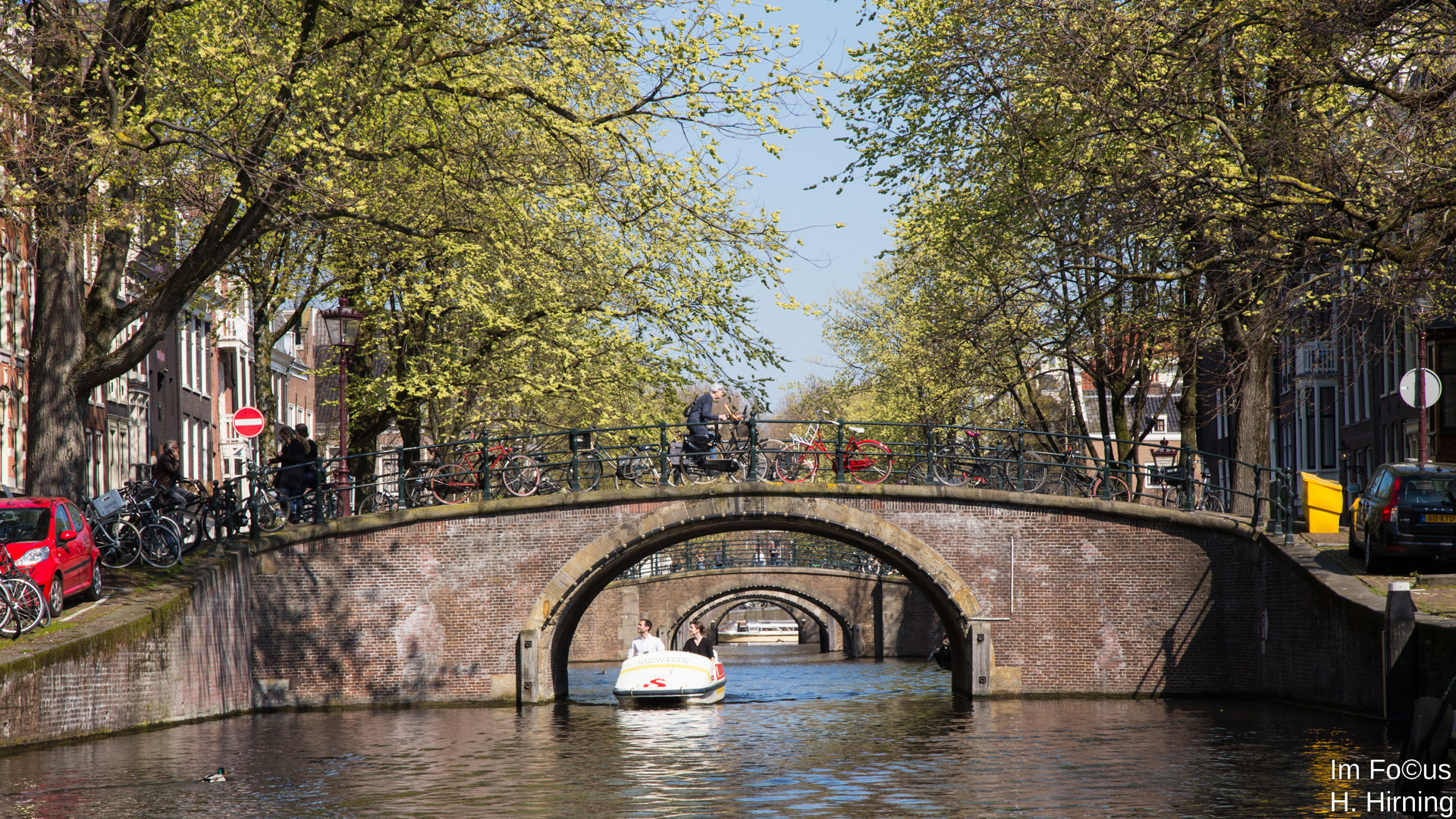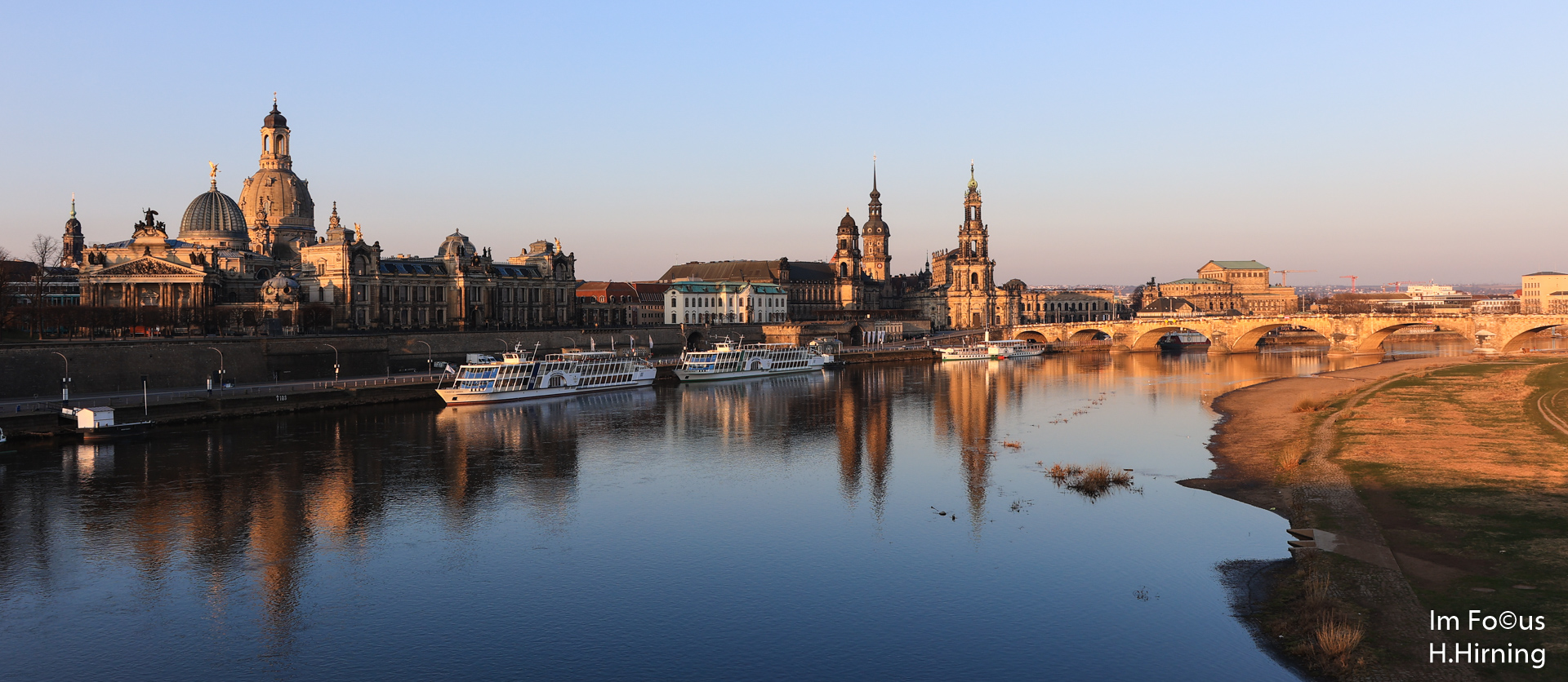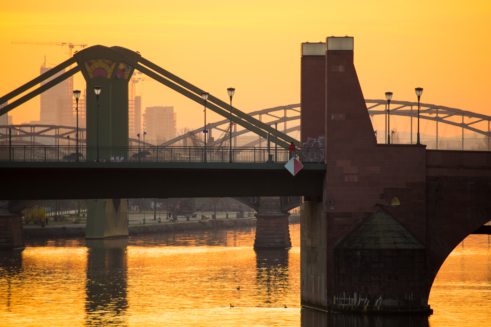 Mein heutiger Tag in Frankfurt begann am Mainkai. Morgens zur Goldenen Stunde genoss ich den Blick stromauf. Das Teleobjektiv verdichtete die Brücken zu einem fast unauflösbaren Dickicht. (Im Vordergrund die Alte Brücke, von der Ignatz-Bubis-Brücke sind nur die Pfeiler im Wasser und die Straßenlampen erkennbar, die Tragekonstruktion der Flö?erbrücke und die Bögen der Deutschherrnbrücke kommen dahinter).