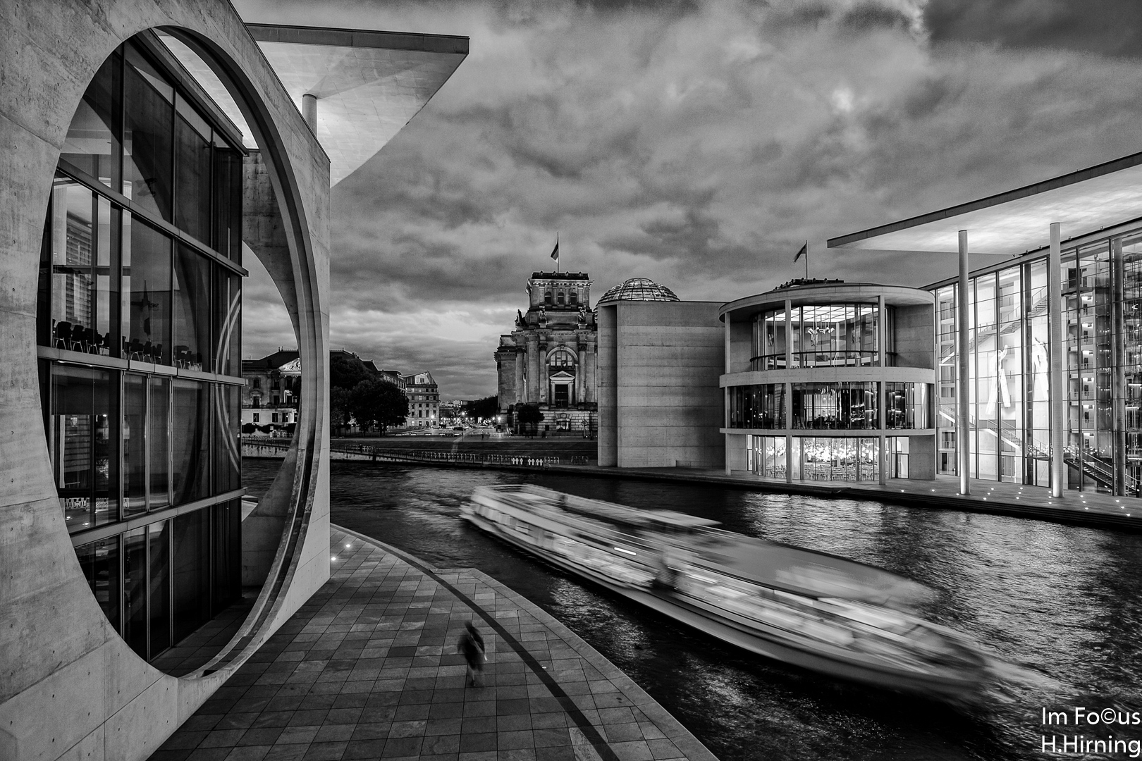 Zwei Bestandsgebäude und der 50 m hohe, wellenförmige Neubau bilden zusammen das Ensemble „Die Welle“. In der Passage zwischen den Gebäuden schlängelt sich ein künstlicher Bachlauf, der gerade jedoch gereinigt wurde. Auch hier wurde ich sofort von der Security in Empfang genommen. Als Hobbyfotograf durfte ich jedoch ungehindert zur Tat schreiten.