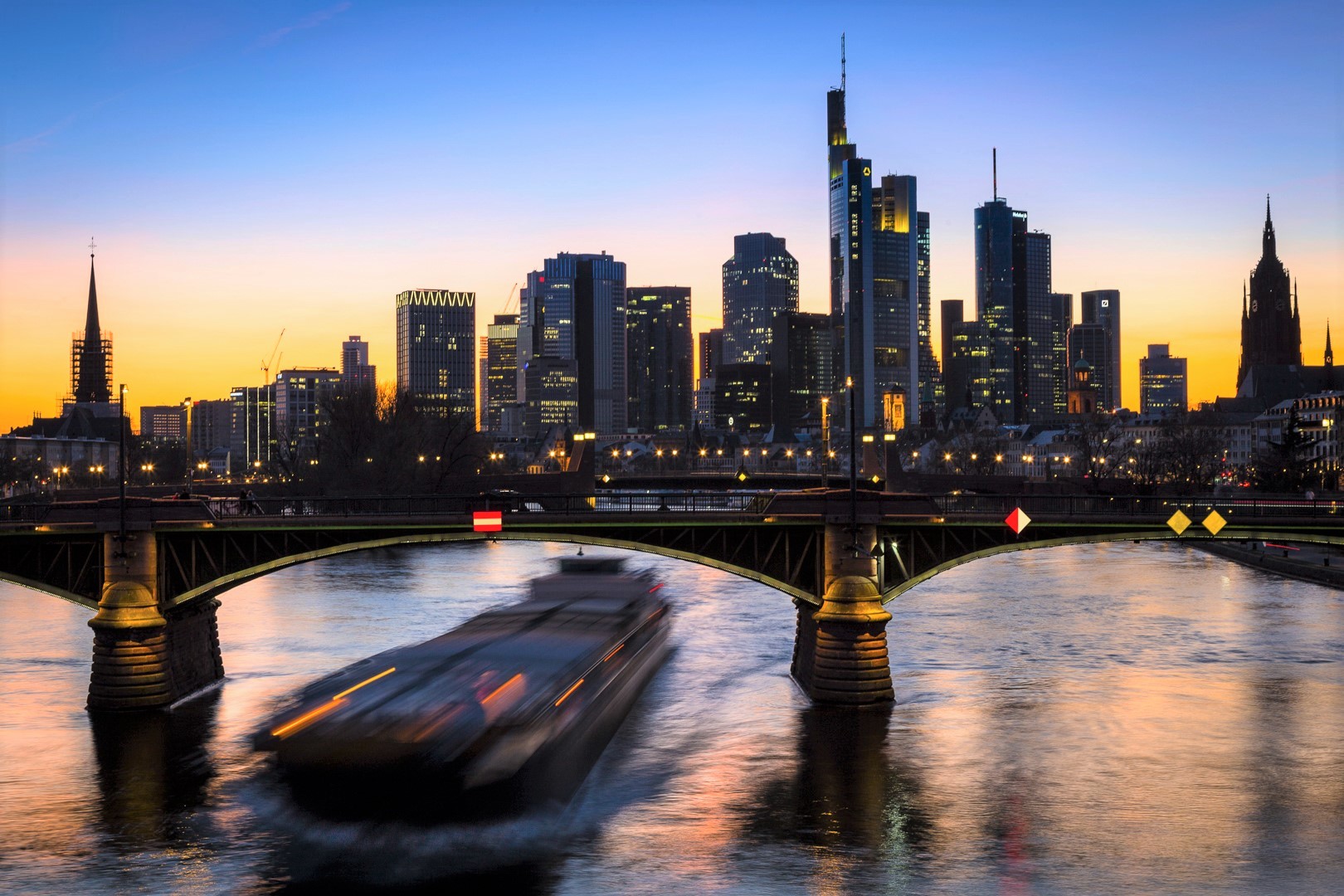 Am Frankfurter Ostend überragt das Hochhaus der Europäischen Zentralbank (EZB) die 9-stöckigen Wohnhausneubauten um Längen. Während sich am Westend die zahlreichen Türme der Geschäftsbanken gegenseitig den Rang streitig machen, dominiert der 201 m hohe Doppelturm der EZB hier im Osten unangefochten den gesamten Stadtteil. Die nachfolgende Aufnahme zeigt den Blick von der Flößerbrücke mainaufwärts kurz nach Sonnenuntergang.