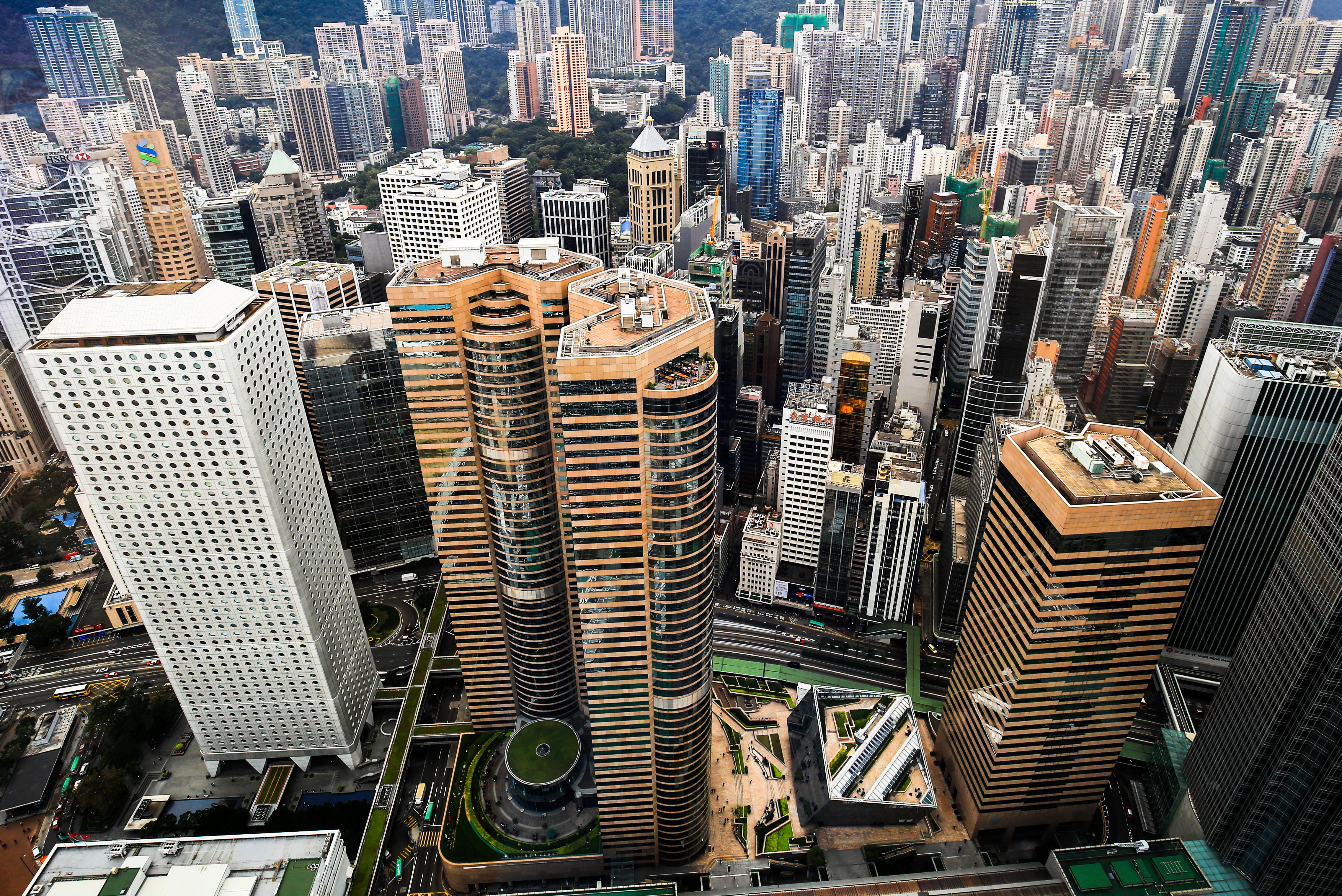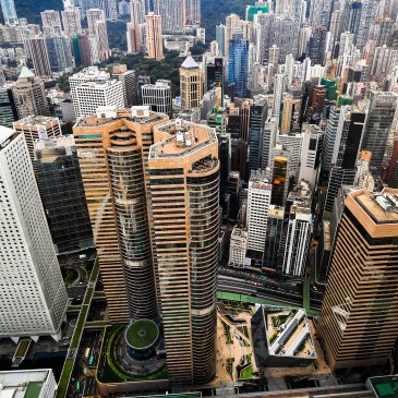 Im Zick Zack schlängelte ich mich durchs Bankenviertel. Dank Corona kam ich natürlich weder in ein Gebäude, noch auf eine Aussichtsplattform, auch nicht am Main Tower. Die beiden nächsten Bilder stammen von der Bank of Communications. Das erste Bild zeigt einen Ausschnitt der Hochhausfassade. Die ursprüngliche Hochformataufnahme wurde gespiegelt und zu einem Bild zusammengesetzt.