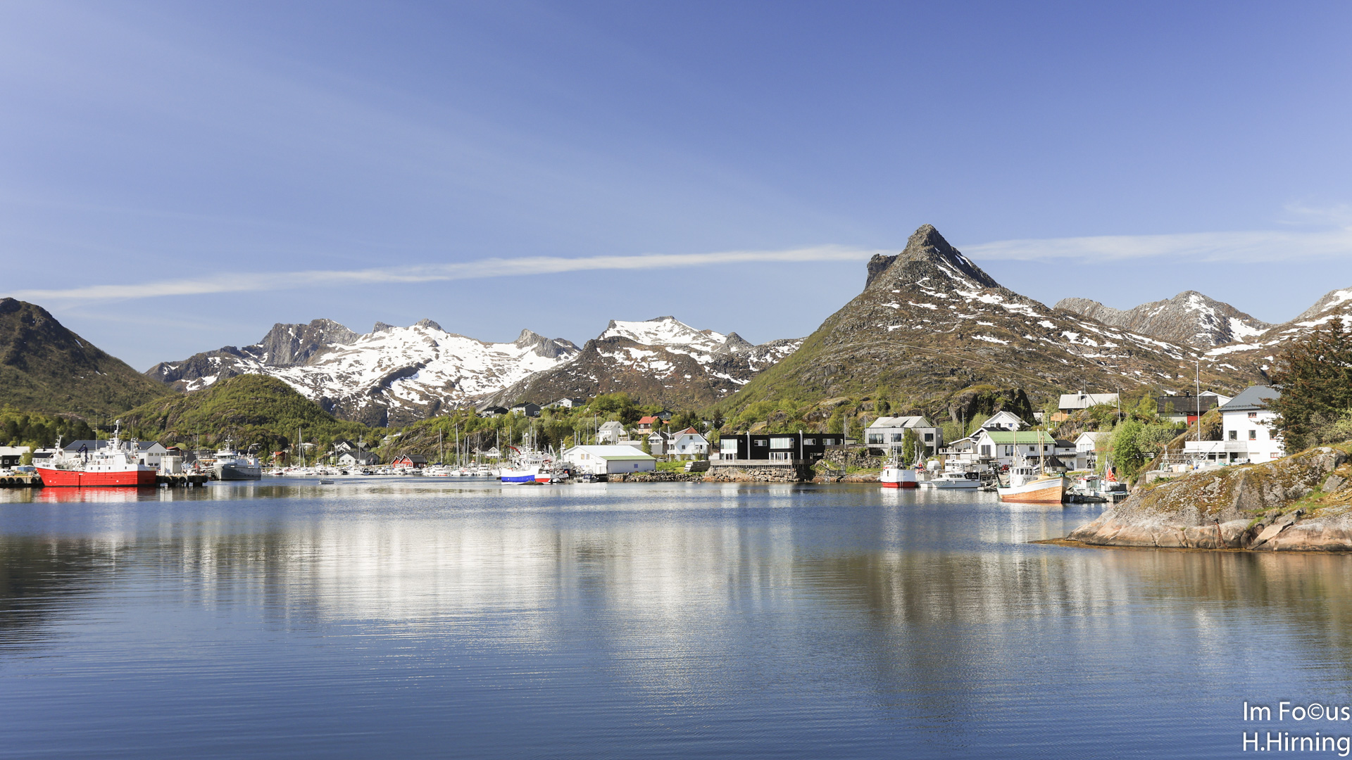 Unten: Der Blick vom Reinehalsen auf Reine.