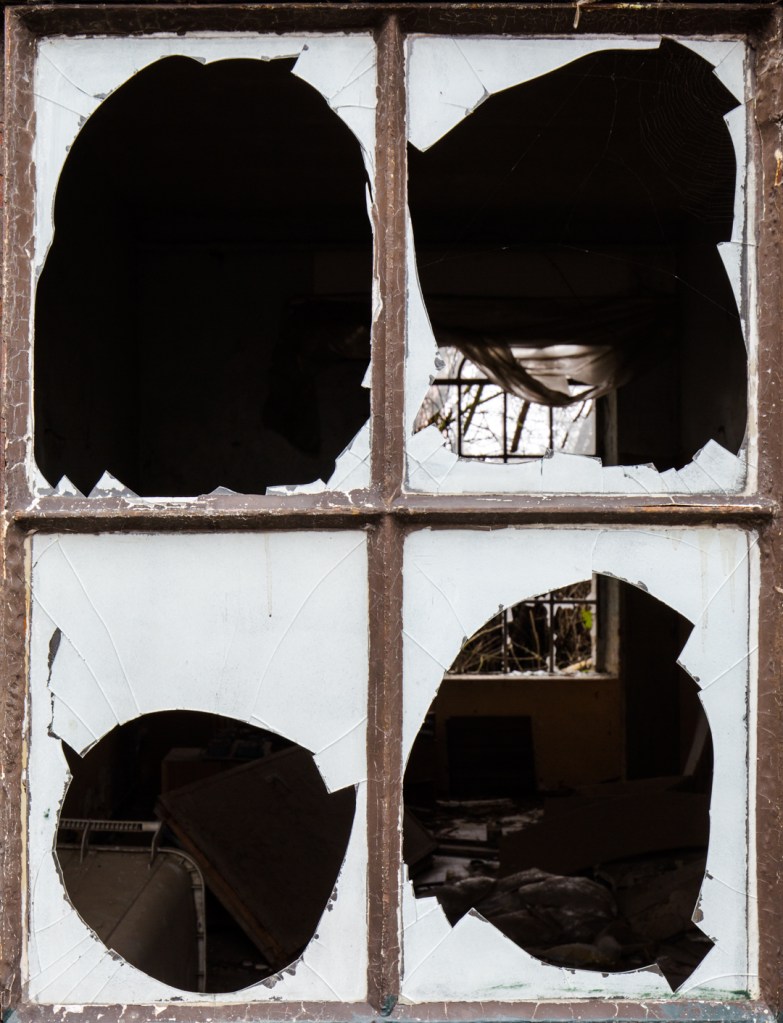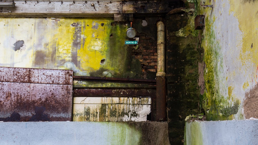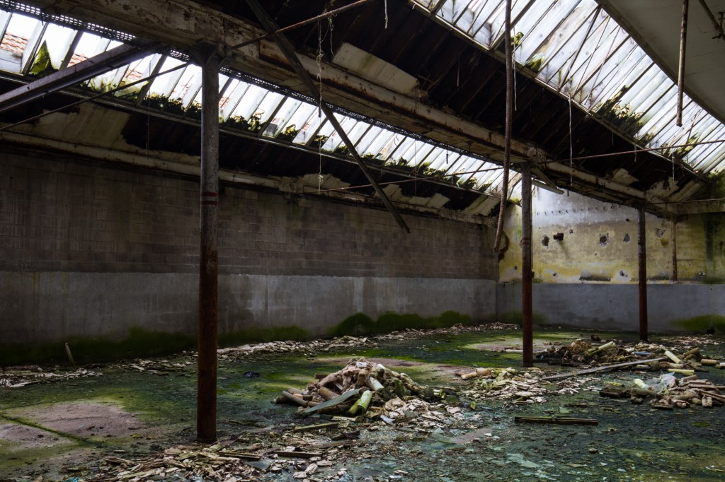 Auf der rechten Seite des Platzes standen ausgedehnte Fabrikationshallen – alle baufällig. Die Dächer waren undicht und zum Teil bereits eingefallen. Die Isolation hing tropfnass von der Decke. Bruchstücke der Sheddachverglasung warteten in ihren Rahmen geduldig auf den geringsten Anlass, herunterfallen zu dürfen. Veralgte und vermooste Böden, blühende Wände, zurückgelassene Tonnen und andere Behältnisse bildeten die einzigen Farbtupfer.