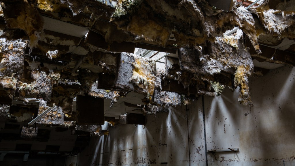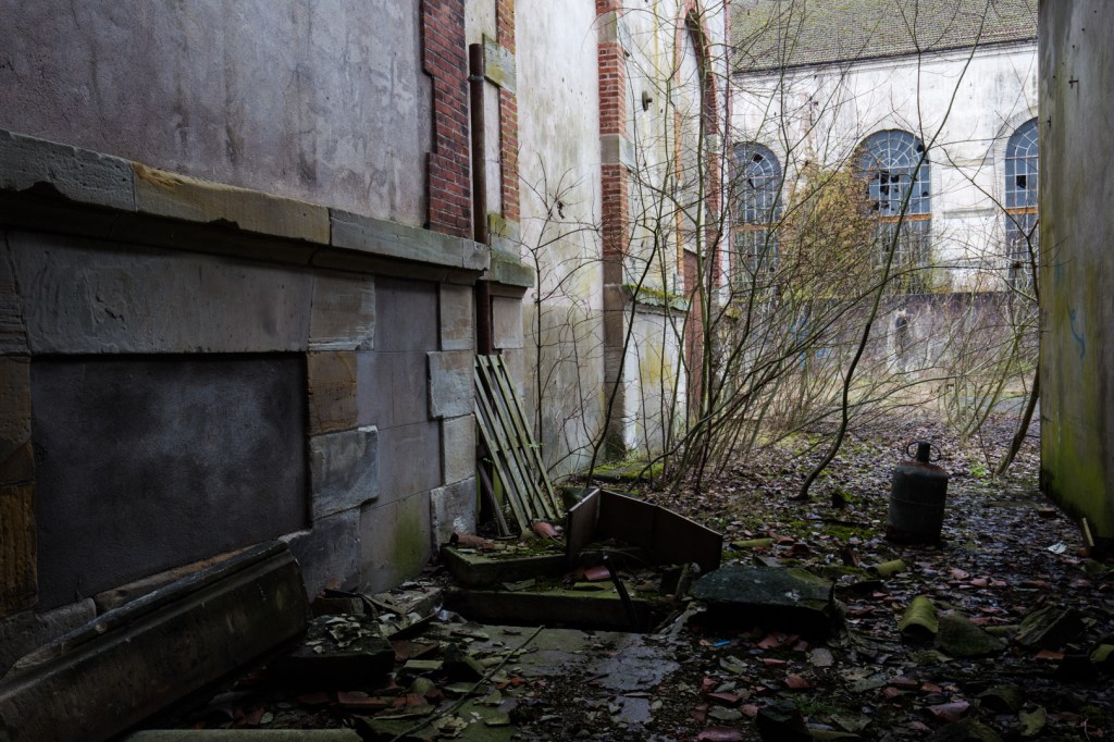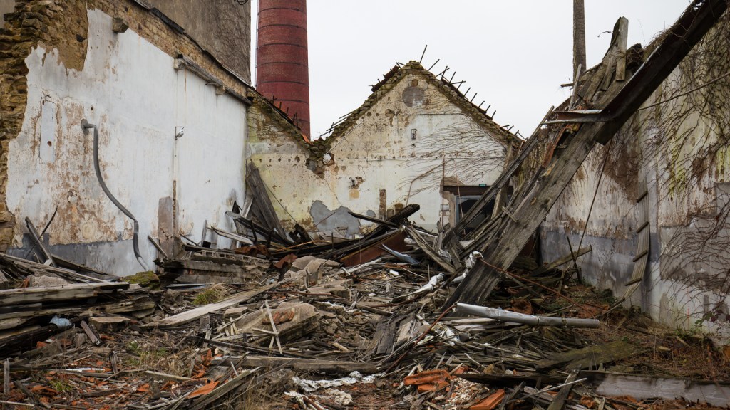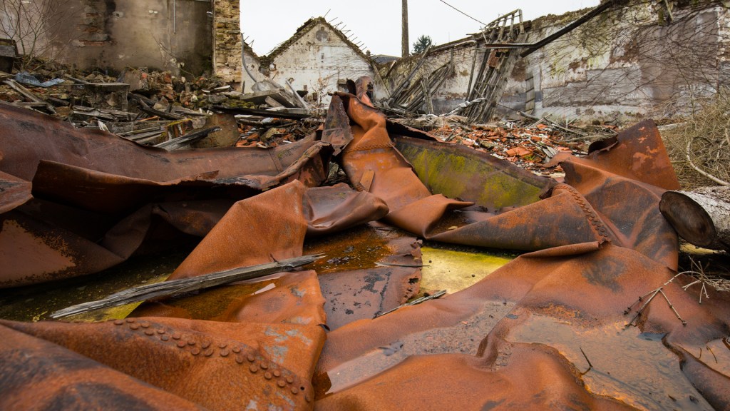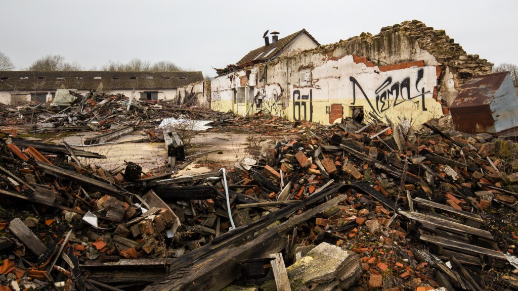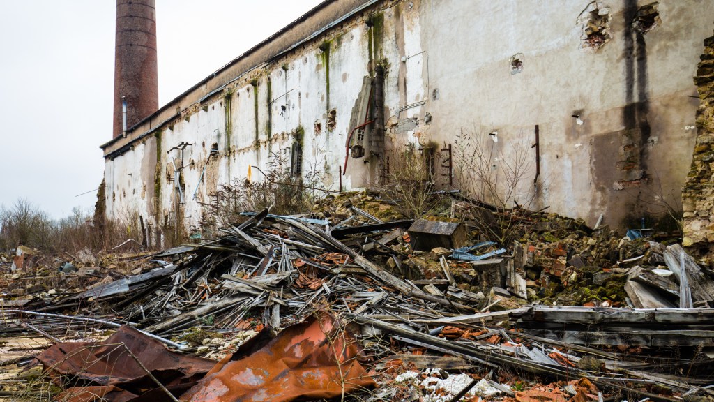 Jenseits des Kraftwerks lag eine riesige Fläche. Von Gebäuden und Gebäuderesten umrahmt, türmte sich auf dem Gelände ein Schuttberg am anderen. Häuser und Hallen waren eingestürtzt und der Schutt nur notdürftig zusammengeschoben. Doch auch das dürfte bereits vor etlichen Jahren passiert sein. Seitdem gammelt alles vor sich hin.