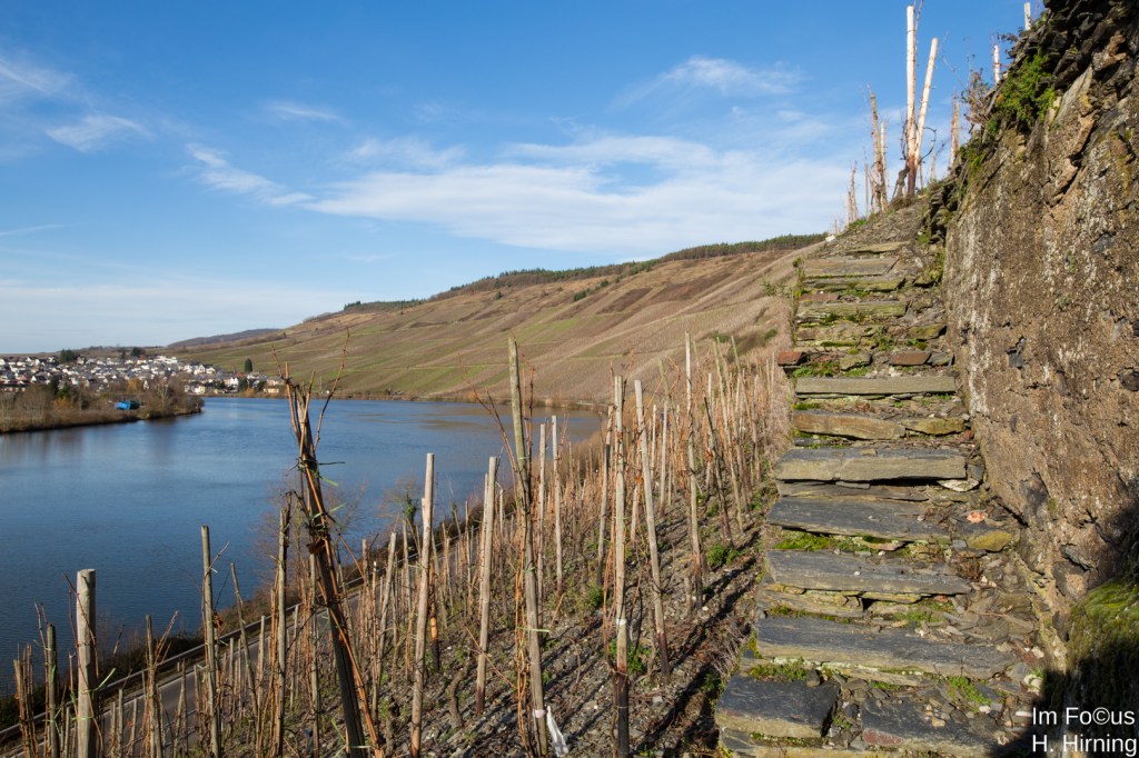 Hinter Trier gräbt sich die Mosel zwischen Hunsrück und Eifel tief ins Rheinische Schiefergebirge ein und bildet so die bekannten moseler Steillagen, die zum Weinbau genutzt werden. Die nachfolgenden Aufnahmen entstanden zwischen Mehring und Pölich sowie