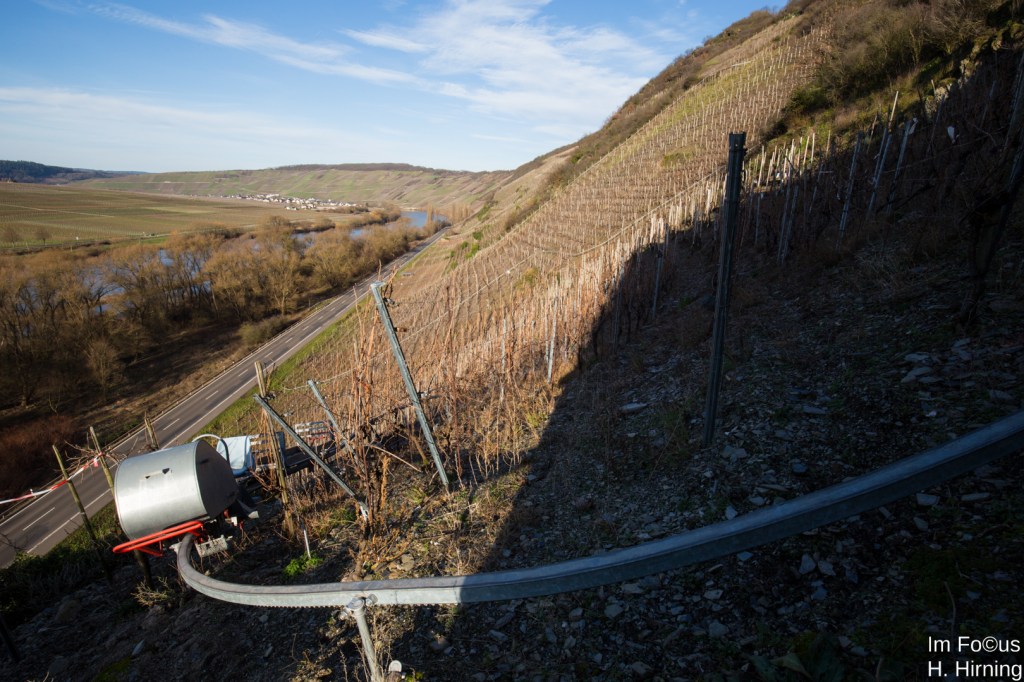 zwischen Klüsserath und Trittenheim. Zur Erleichterung der beschwerlichen Arbeit in den steilen Hanglagen haben sich derartige Schrägaufzüge durchgesetzt.